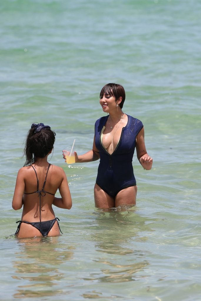 Jackie Cruz exibe seu corpo notável em um maiô enquanto passa um dia divertido na Miami Beach com seus amigos, 17/06/2018. A atriz de ‘Orange is the New Black’ estava incrível em um body de neoprene azul marinho aberto e decotado da Duskii.