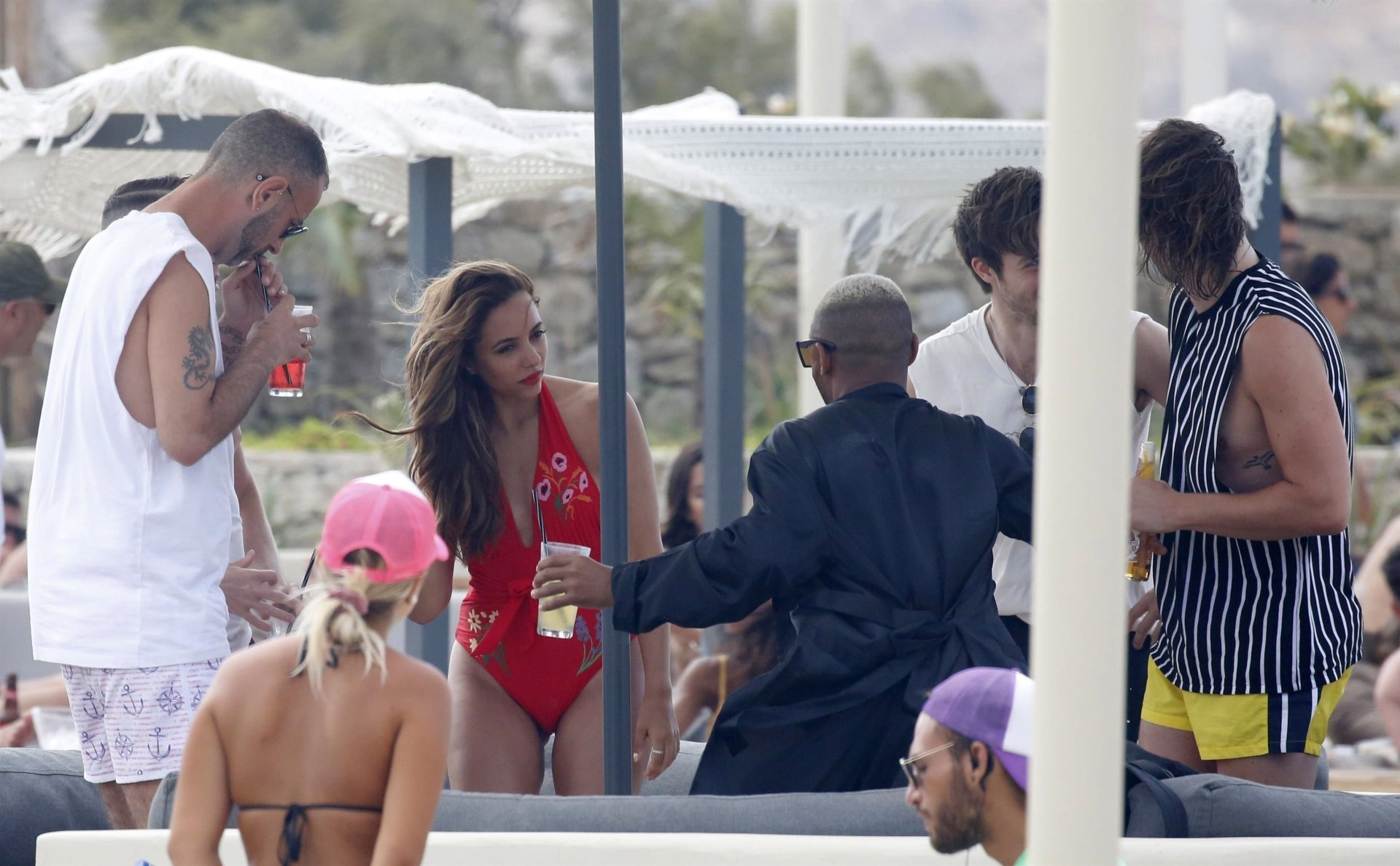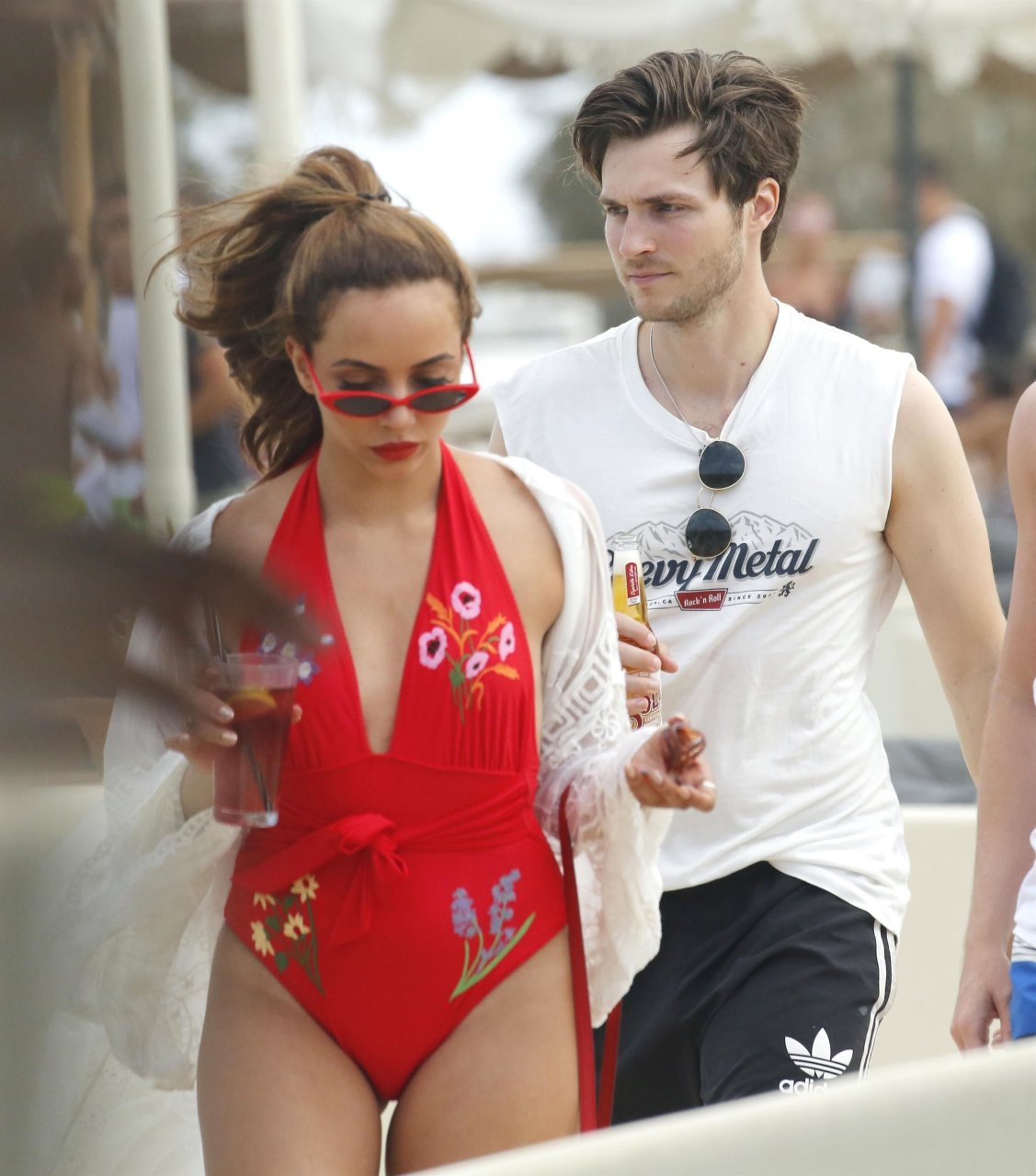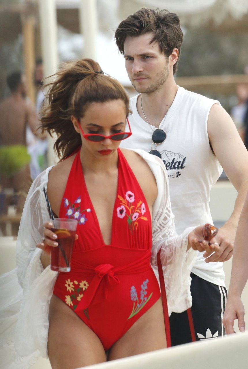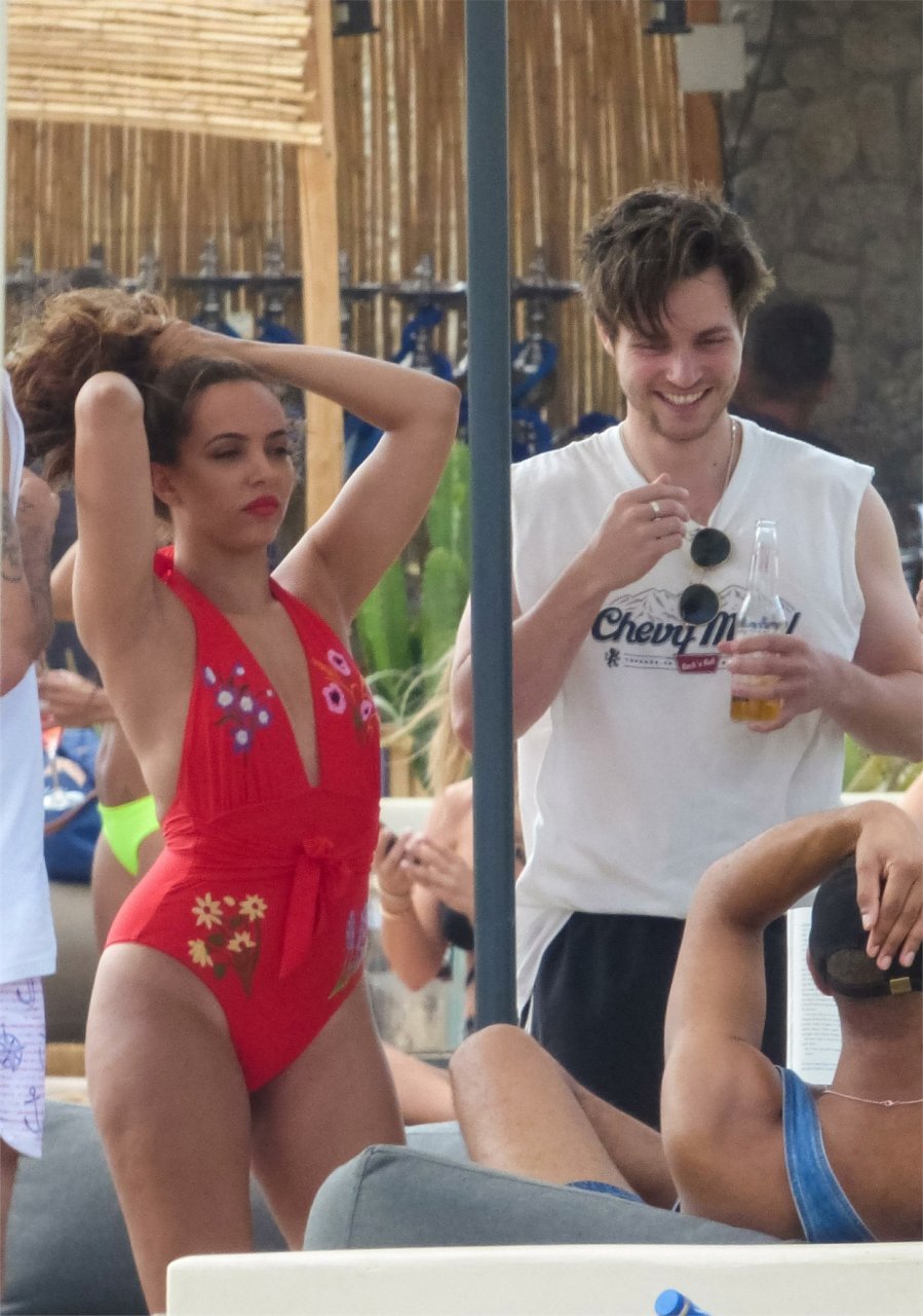 Curvilínea Jade Thirlwall foi vista com um maiô vermelho enquanto ia a um bar de praia com seu namorado Jed Elliott em Mykonos, Grécia, 04/08/2018. Jade Amelia Thirlwall é uma cantora britânica de 25 anos (Little Mix), dançarina e estrela de TV.