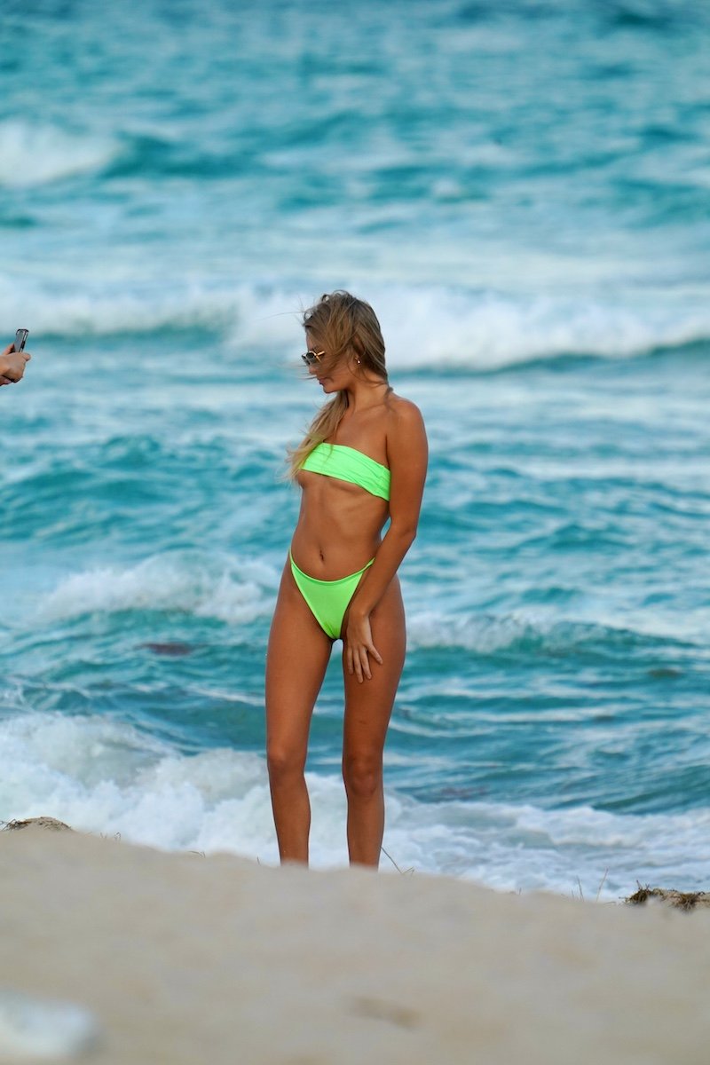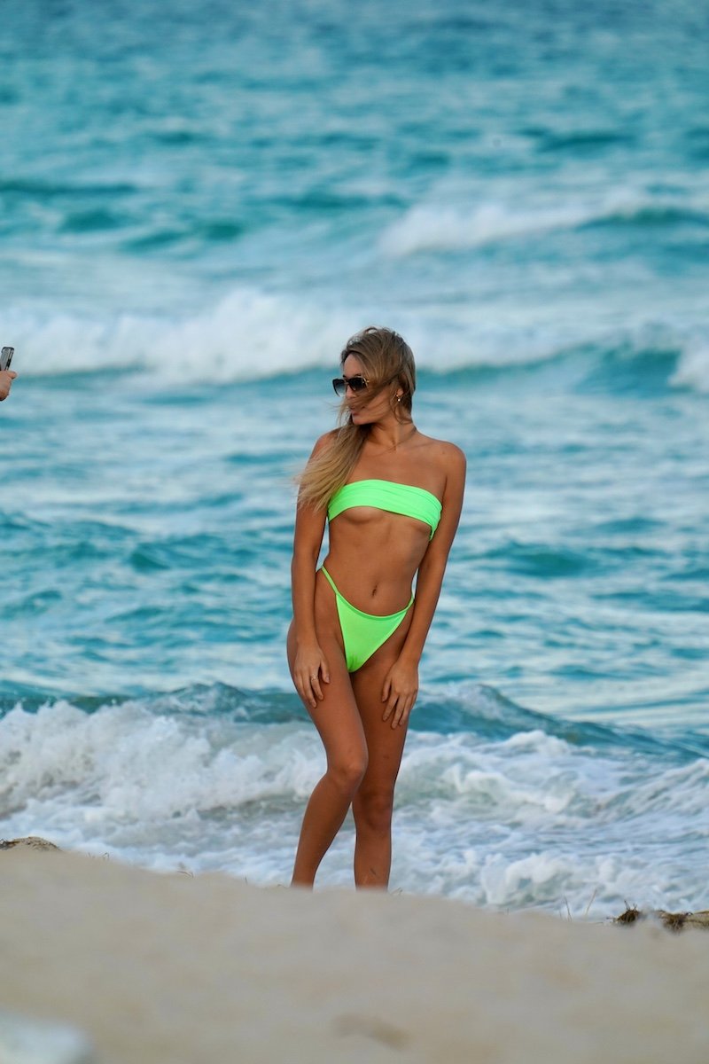 Modelo americana Jaida Huston em um biquíni verde bandeau da PrettyLittleThing em um ensaio fotográfico em Miami Beach, 11/12/2019.