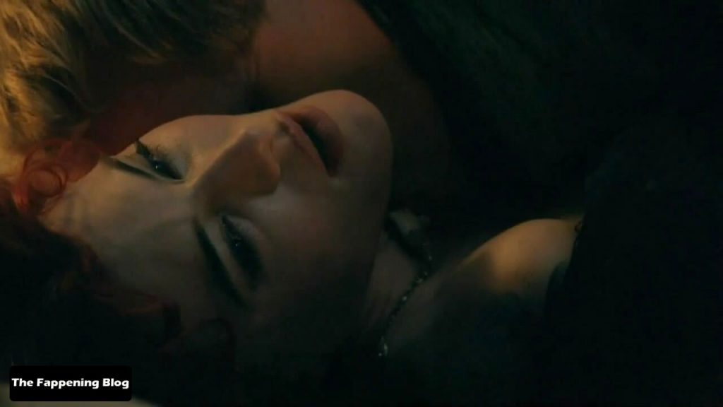 Jaime Murray está sentada enquanto um homem fica atrás dela e desabotoa seu vestido, expondo seu seio esquerdo, colocando a mão para apertá-lo antes de beijá-la e deitá-la para fazer sexo com ela.