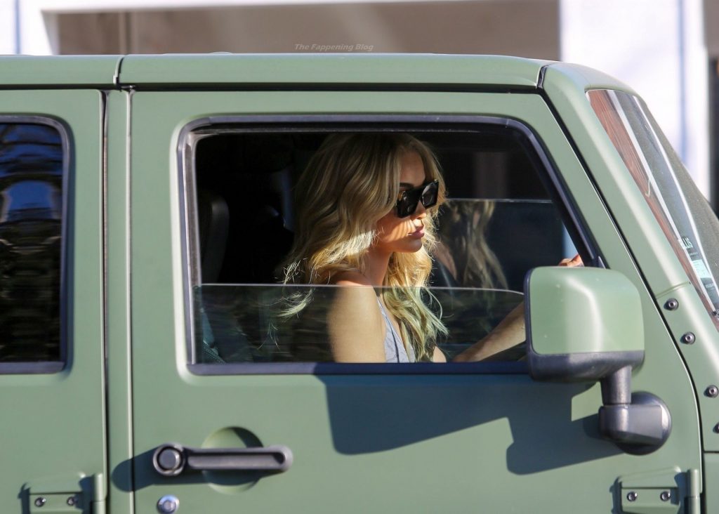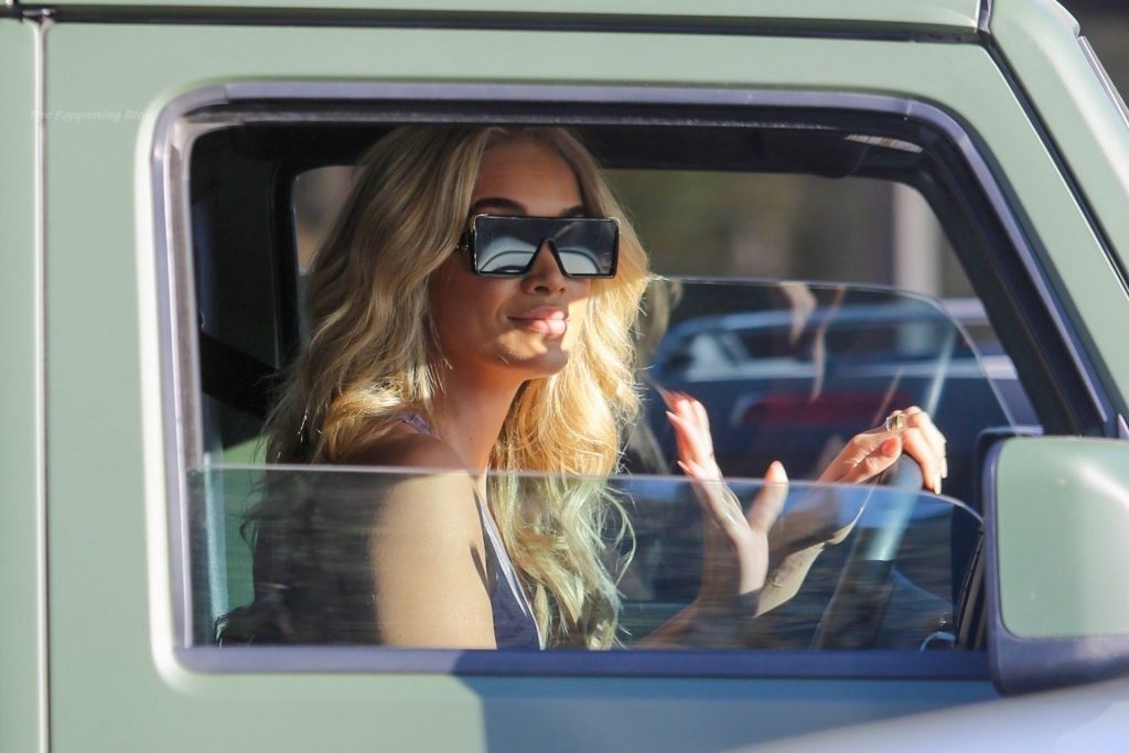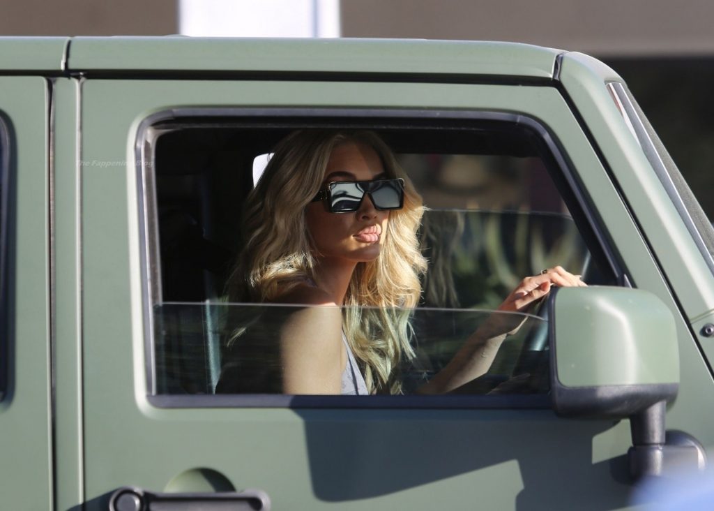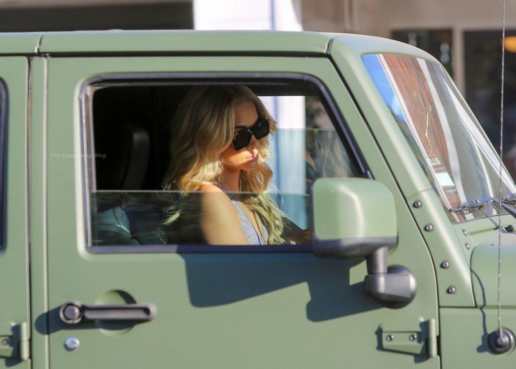 Jasmine Sanders faz seu cabelo no Salon Zogalis em Bel Air, 23/03/2021. A modelo germano-americana e influenciadora de moda exibe sua barriga tonificada com um top esportivo e leggings enquanto sai do salão em seu Jeep verde exército.