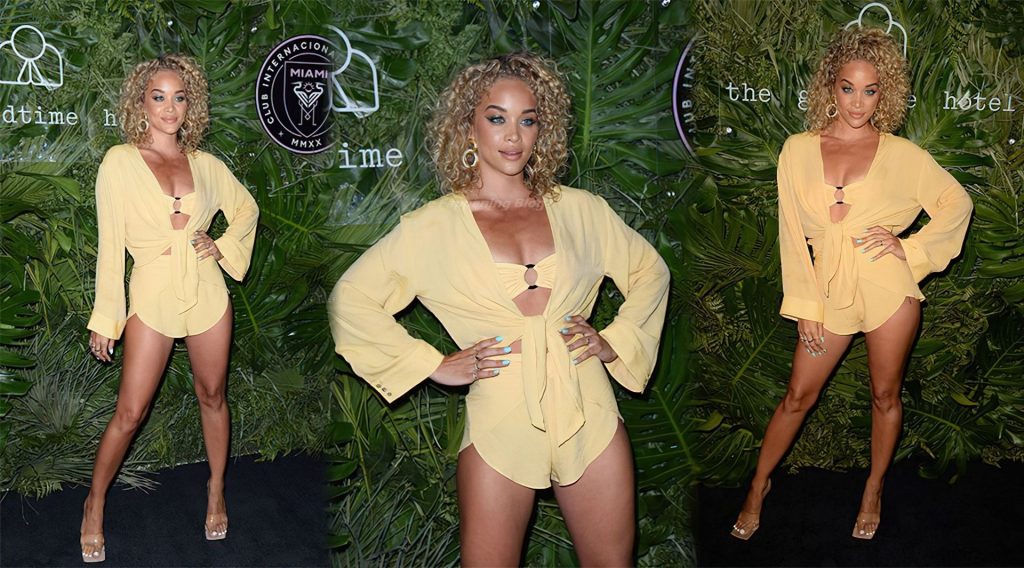 A modelo Jasmine Sanders usou um shortinho que colocou suas pernas impressionantemente esculpidas em plena exibição para a festa.