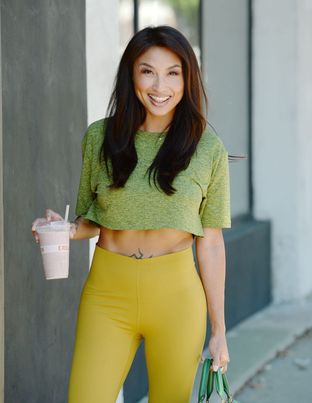 Apresentadora de TV americana Jeannie Mai (41) exibe seu sorriso bonito e abdômen definido ao chegar no estúdio de dança em Los Angeles, 15/10/2020.