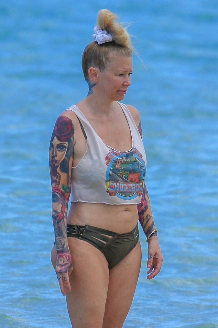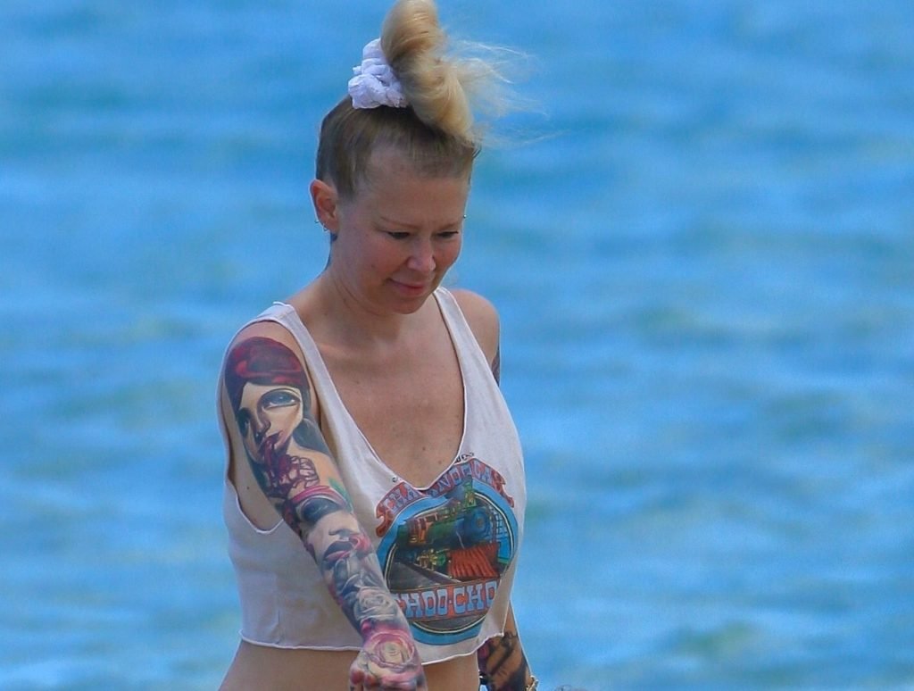 Um exemplo claro de como tatuagens ficam feias em uma mulher mais velha, deveriam mostrar esta foto para essas garotas estúpidas que escolhem estragar seus corpos