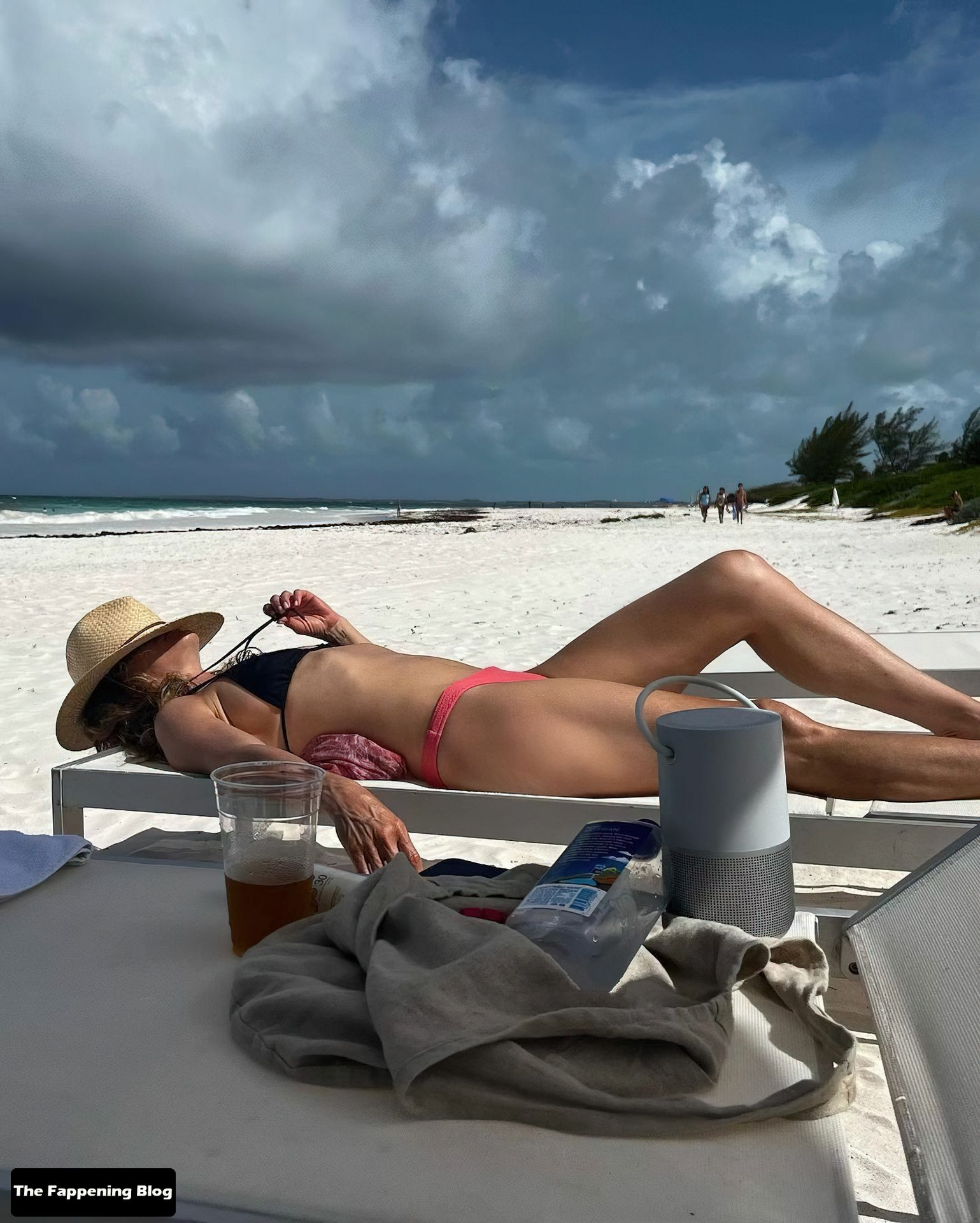Atriz Jennifer Aniston aproveita um dia ensolarado na praia e mostra sua bela figura de biquíni.