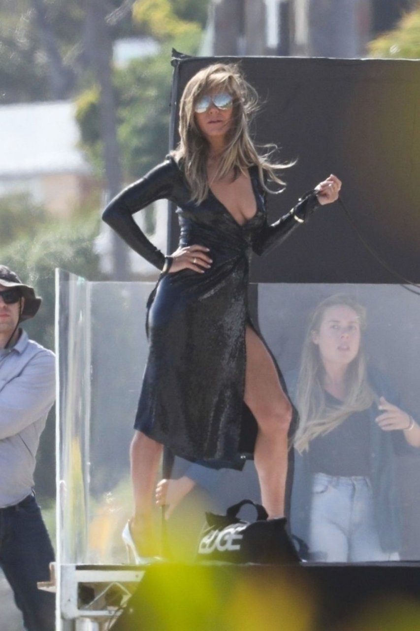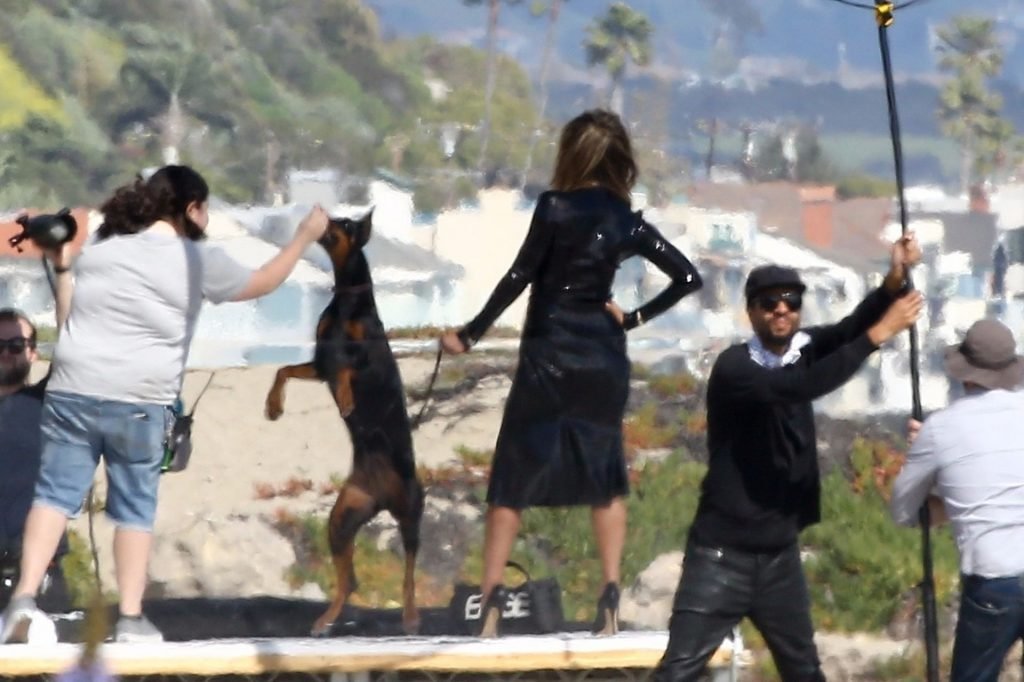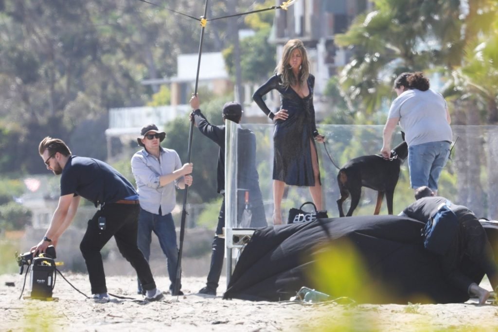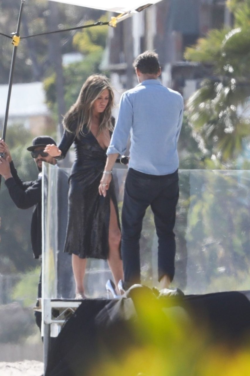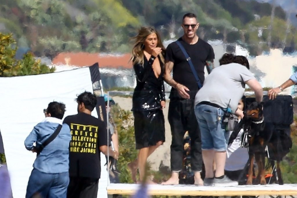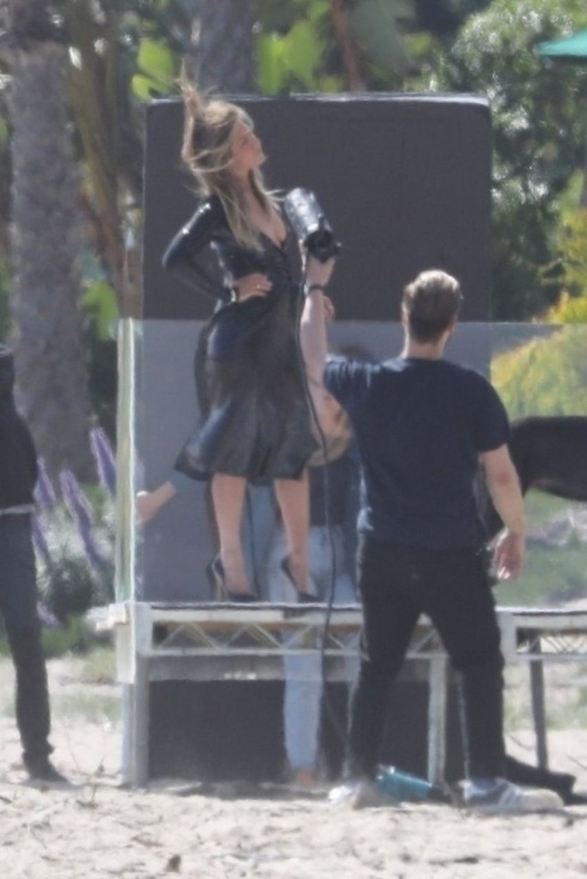 Jennifer Aniston posa para um ensaio fotográfico sexy na praia em Malibu, 27/03/2019. Aniston posou com um cachorro usando um vestido preto de látex provocante com decote profundo antes de vestir um vestido preto diferente, que também apresentava um decote profundo.