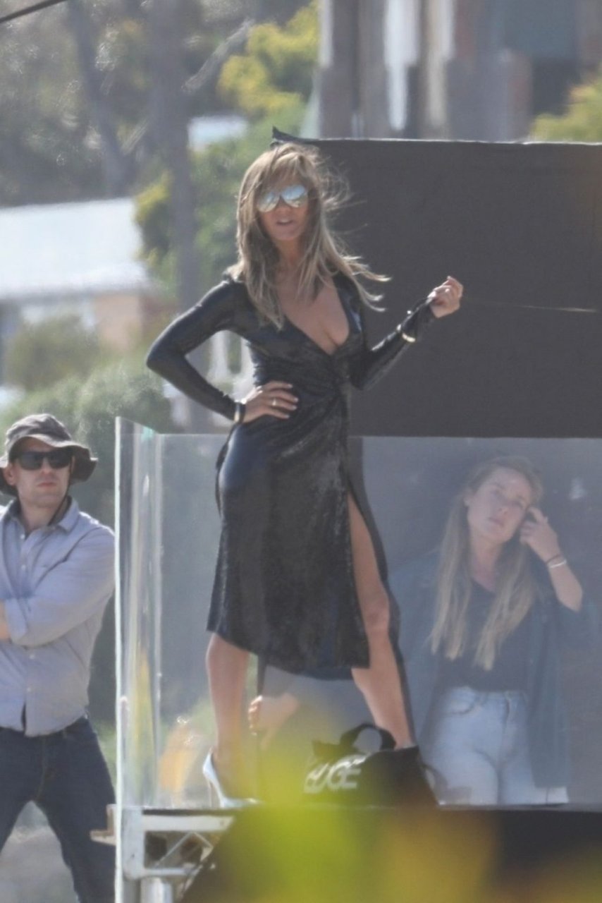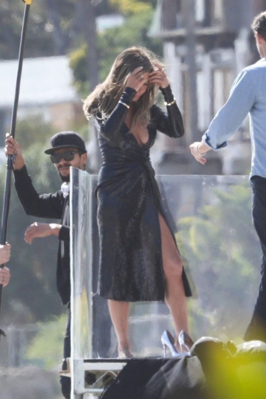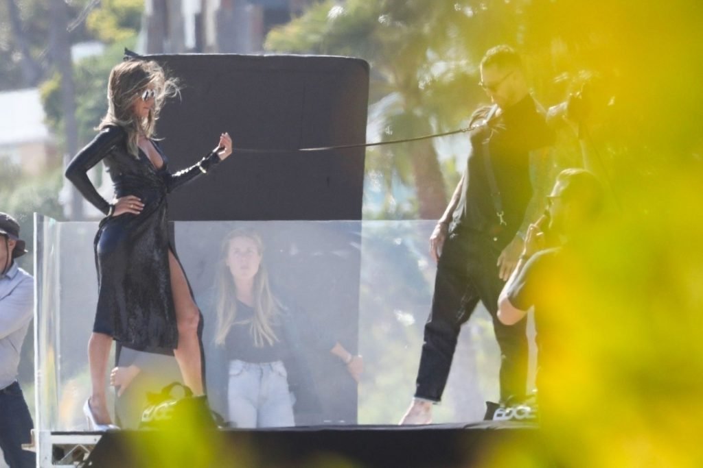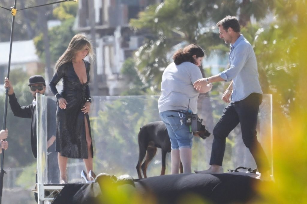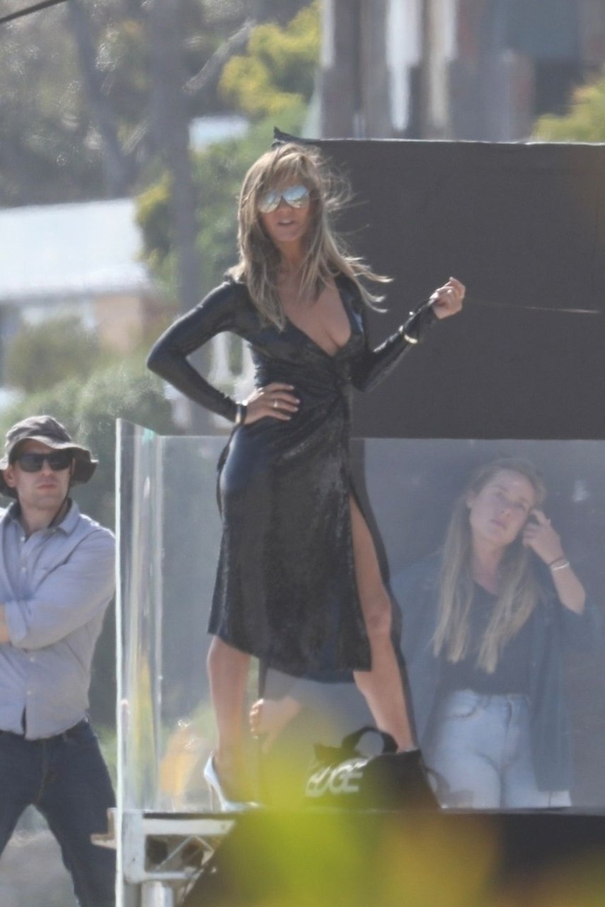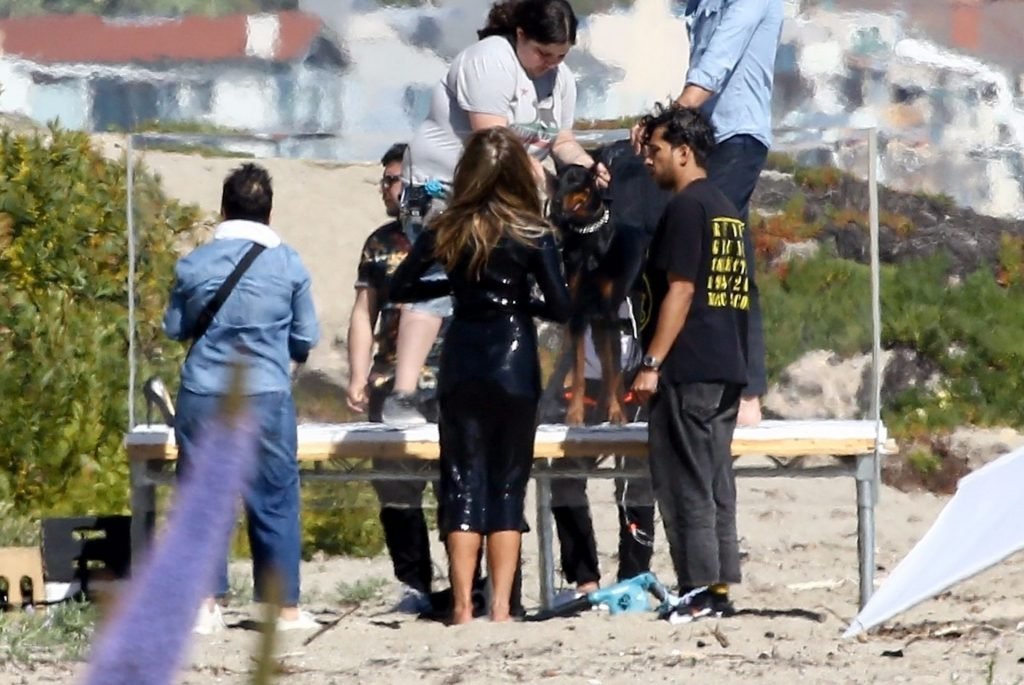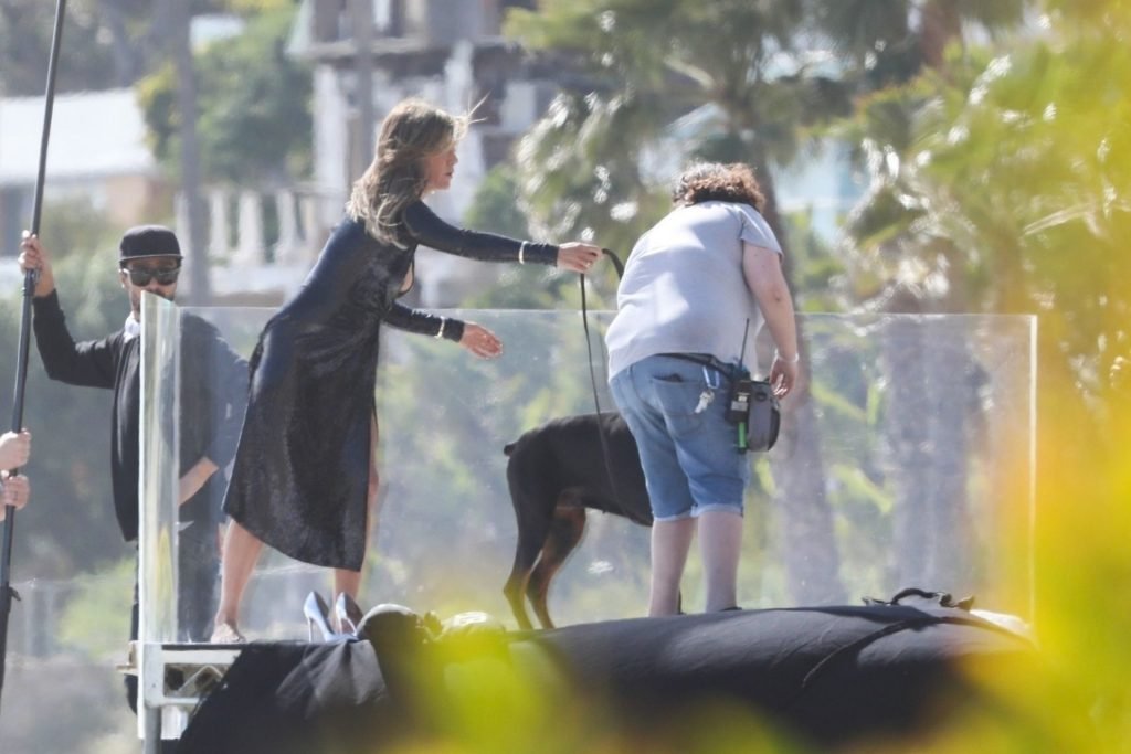 Jennifer Aniston posa para um ensaio fotográfico sexy na praia em Malibu, 27/03/2019. Aniston posou com um cachorro usando um vestido preto de látex provocante com decote profundo antes de vestir um vestido preto diferente, que também apresentava um decote profundo.