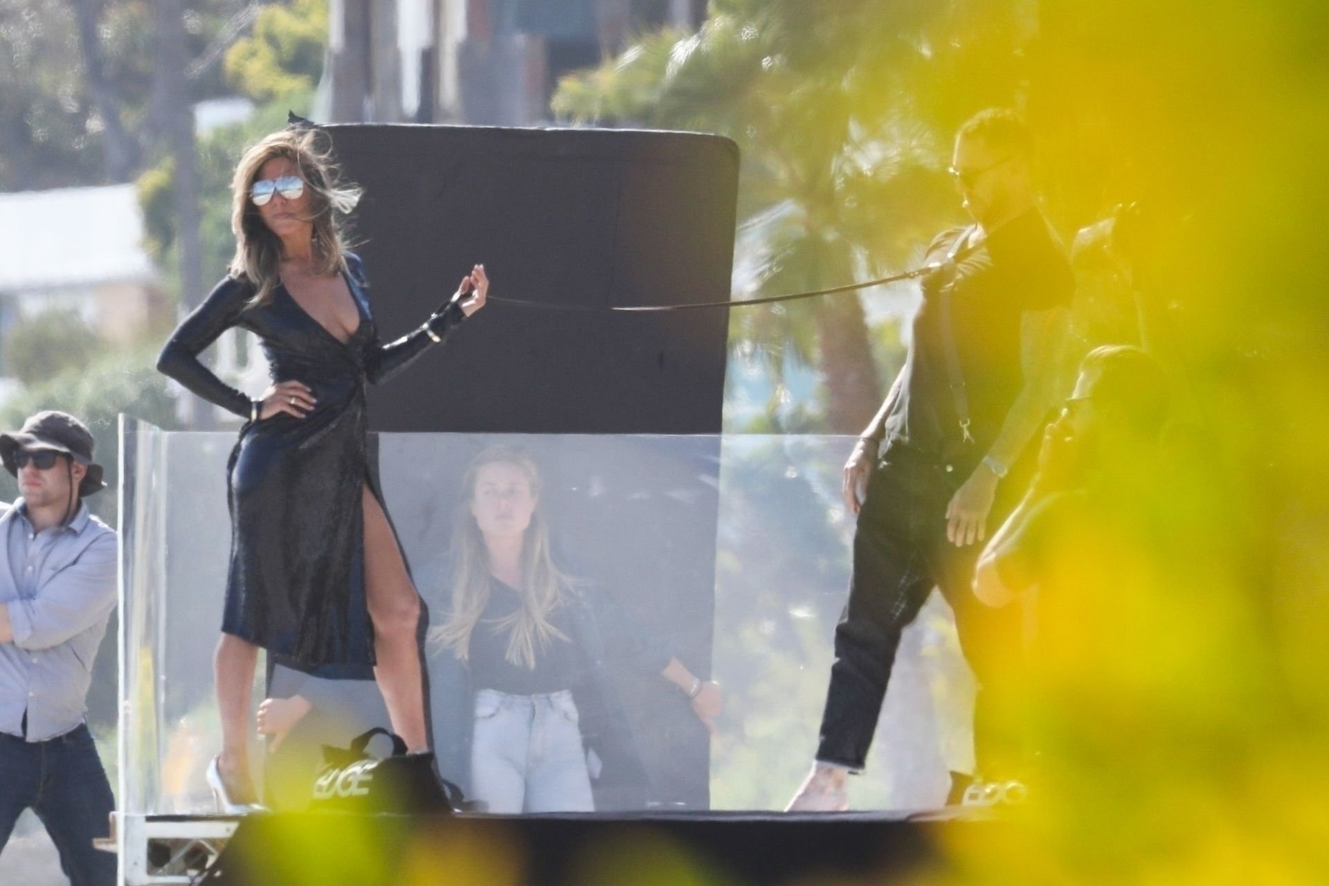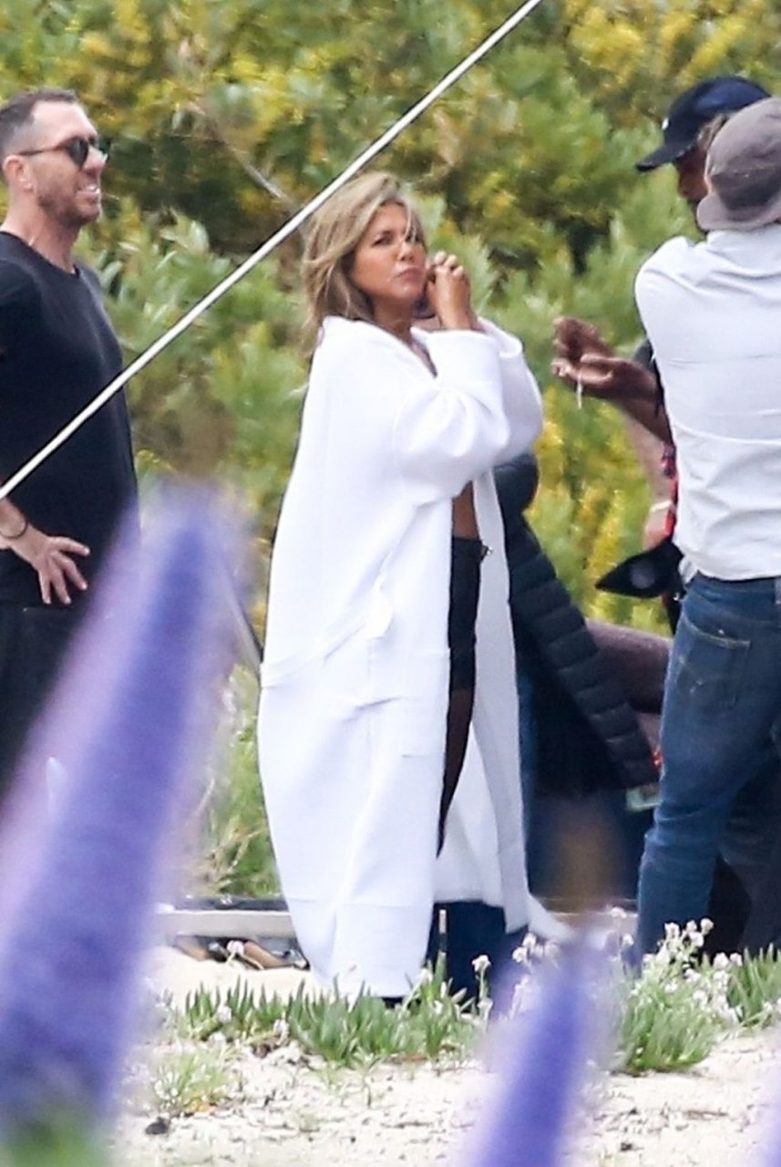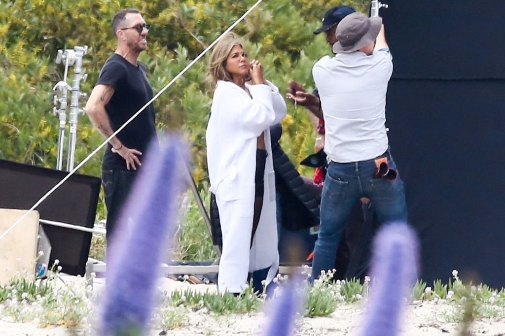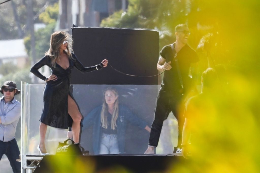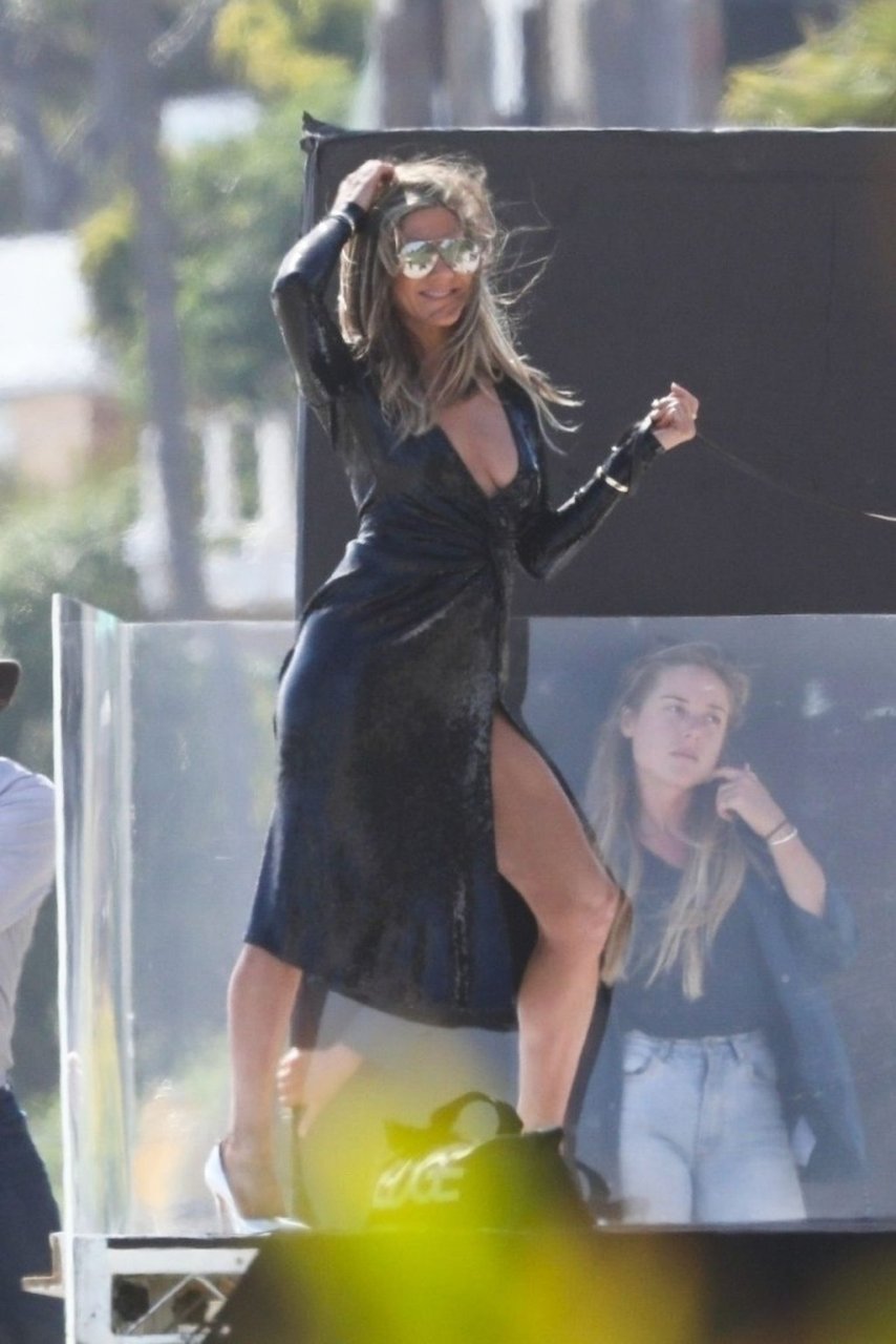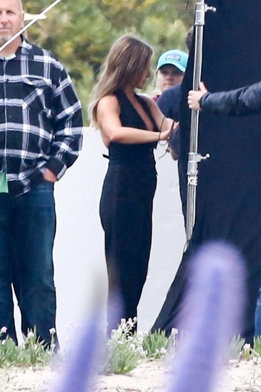 Jennifer Aniston posa para um ensaio fotográfico sexy na praia em Malibu, 27/03/2019. Aniston posou com um cachorro usando um vestido preto de látex provocante com decote profundo antes de vestir um vestido preto diferente, que também apresentava um decote profundo.