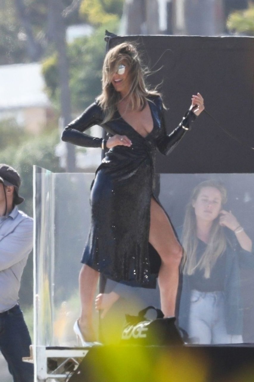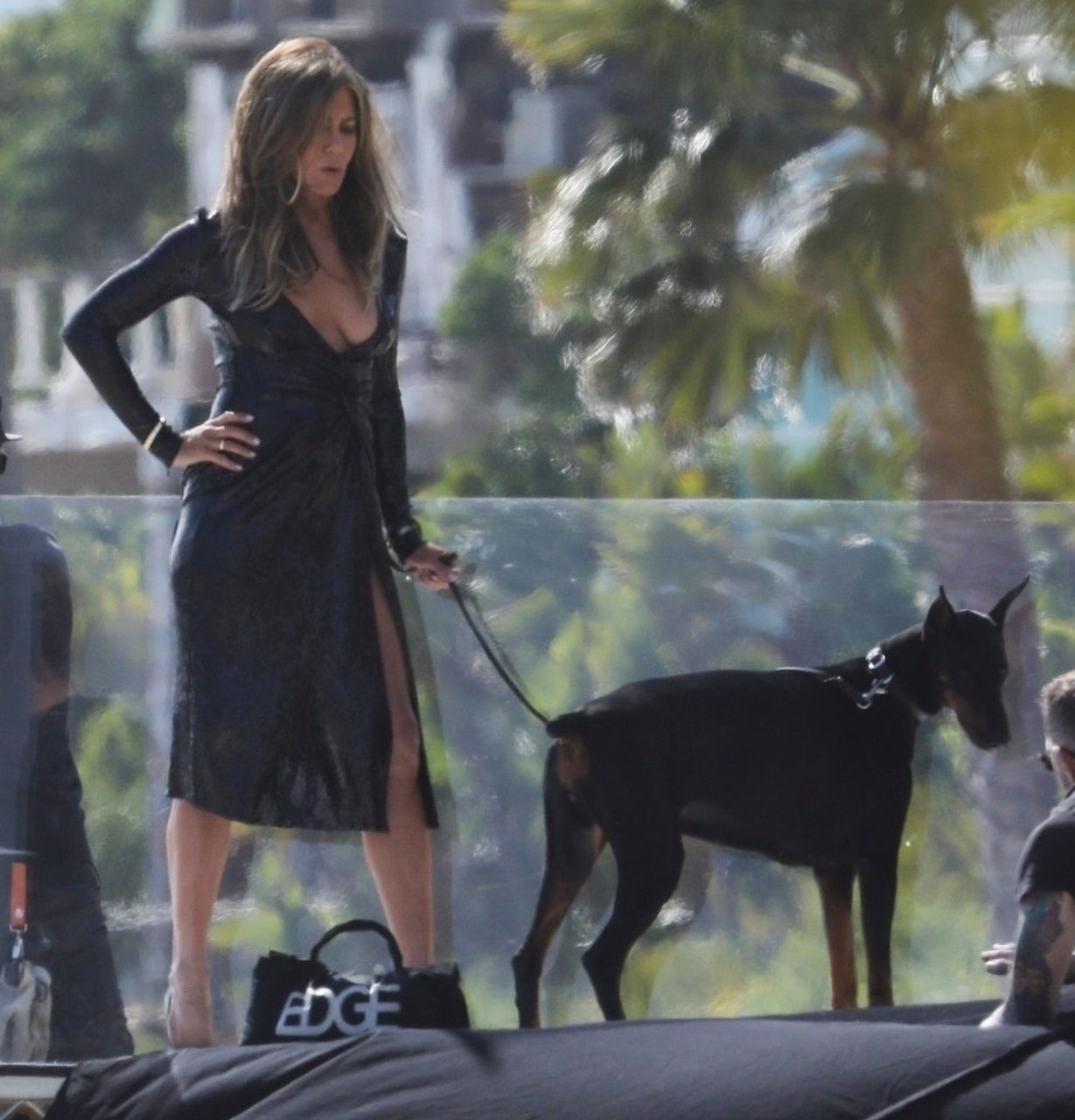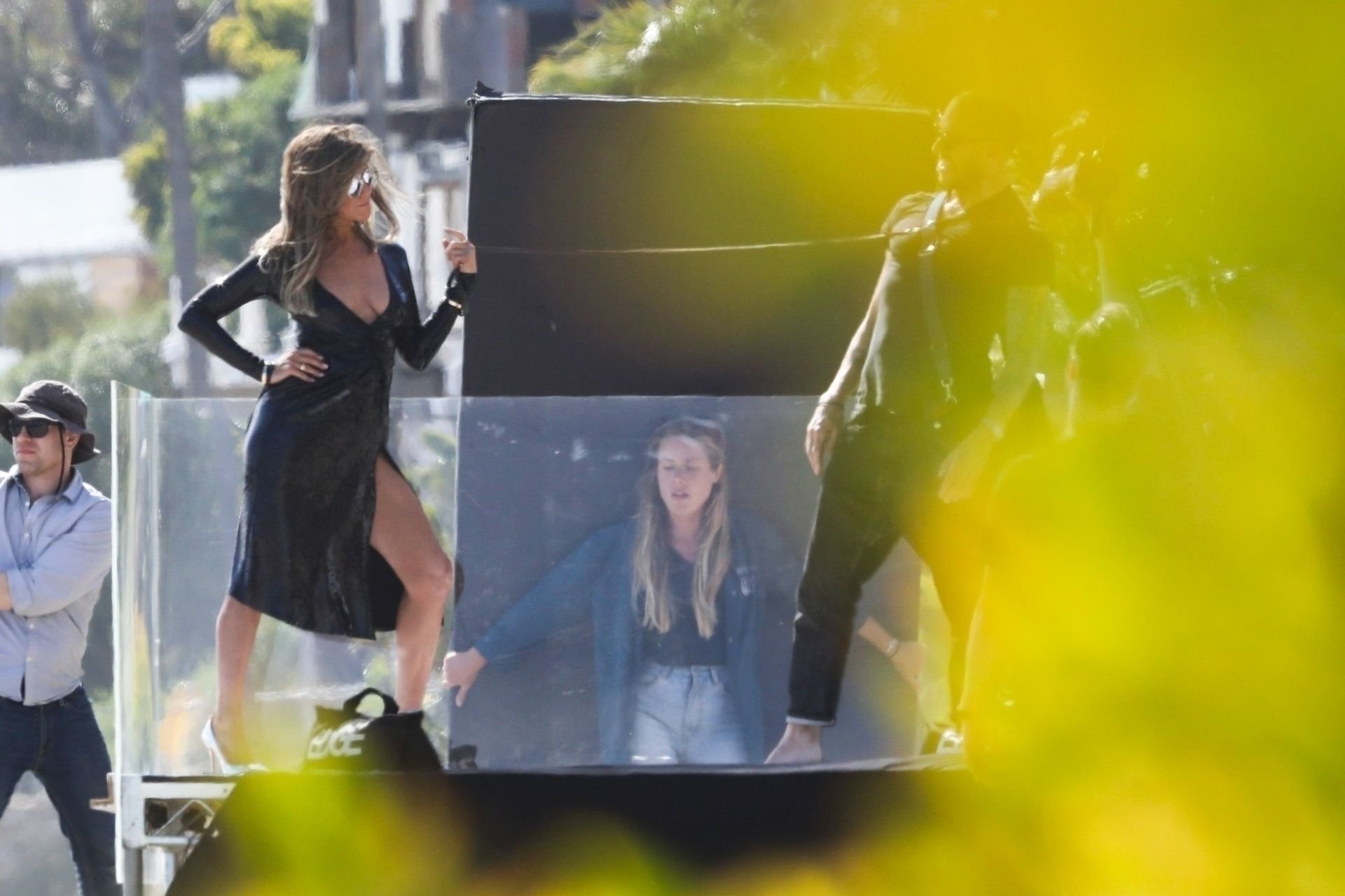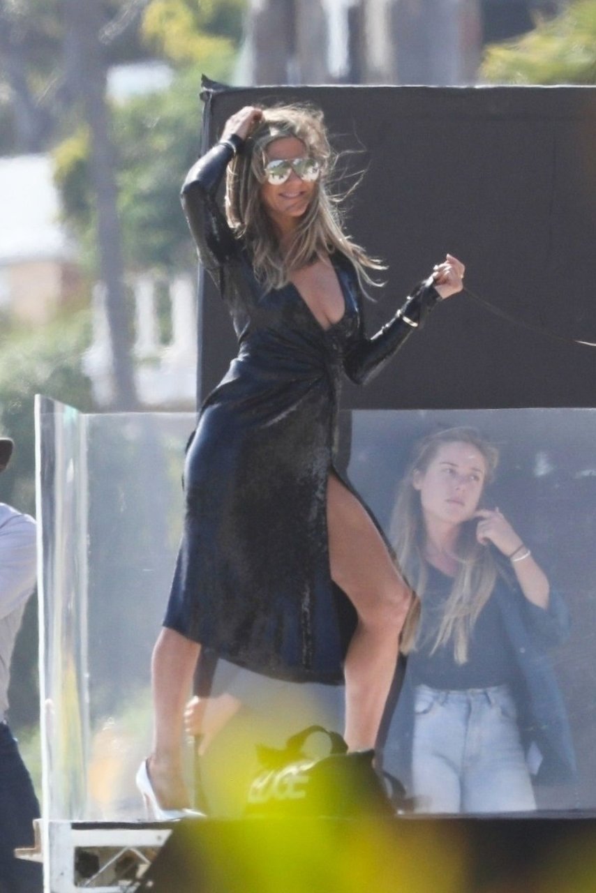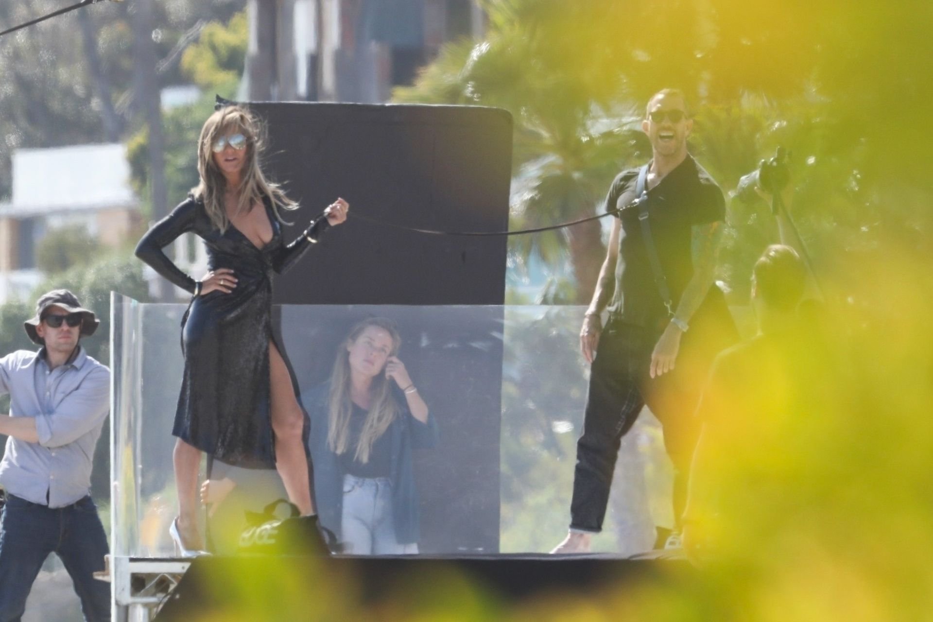 Jennifer Aniston posa para um ensaio fotográfico sexy na praia em Malibu, 27/03/2019. Aniston posou com um cachorro usando um vestido preto de látex provocante com decote profundo antes de vestir um vestido preto diferente, que também apresentava um decote profundo.