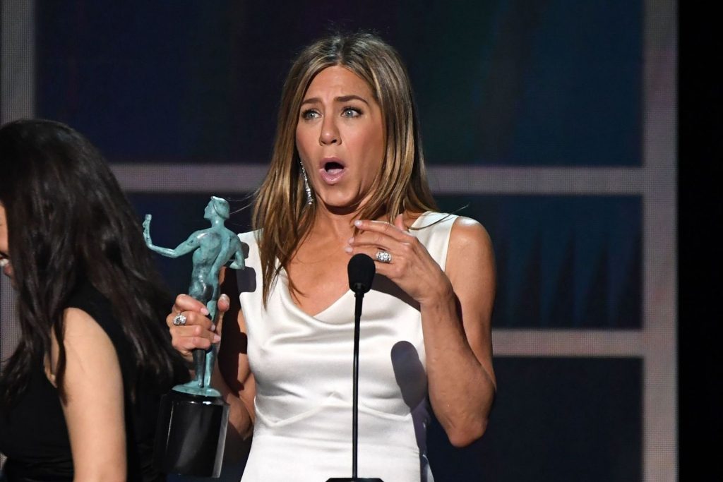 A ex-esposa de Brad Pitt, Jennifer Aniston, ri e bate palmas para seu hilário discurso de aceitação no SAG enquanto ele zomba do Tinder e de ‘não se dar bem com a esposa’. O galã subiu ao palco após ganhar como Ator Coadjuvante por seu papel no filme de Quentin Tarantino Era Uma Vez em Hollywood. Pitt, que abraçou o colega de elenco Leonardo DiCaprio e mandou um beijo para Tarantino, fez a plateia rir desde o início do seu discurso.