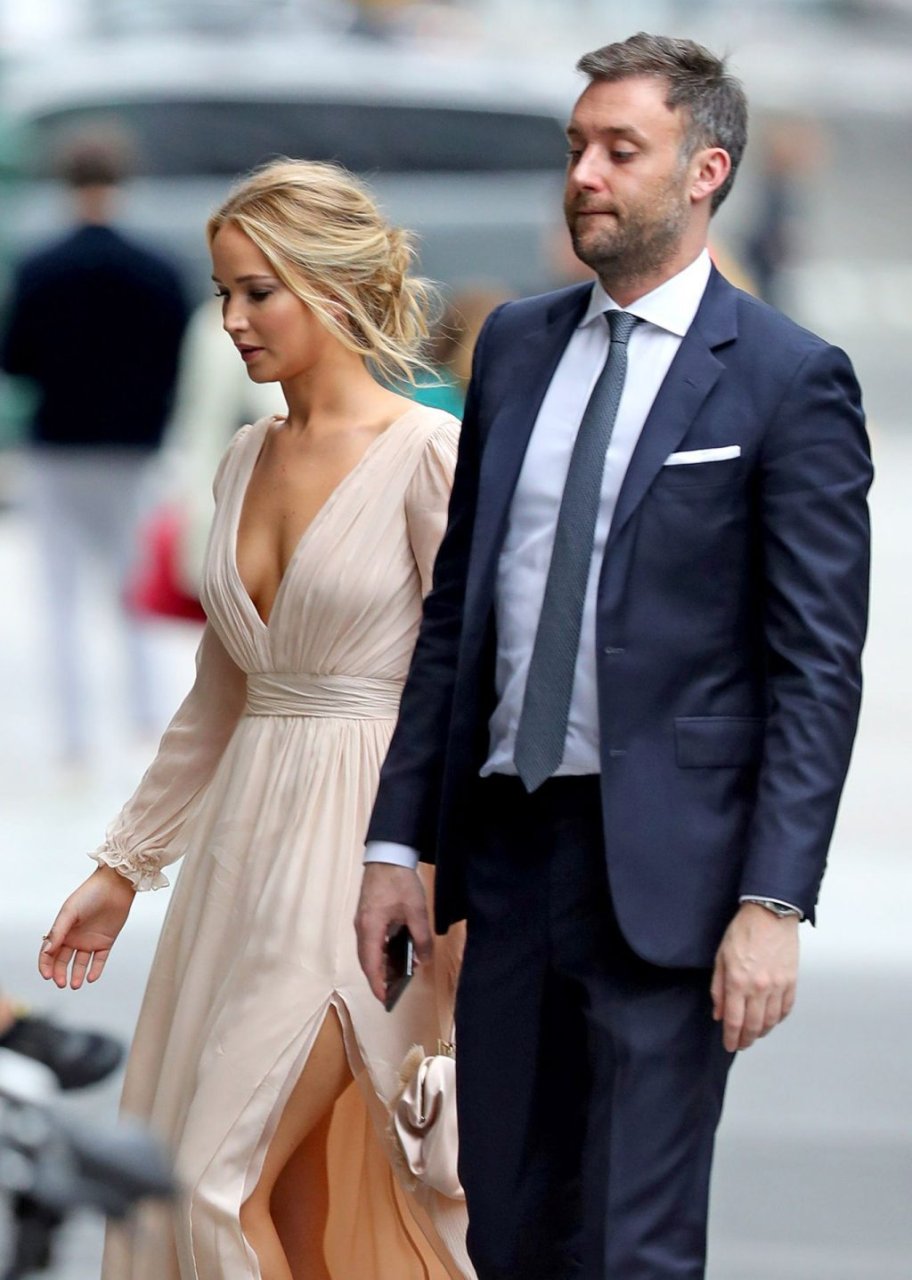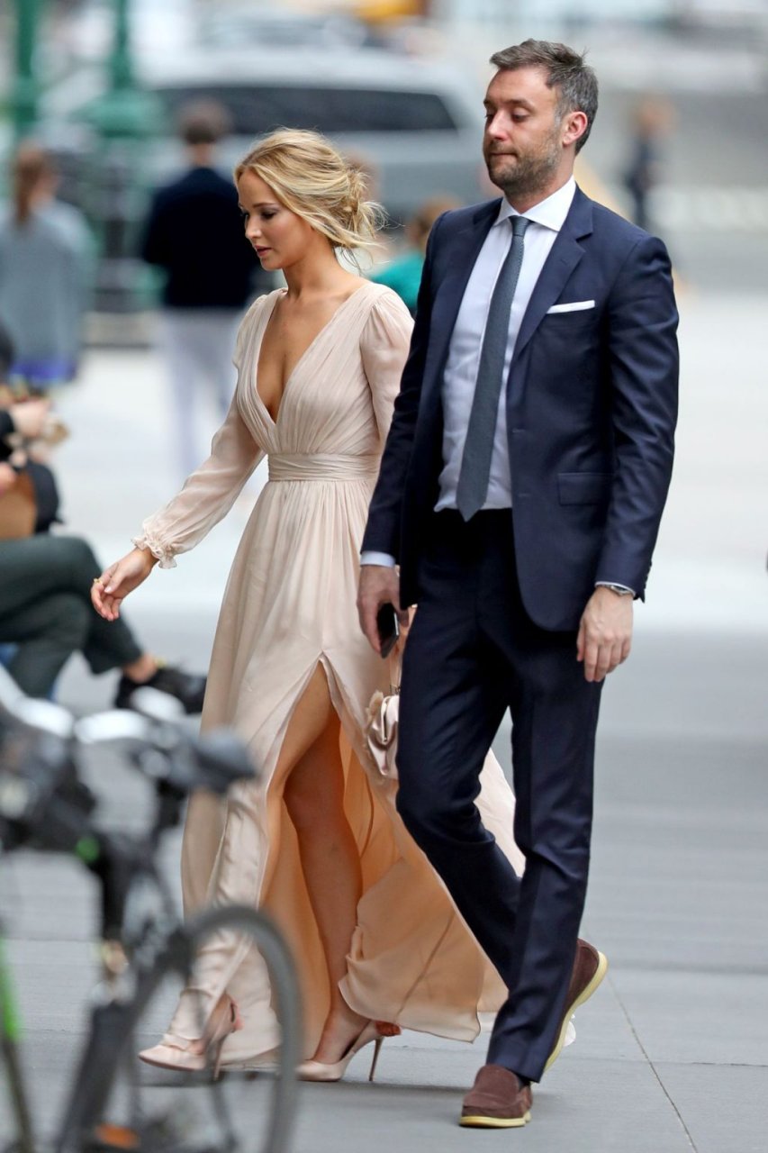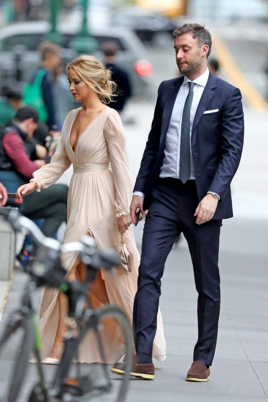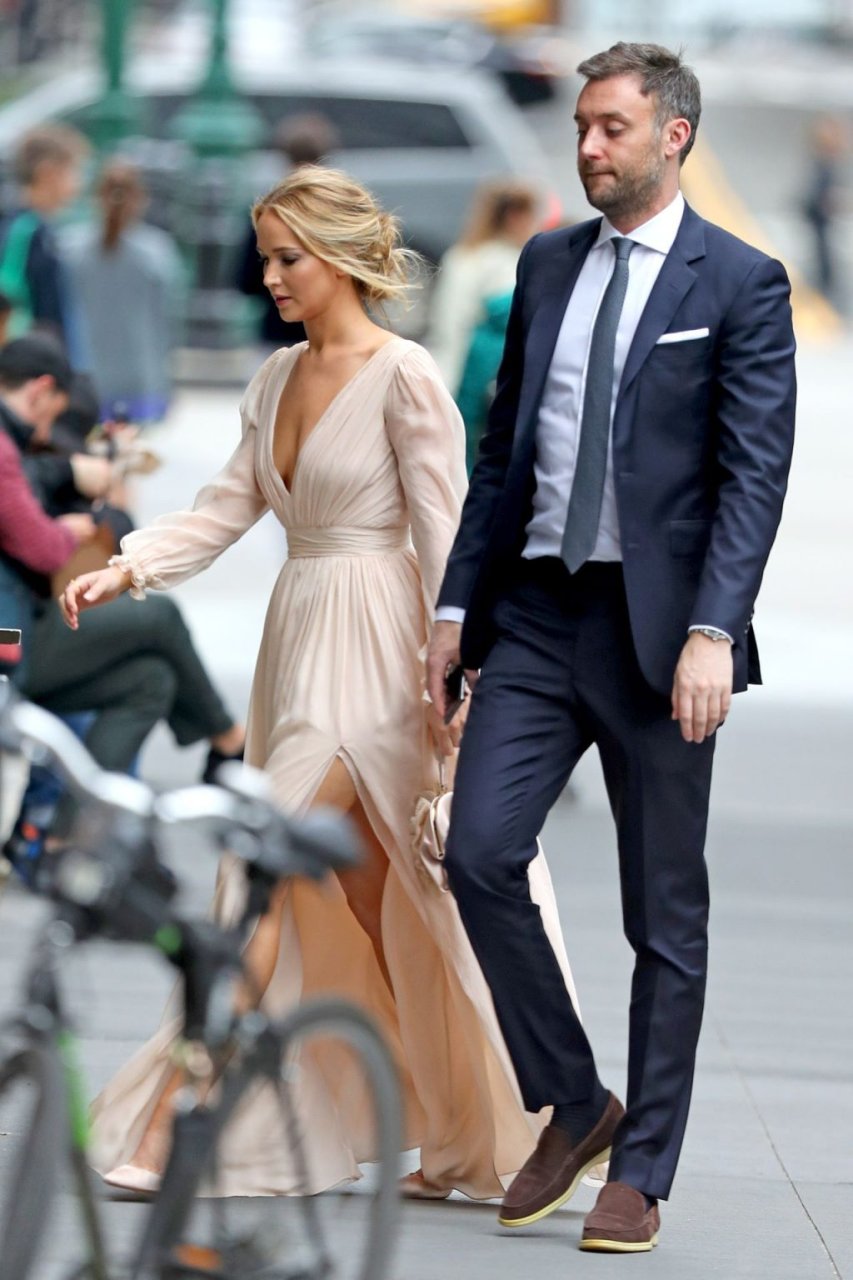 Jennifer Lawrence e Cooke Maroney se arrumam para um encontro na cidade de Nova York, 12/05/2019. A atriz de 28 anos e a estrela de The Fappening impressionaram com um vestido cor de pêssego combinado com saltos combinando. O casal foi visto entrando em um prédio de apartamentos no sul de Manhattan.