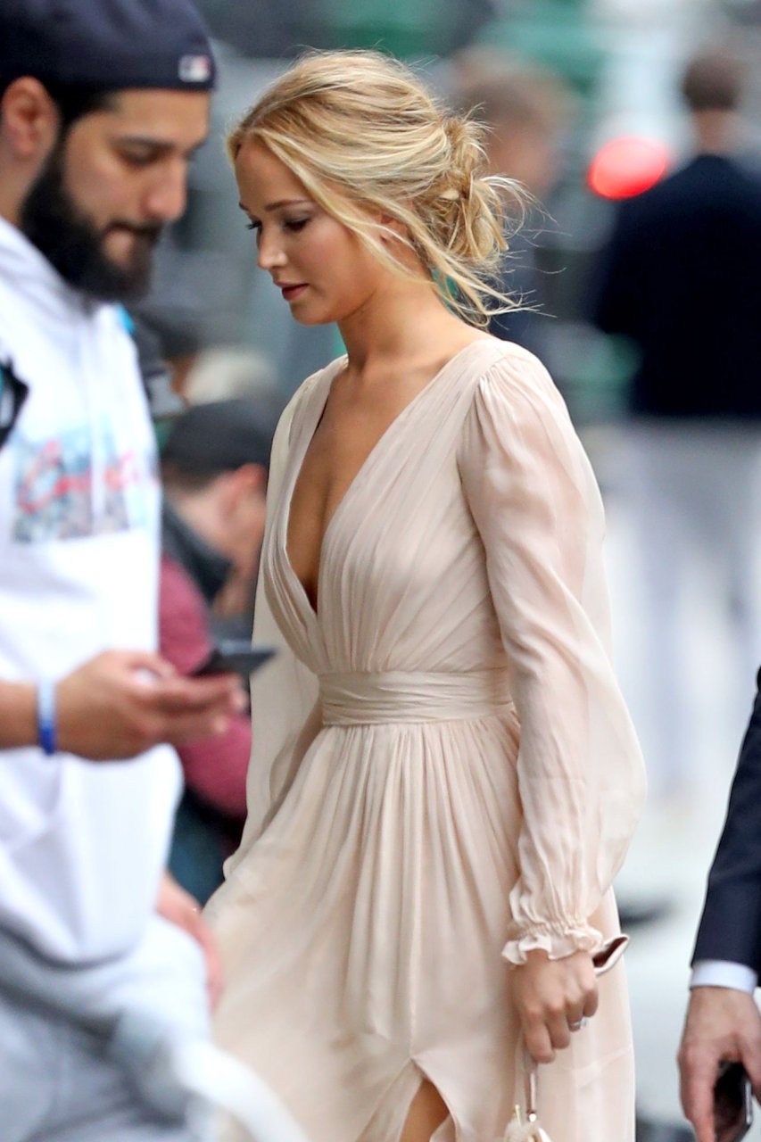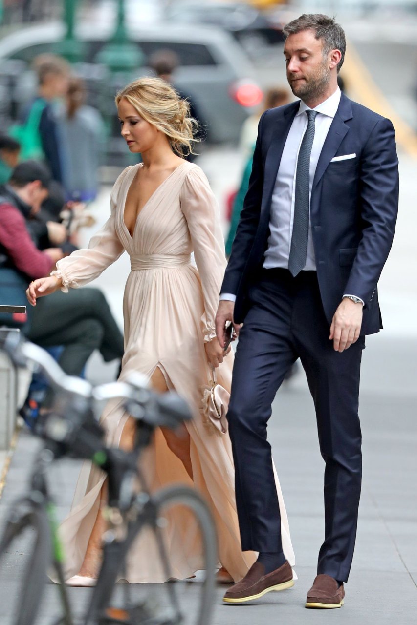 Jennifer Lawrence e Cooke Maroney se arrumam para um encontro na cidade de Nova York, 12/05/2019. A atriz de 28 anos e a estrela de The Fappening impressionaram com um vestido cor de pêssego combinado com saltos combinando. O casal foi visto entrando em um prédio de apartamentos no sul de Manhattan.