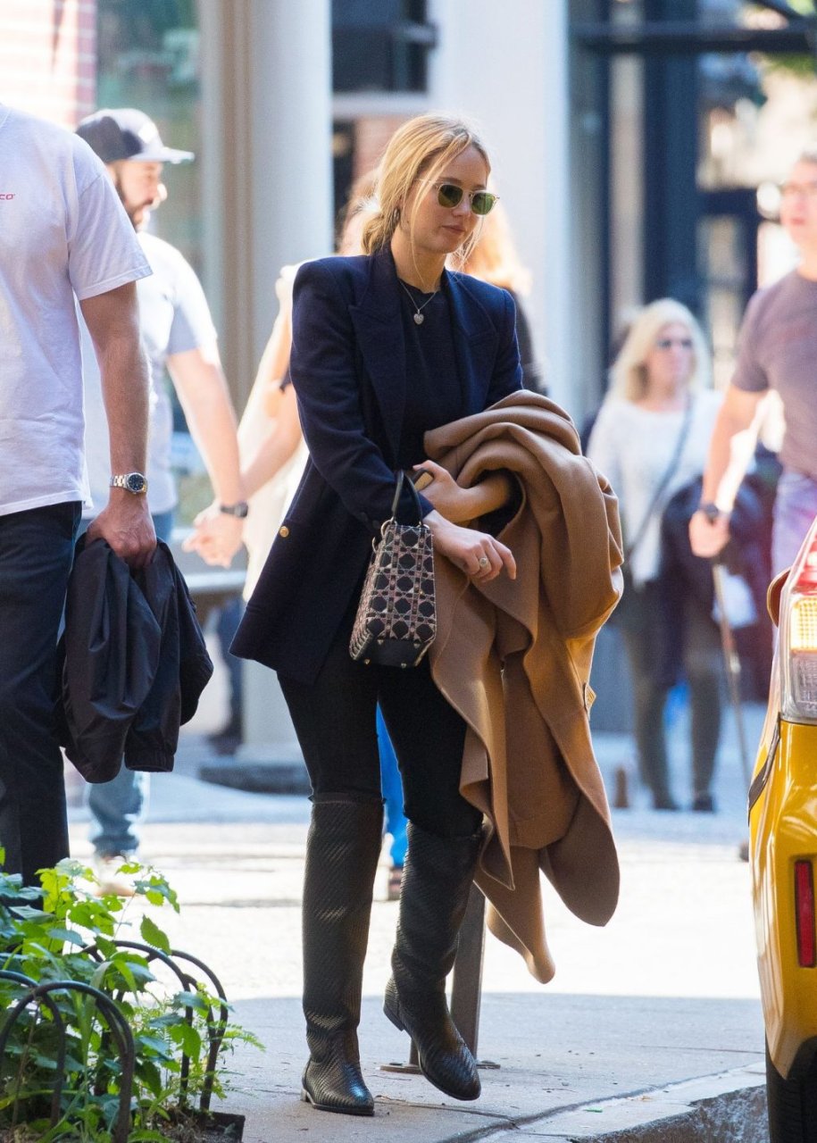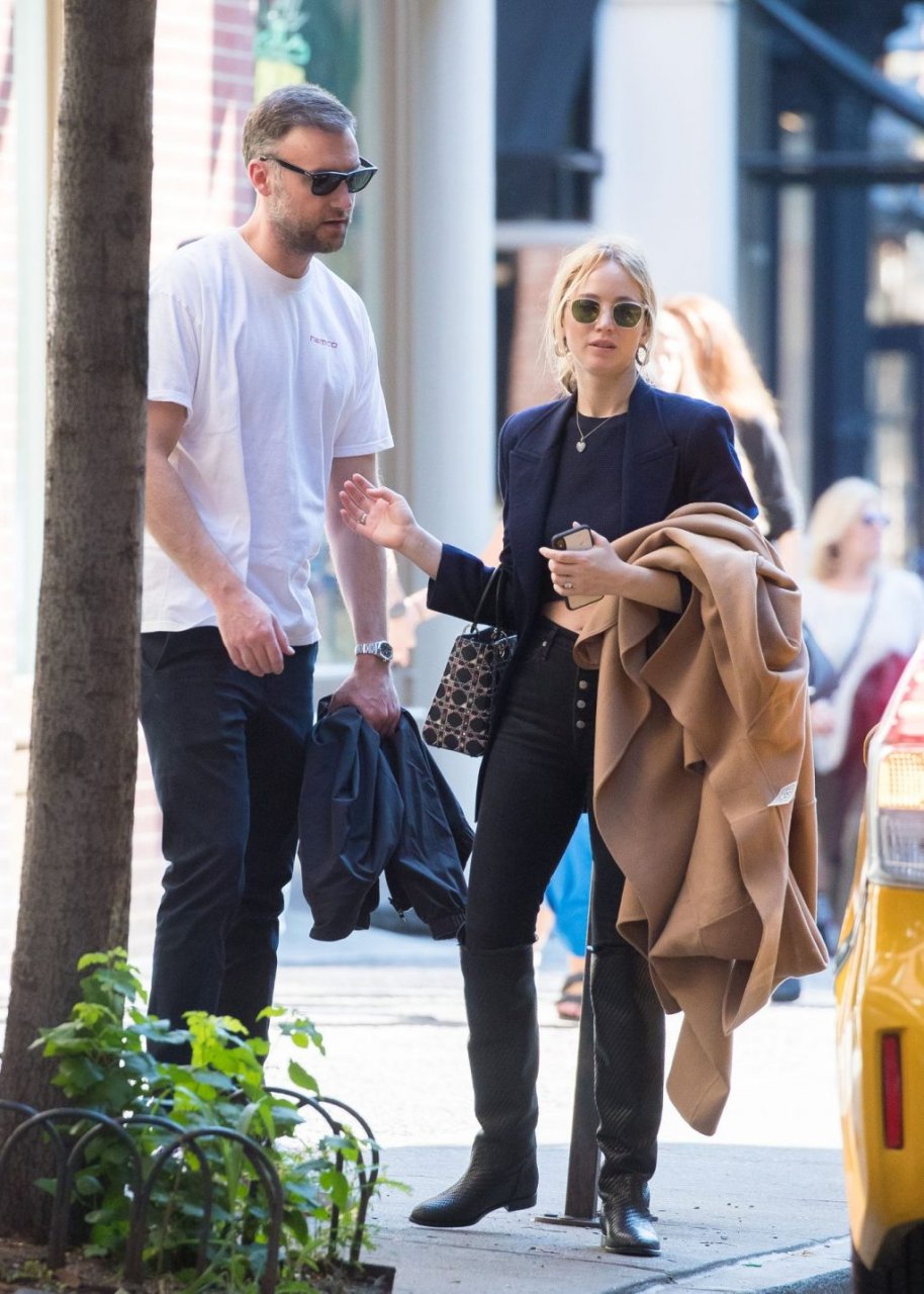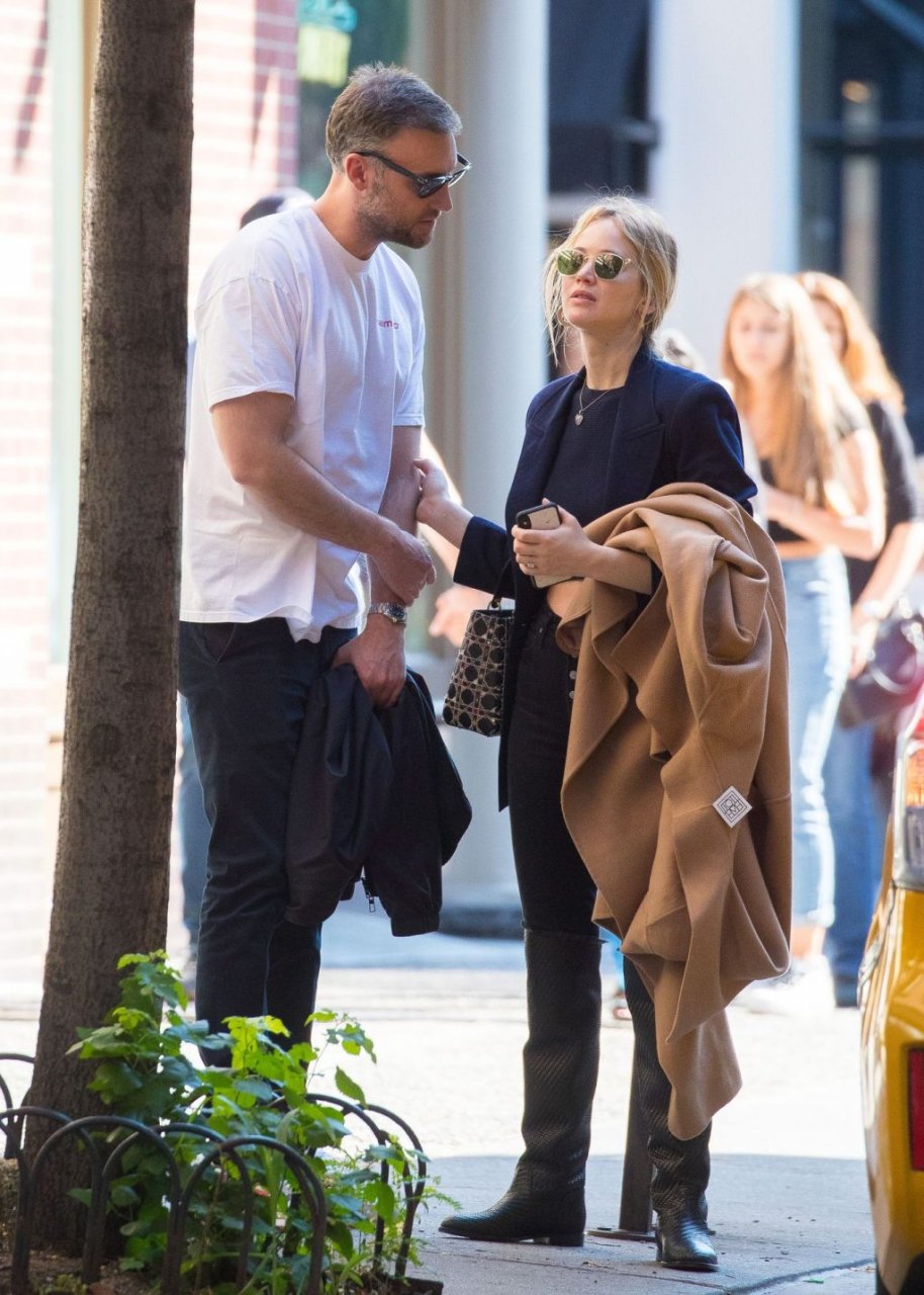 Jennifer Lawrence e Cooke Maroney compartilham um longo beijo antes de seguirem caminhos separados na cidade de Nova York, 14/10/2019. A atriz de 29 anos carregava uma bolsa Dior e usava um blazer preto, top cropped, calça com botão e botas até o joelho.