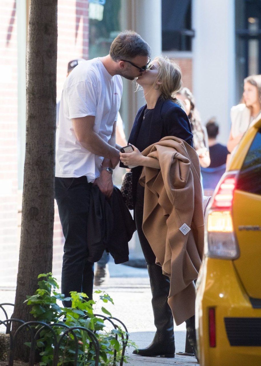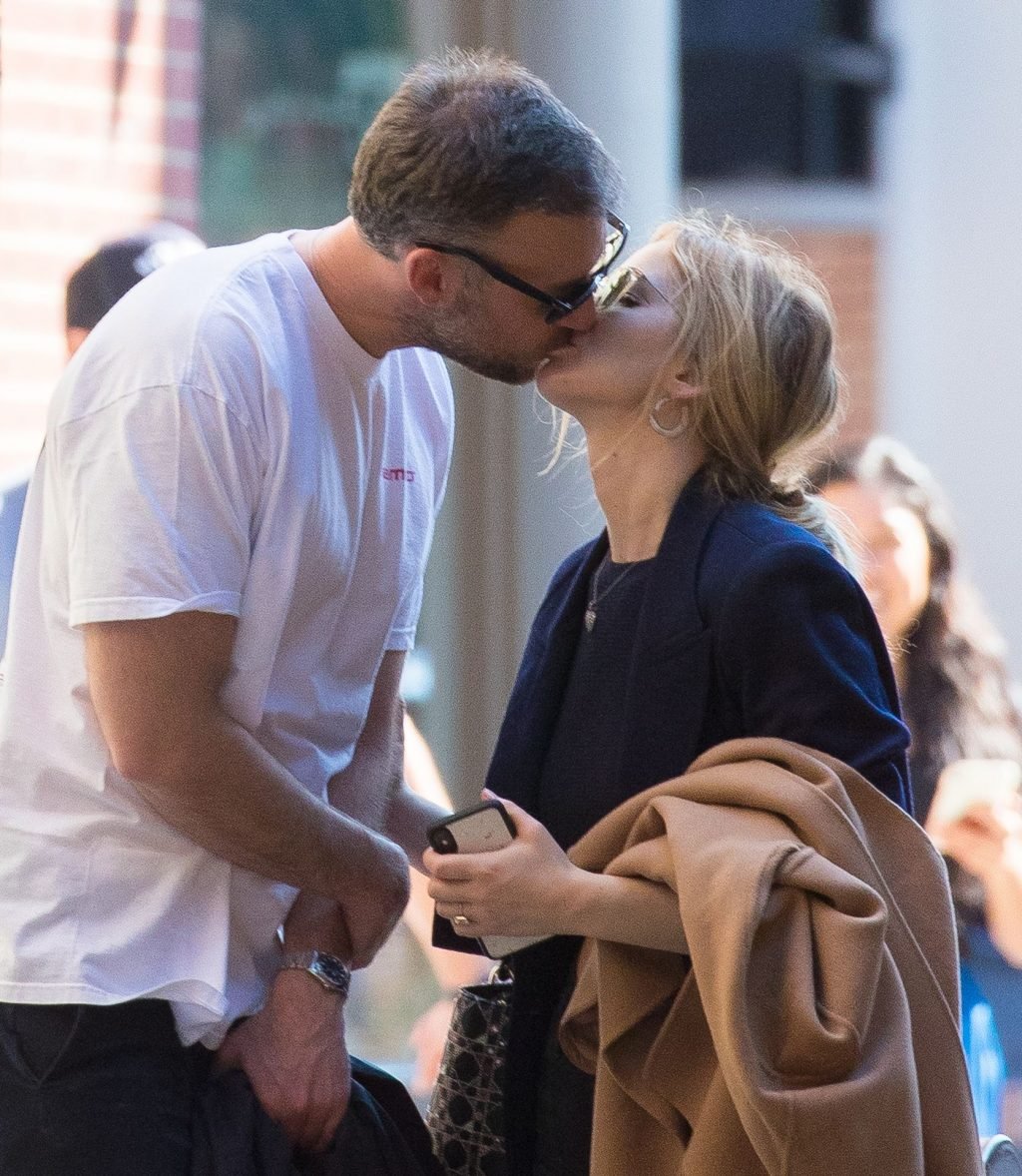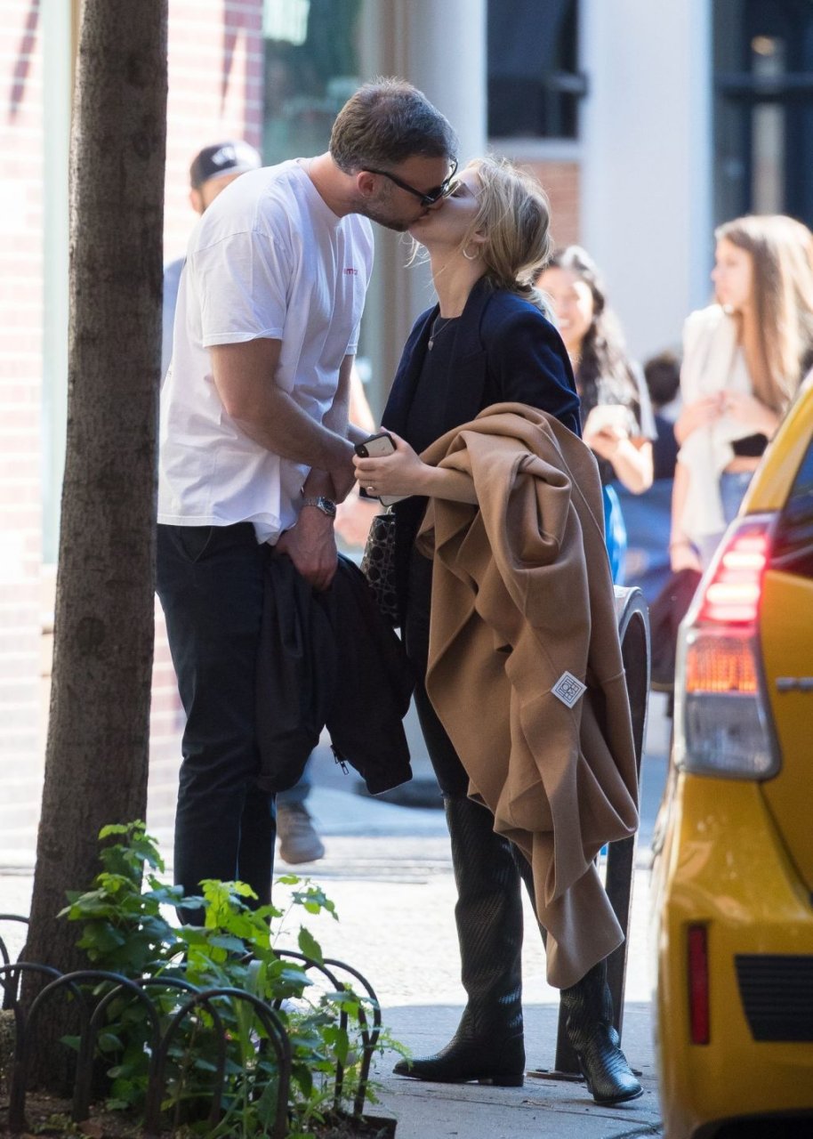 Jennifer Lawrence e Cooke Maroney compartilham um longo beijo antes de seguirem caminhos separados na cidade de Nova York, 14/10/2019. A atriz de 29 anos carregava uma bolsa Dior e usava um blazer preto, top cropped, calça com botão e botas até o joelho.