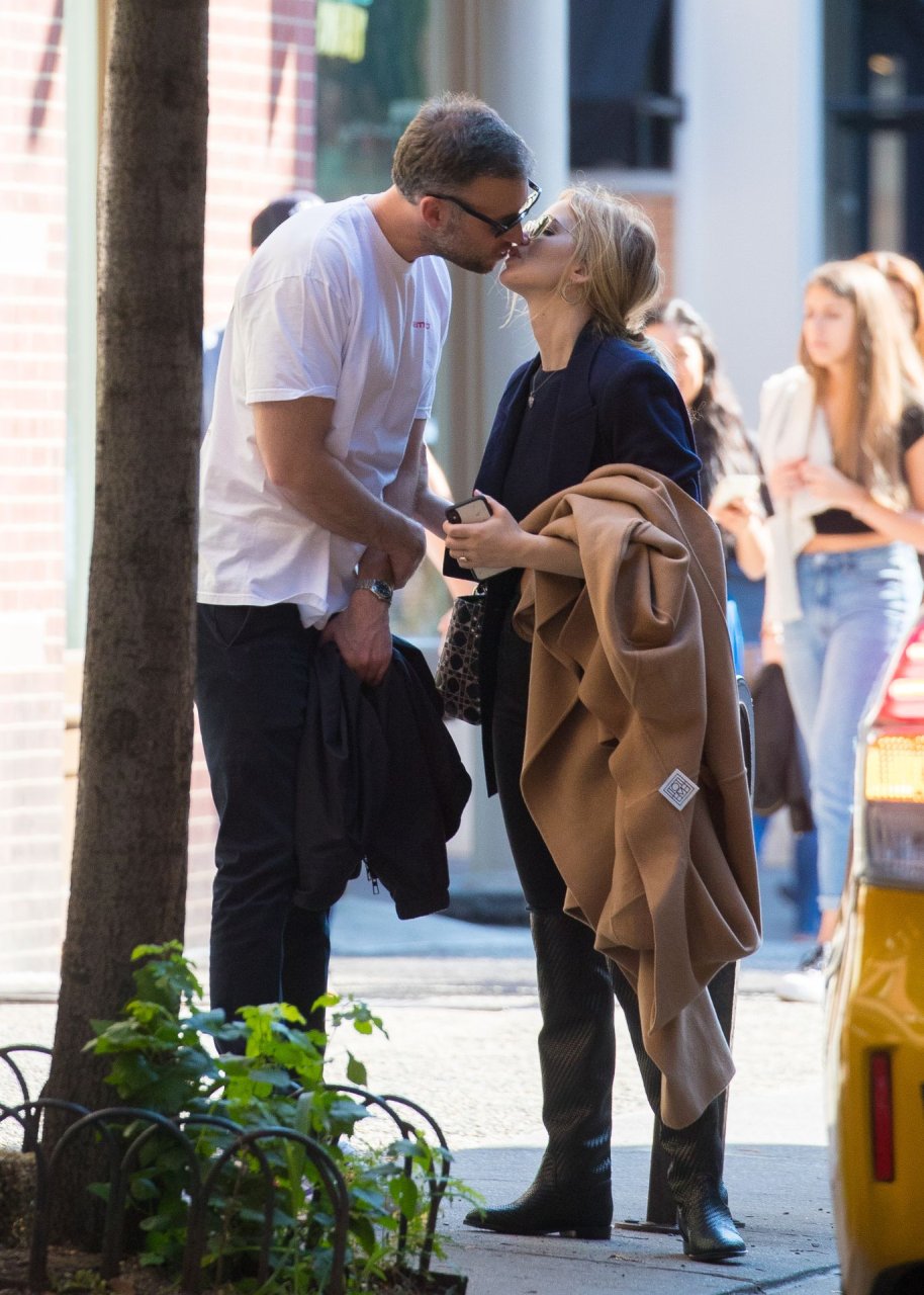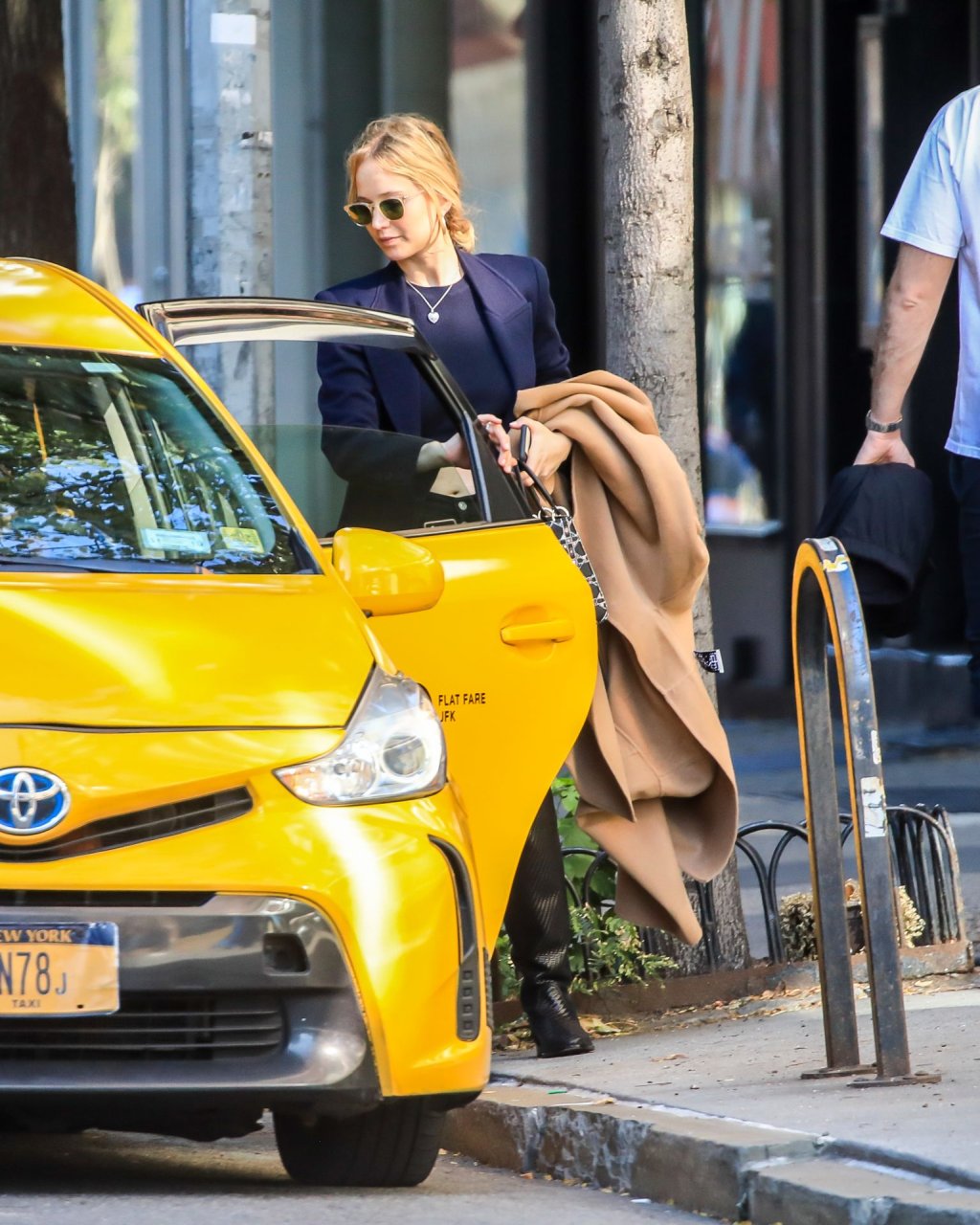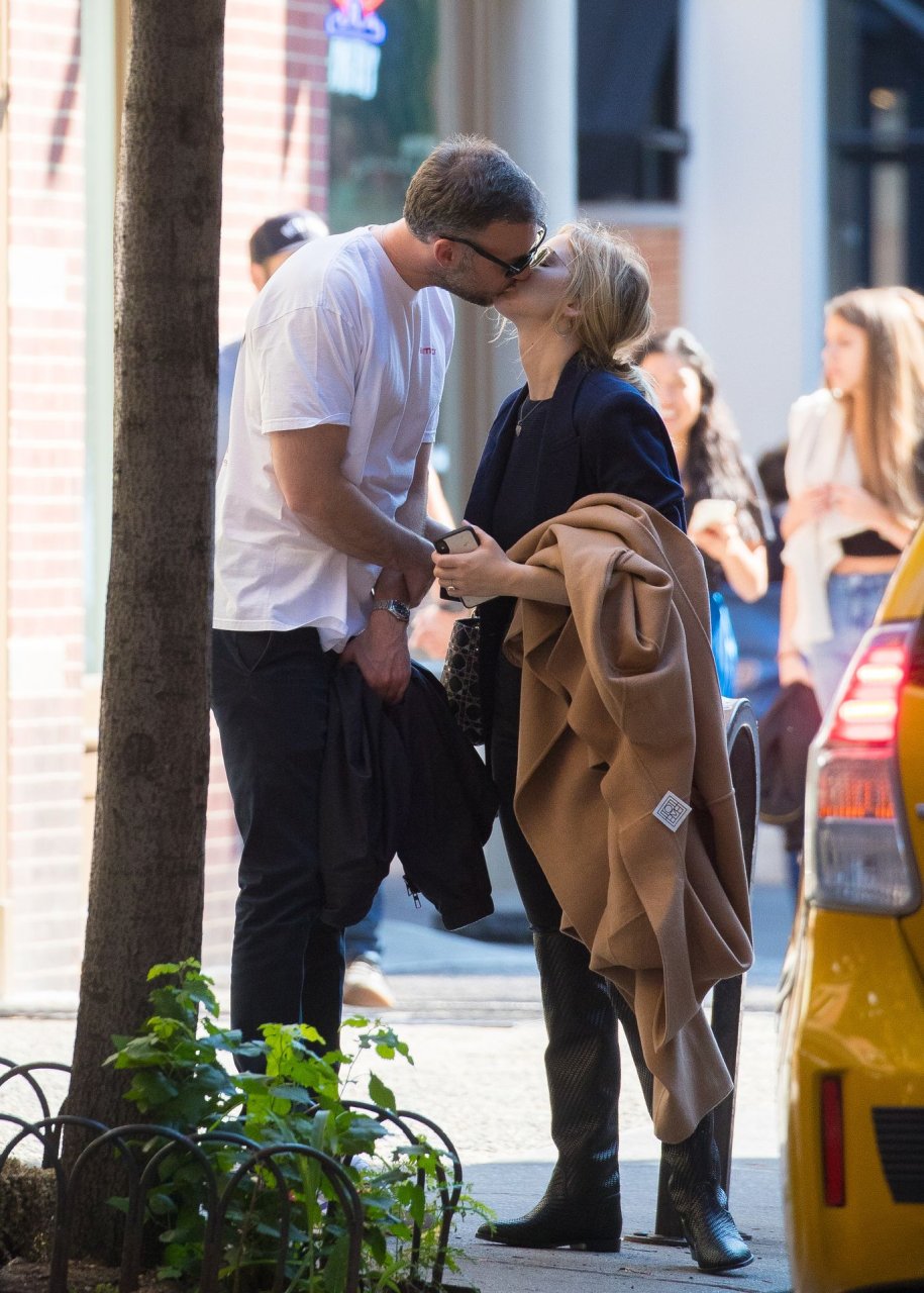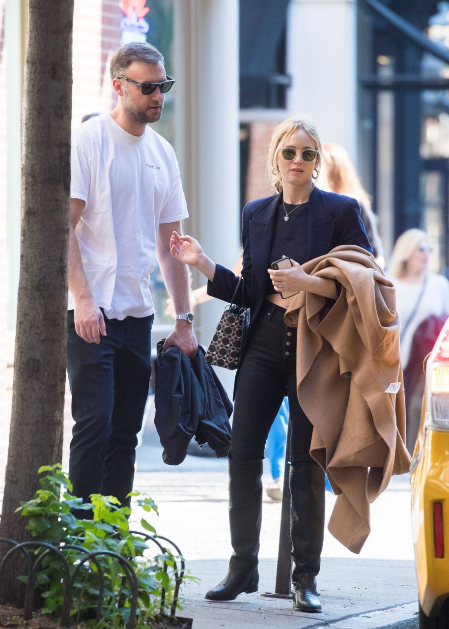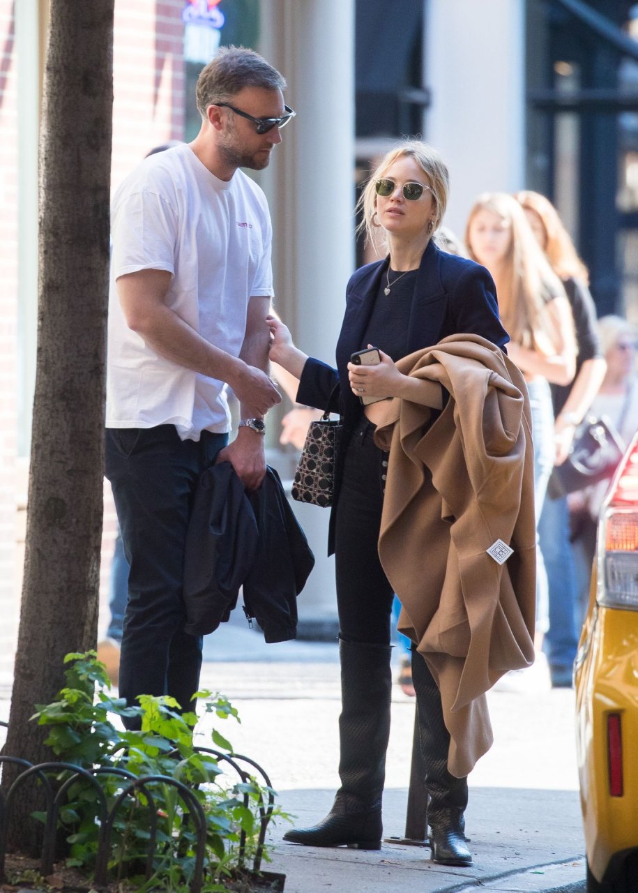 Jennifer Lawrence e Cooke Maroney compartilham um longo beijo antes de seguirem caminhos separados na cidade de Nova York, 14/10/2019. A atriz de 29 anos carregava uma bolsa Dior e usava um blazer preto, top cropped, calça com botão e botas até o joelho.