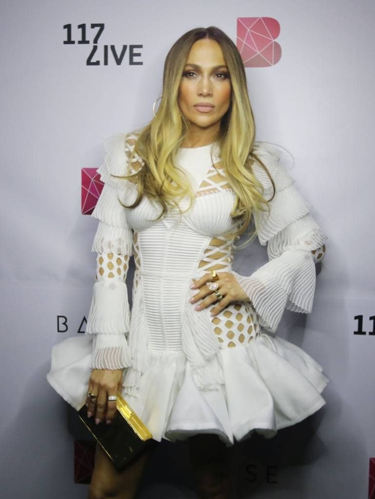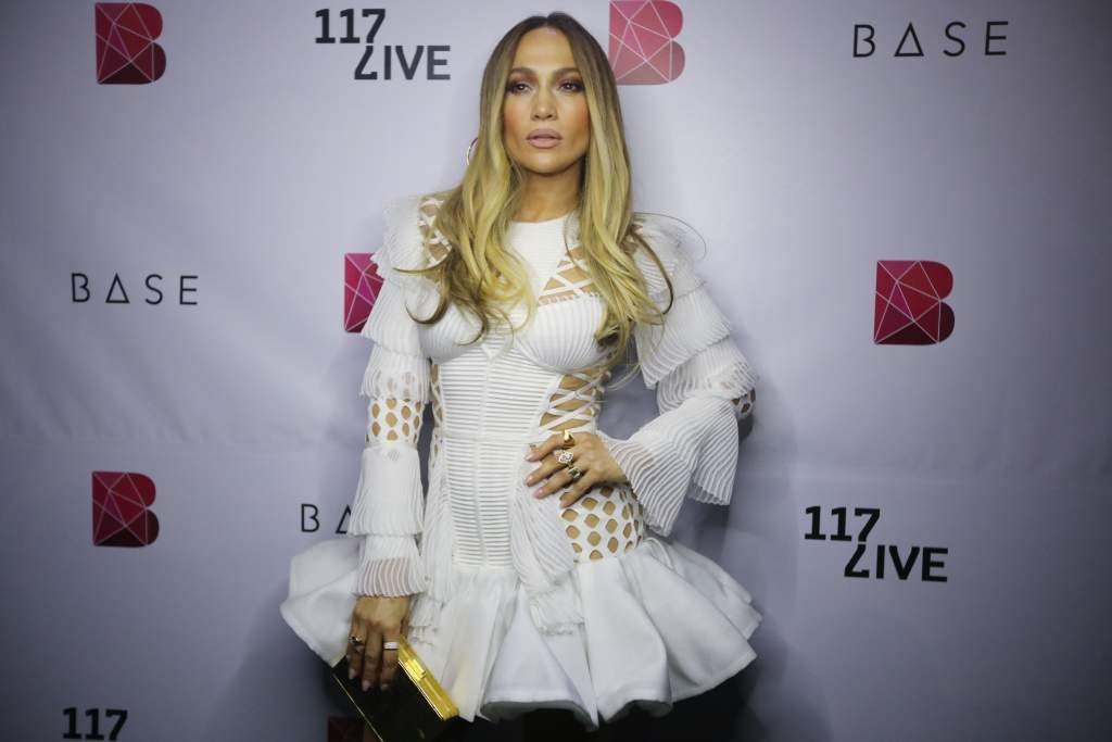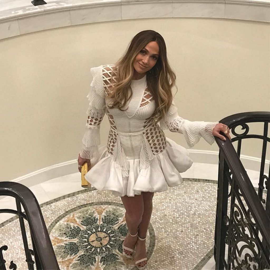 Jennifer Lopez usa um vestido branco enquanto se aconchega a Alex Rodriguez antes da apresentação em Dubai, 16/11/2017. Jennifer Lynn López é uma cantora americana, dançarina, atriz (Bye Bye Birdie Live!). Idade – 48.