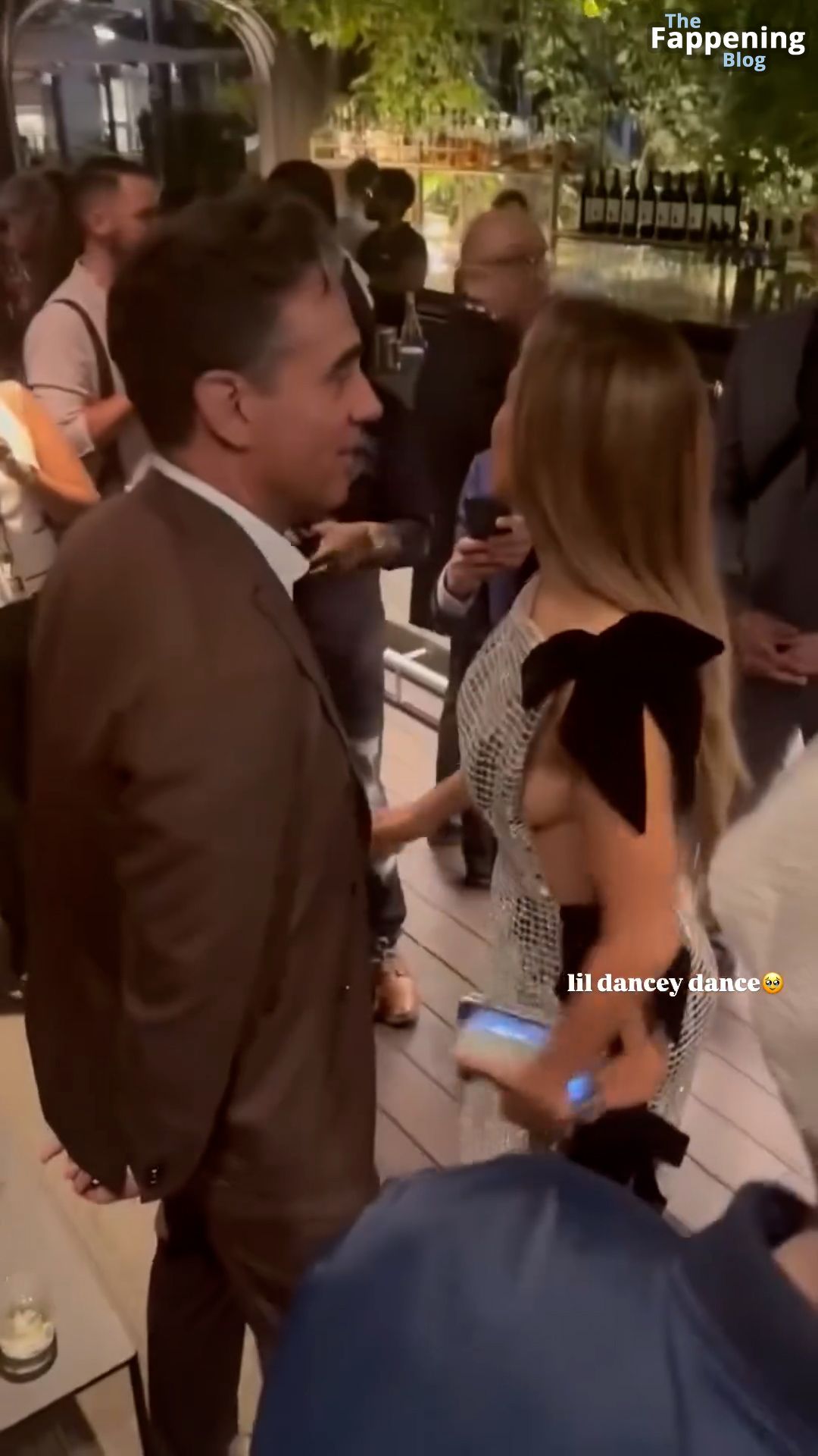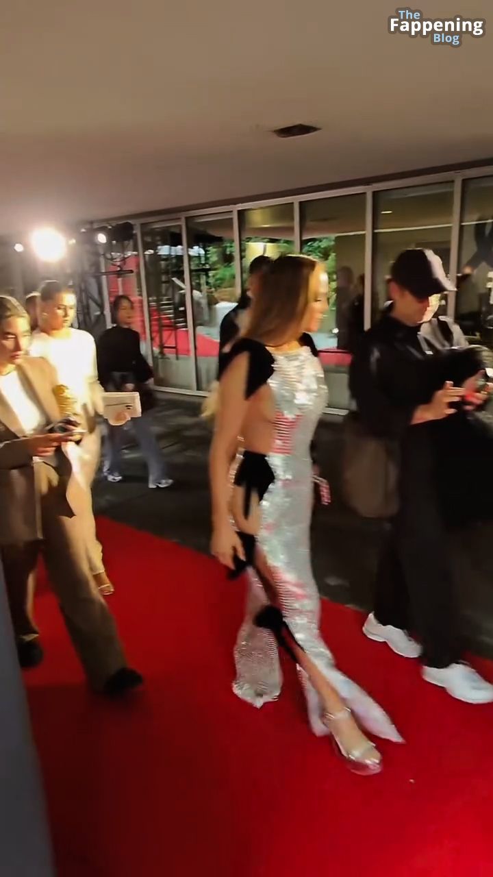 Ela usou um vestido ousado de Tamara Ralph – um modelo prateado brilhante com fendas profundas nas laterais, todo amarrado com laços de veludo preto. Esse visual permitiu que ela exibisse suas curvas e destacasse sua incrível forma física.