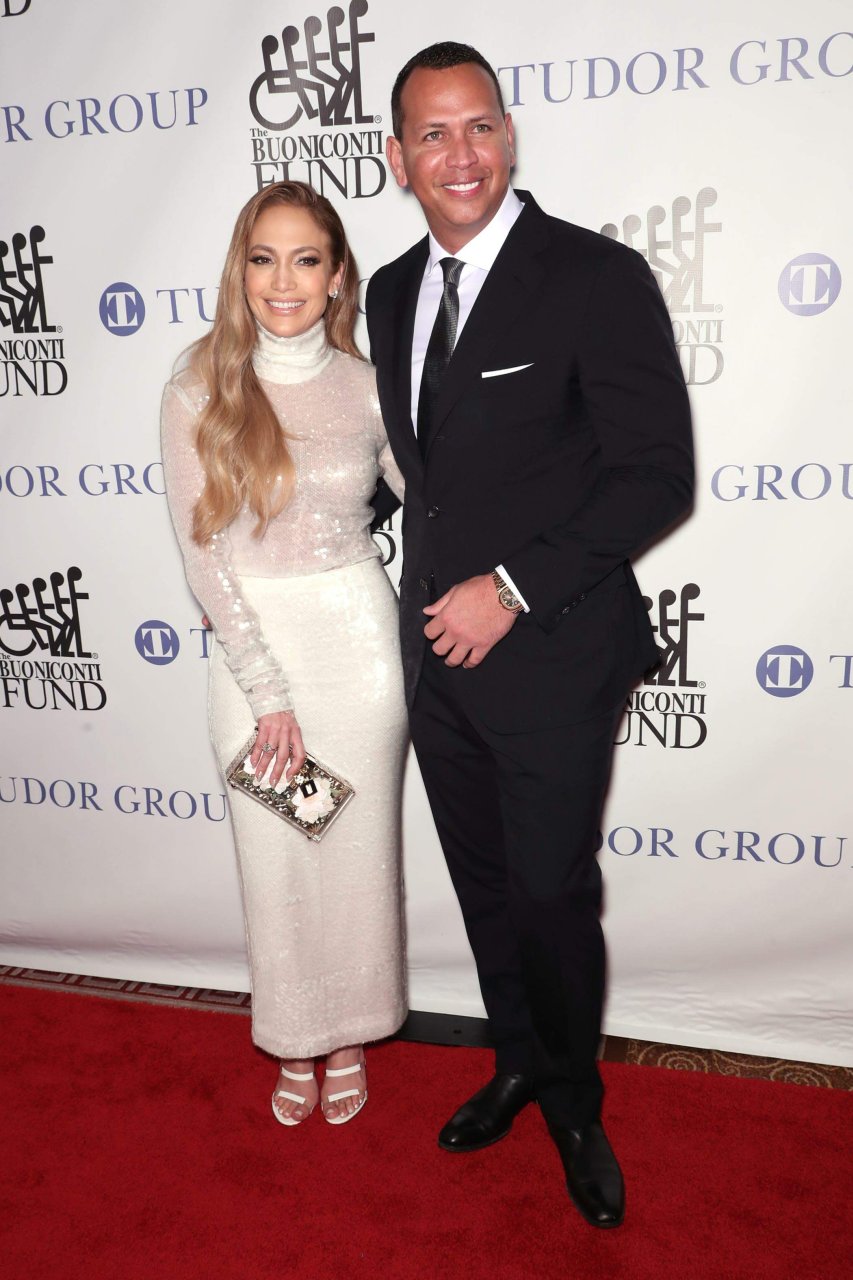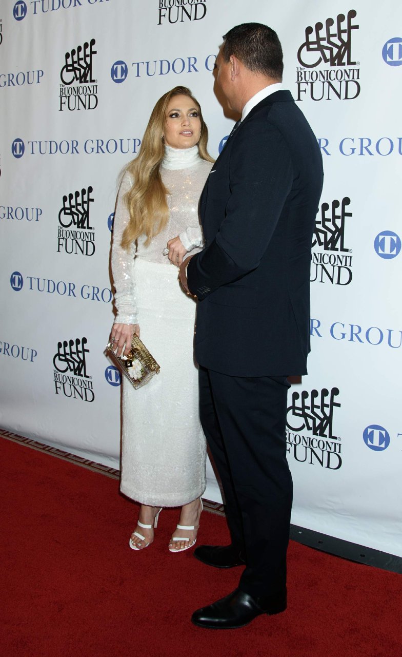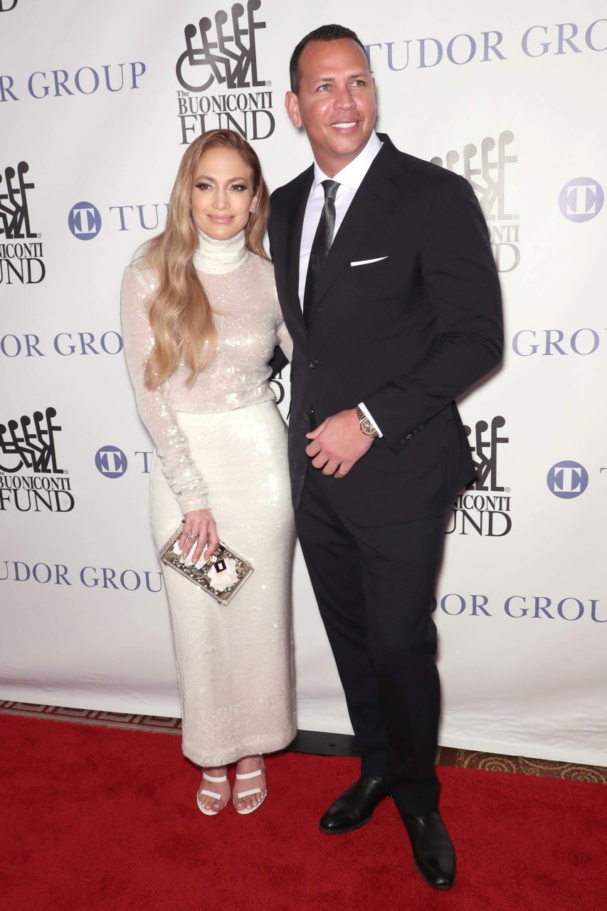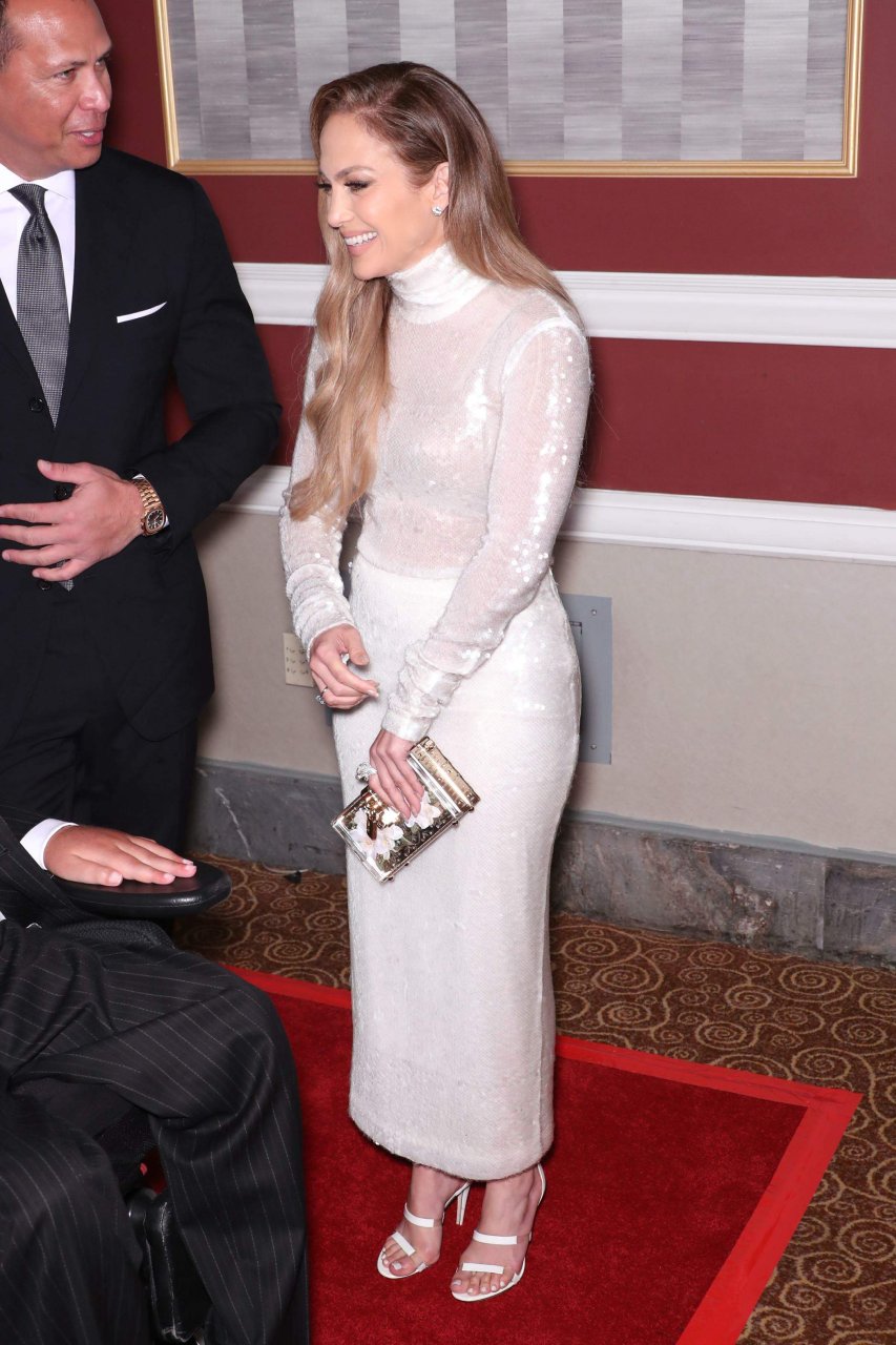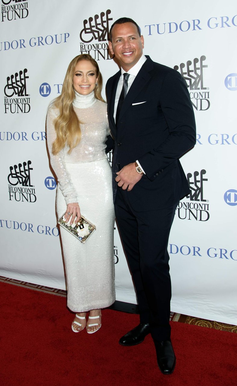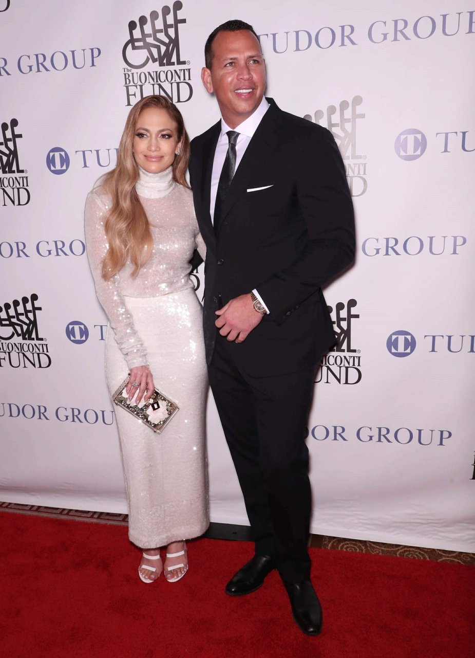 Superstar Jennifer Lopez (49) posa no tapete vermelho com o namorado Alex Rodriguez no 33º Jantar Anual dos Grandes Ícones do Esporte em Nova York, 24/09/2018.