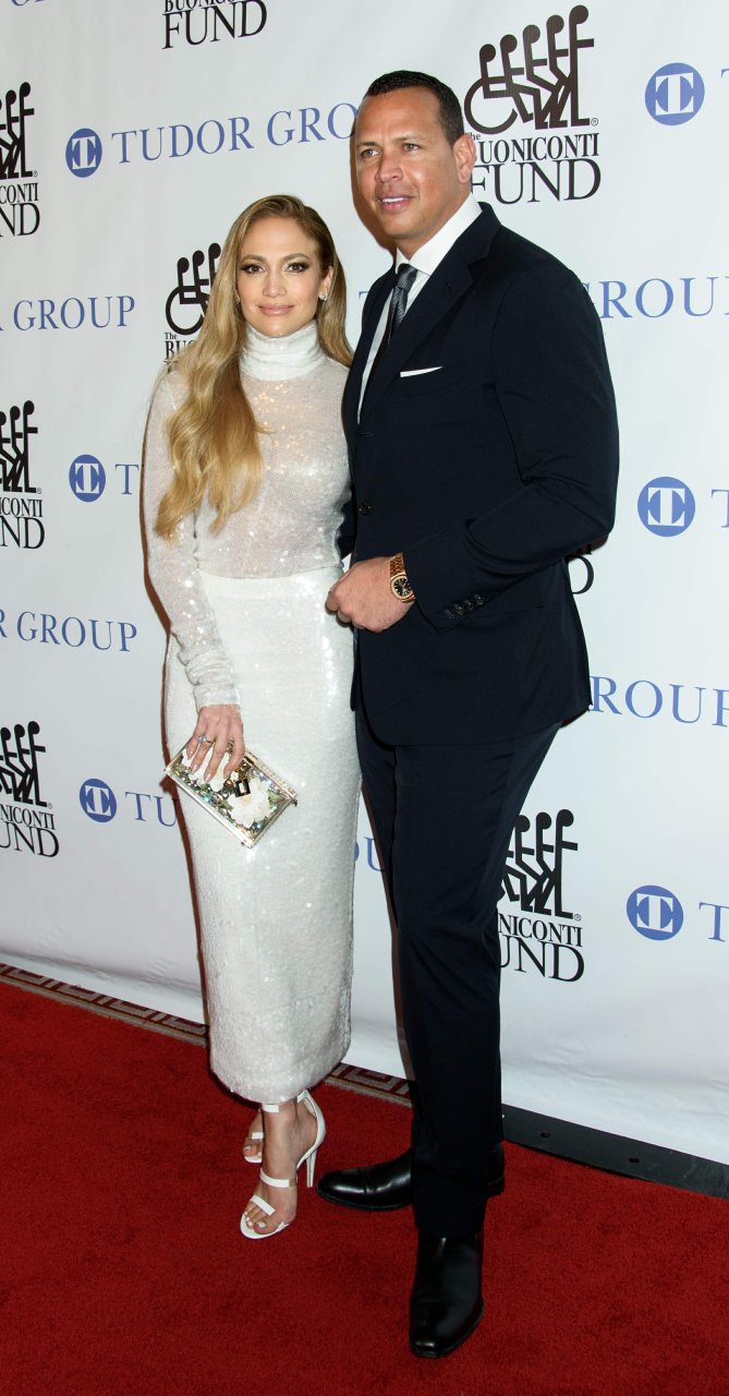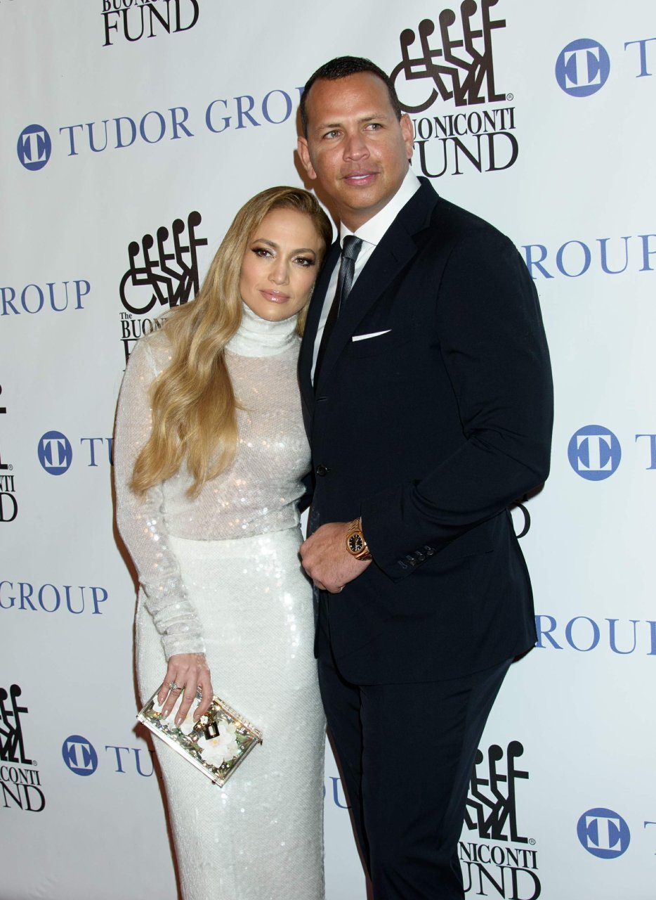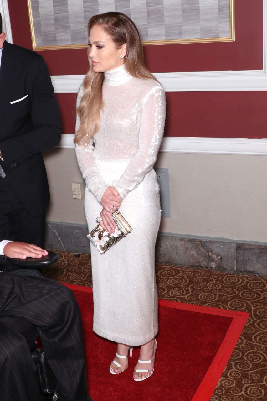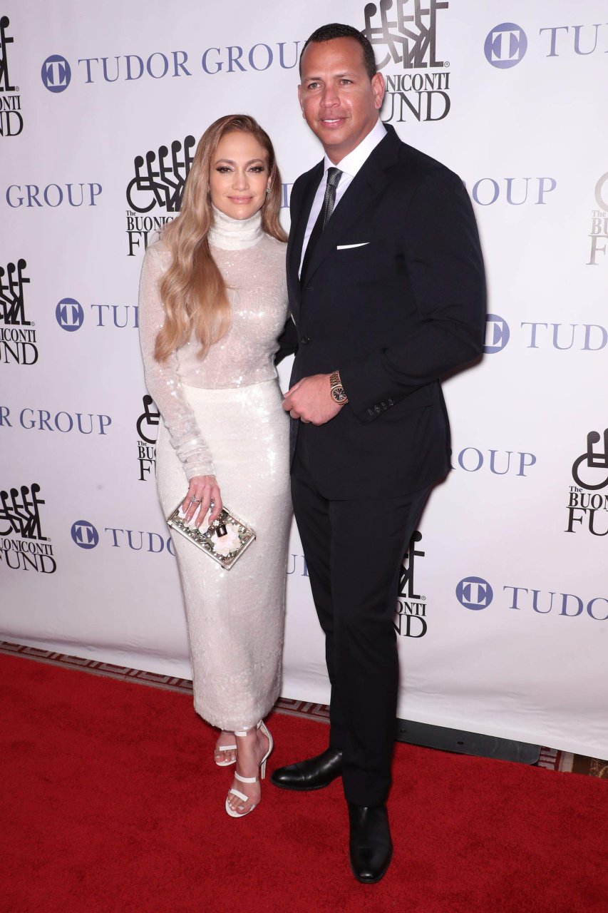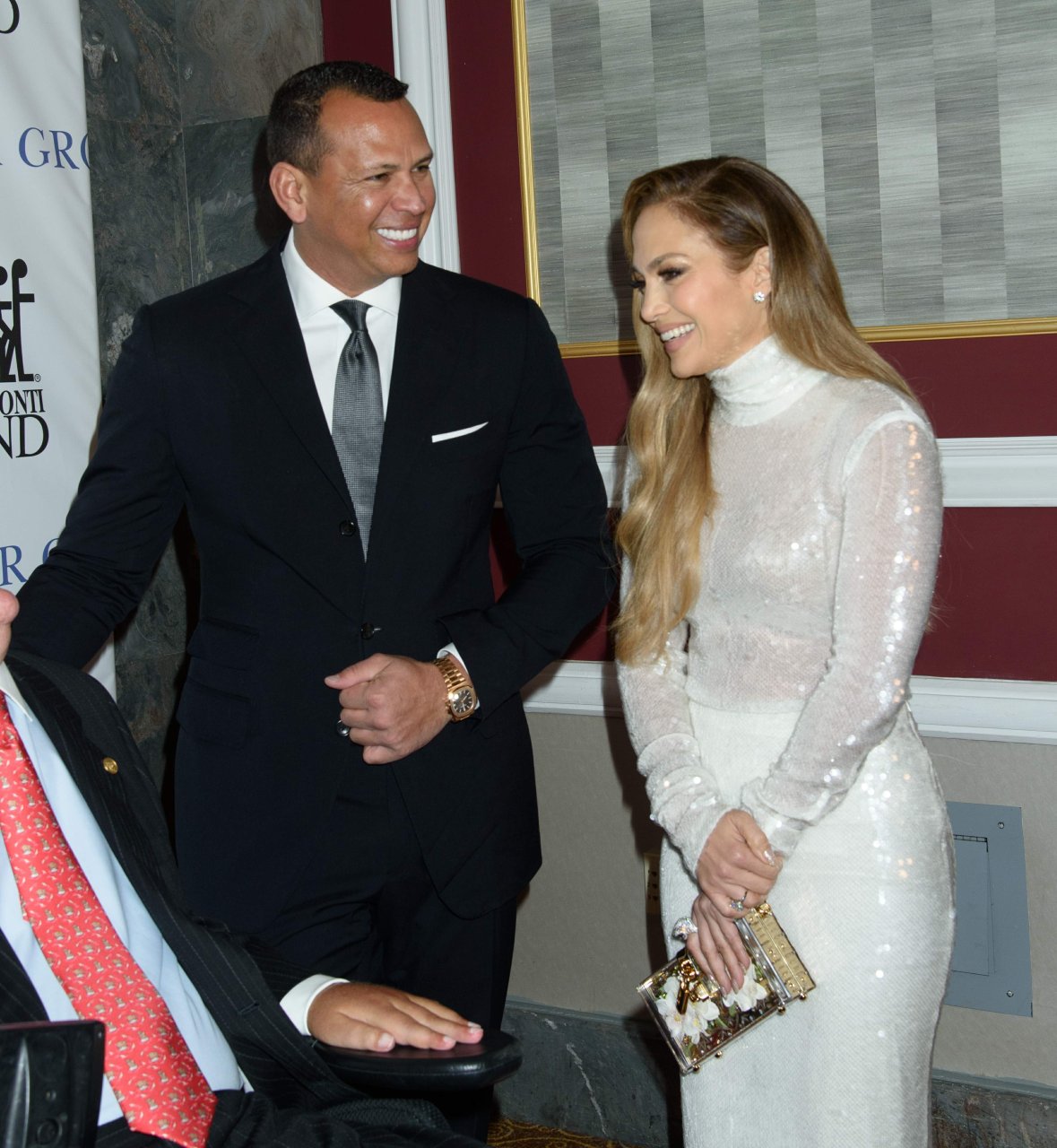 Superstar Jennifer Lopez (49) posa no tapete vermelho com o namorado Alex Rodriguez no 33º Jantar Anual dos Grandes Ícones do Esporte em Nova York, 24/09/2018.