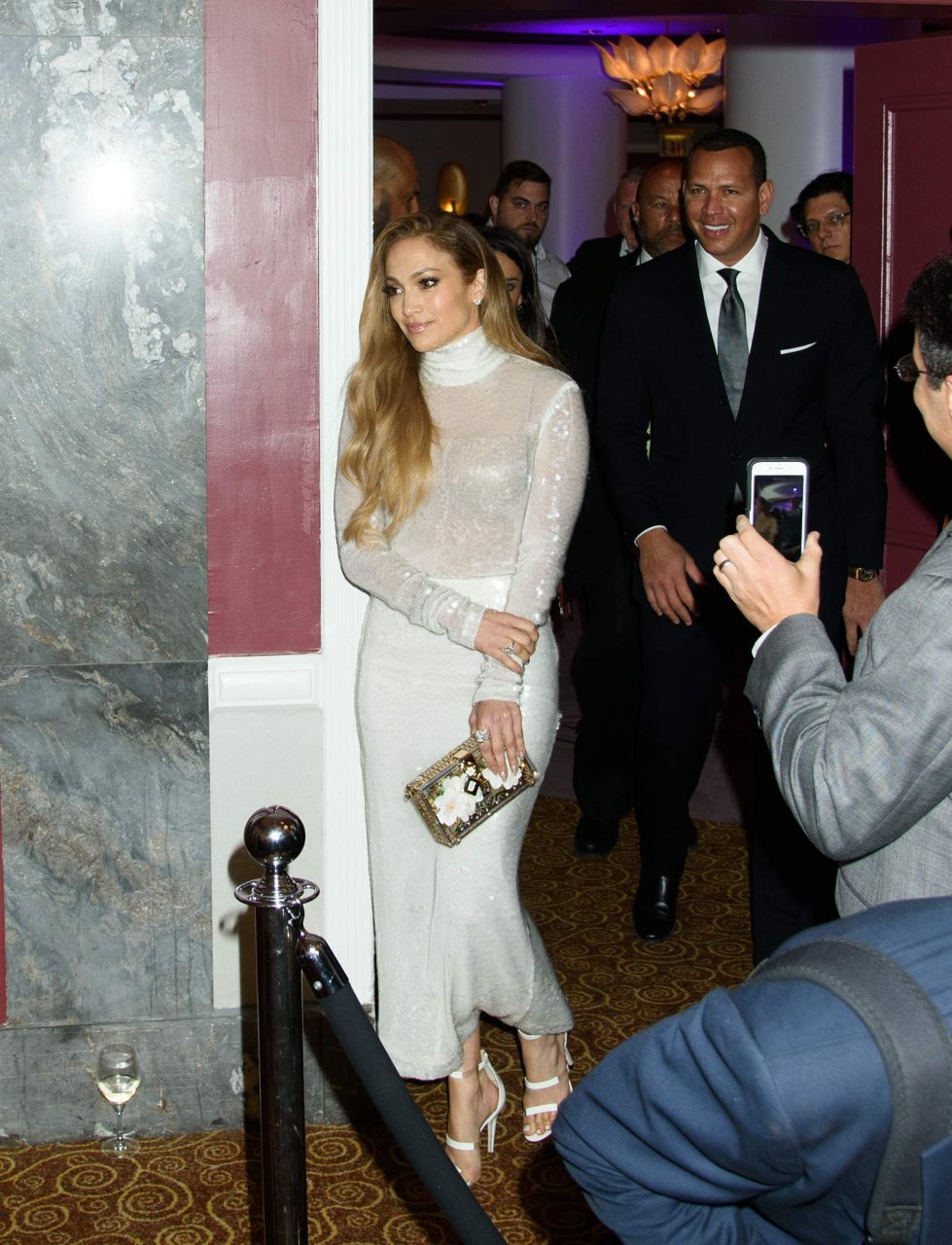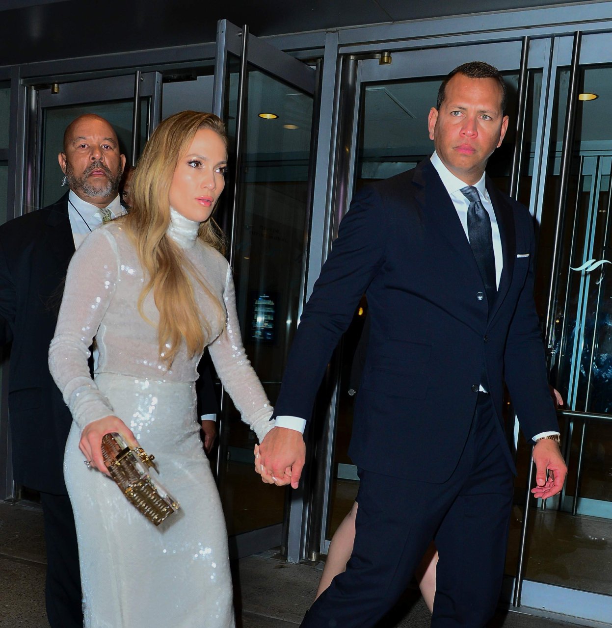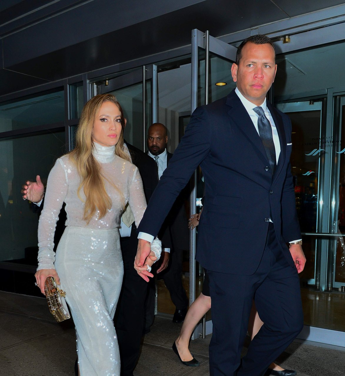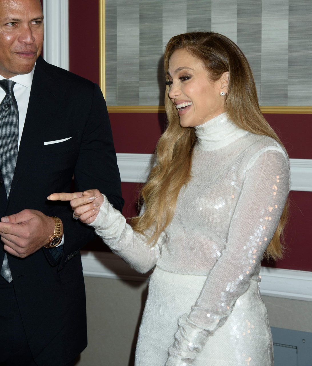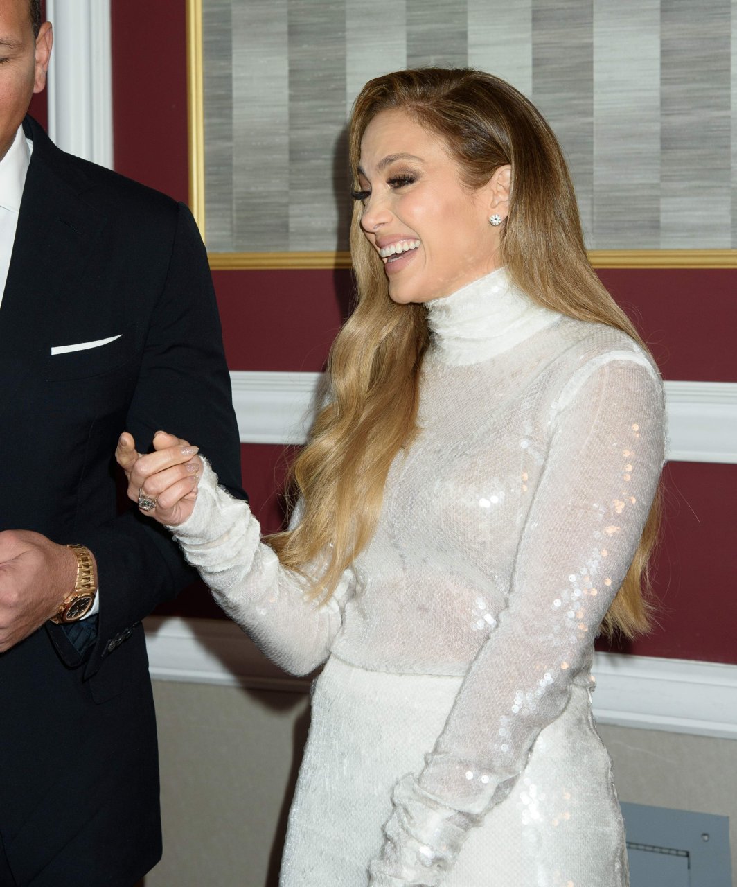 Superstar Jennifer Lopez (49) posa no tapete vermelho com o namorado Alex Rodriguez no 33º Jantar Anual dos Grandes Ícones do Esporte em Nova York, 24/09/2018.