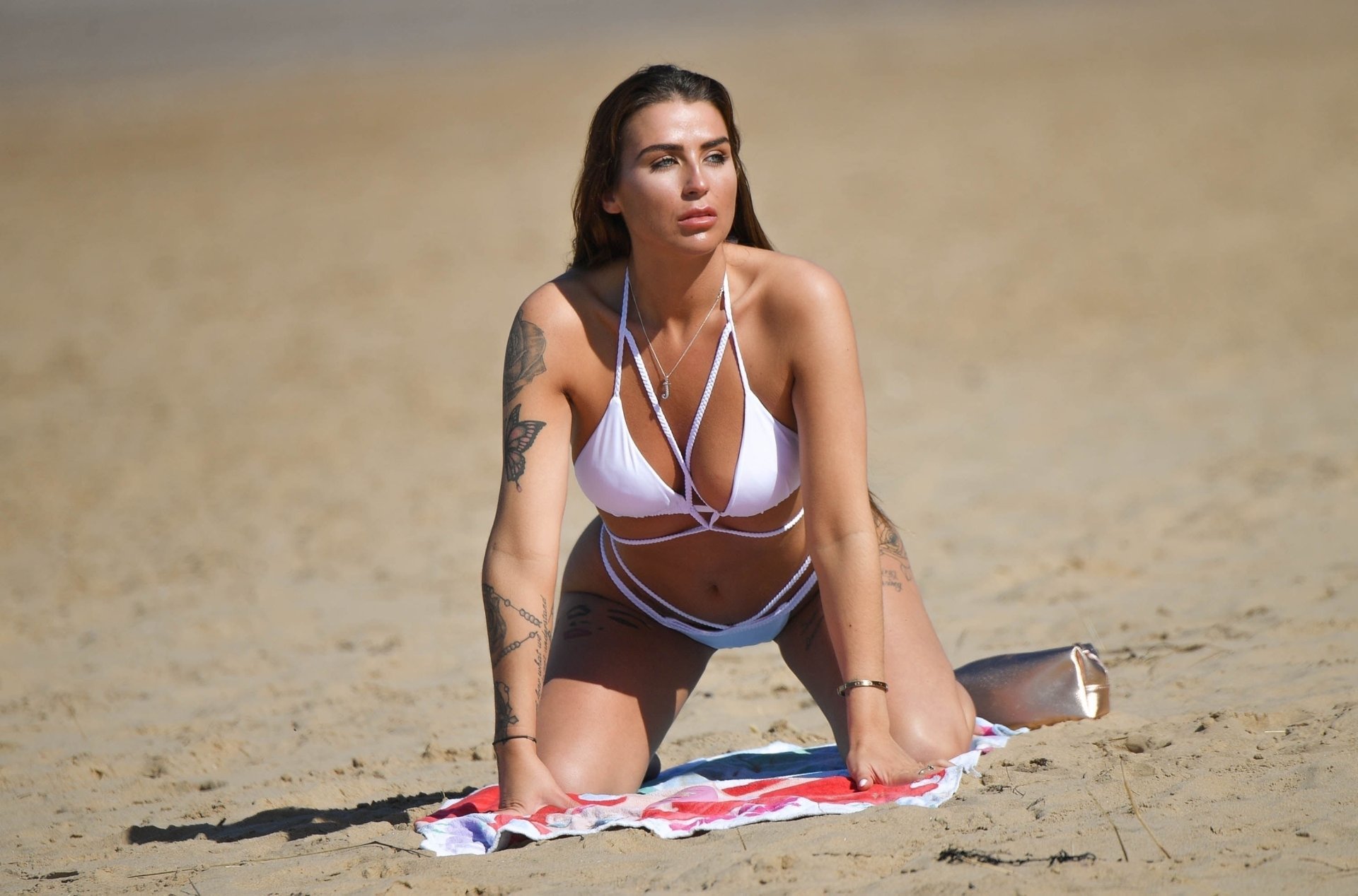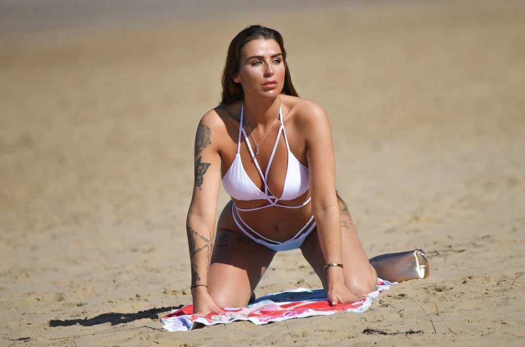 Estrela de Ex on the Beach, Jenny Thompson, exibe seu corpo incrível durante férias em Alicante, Espanha, 21/04/2018. A estrela da realidade mostrou suas curvas em um biquíni branco na praia.