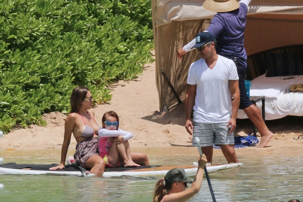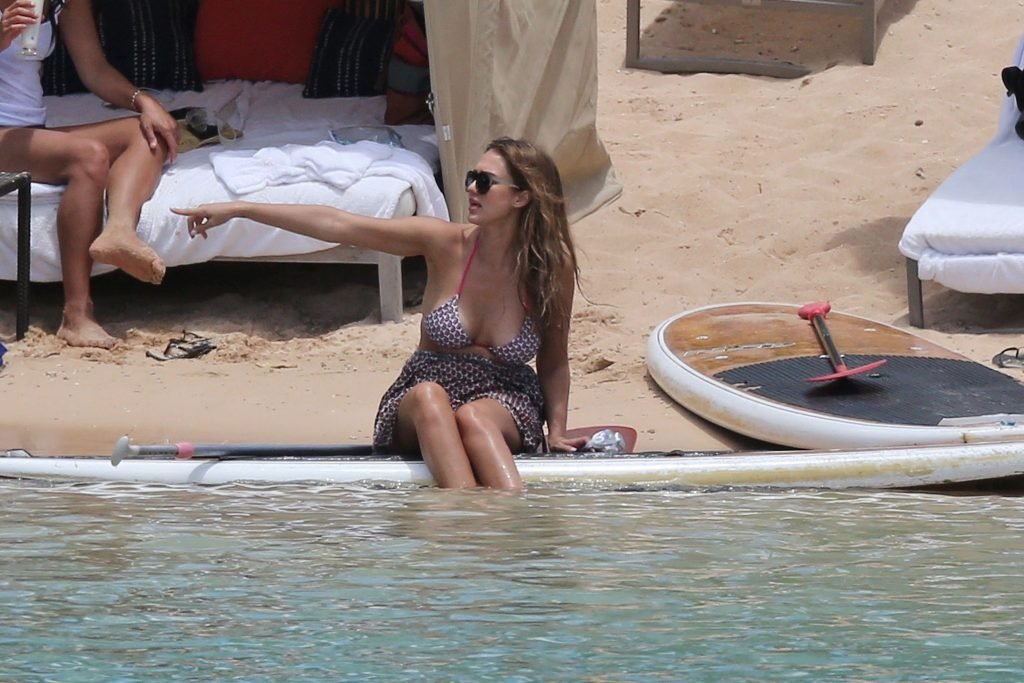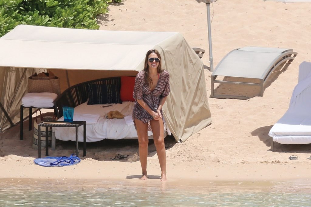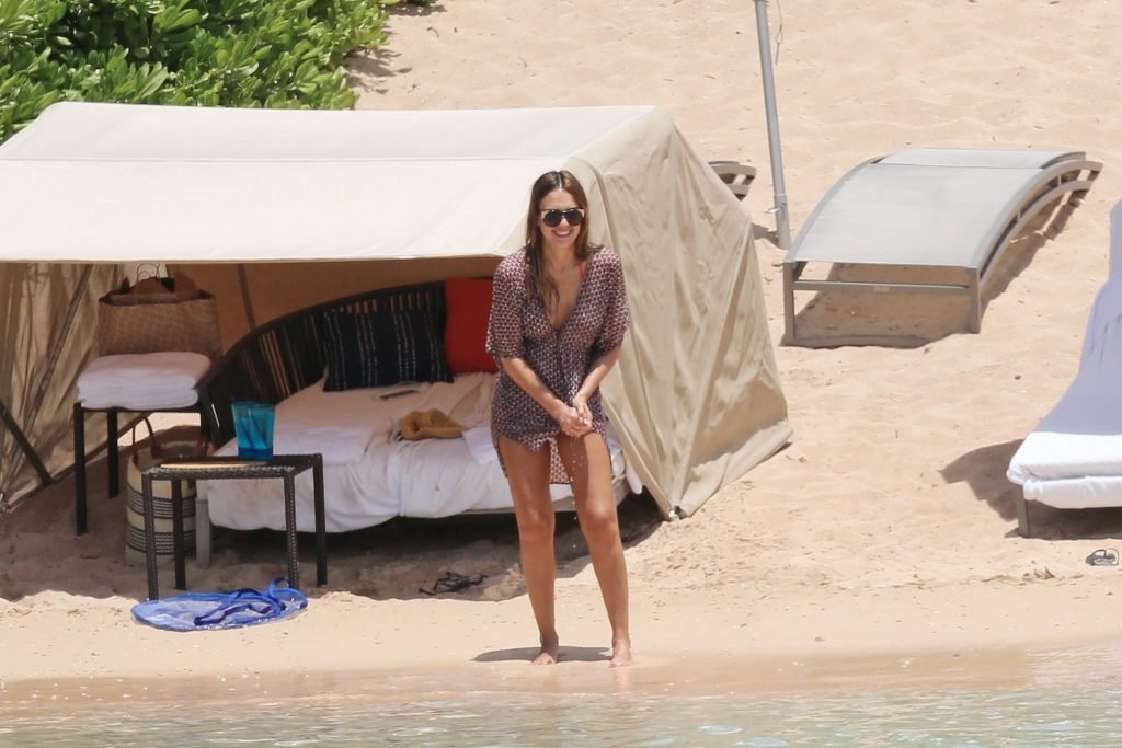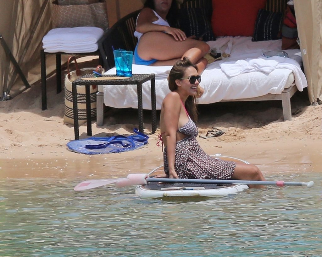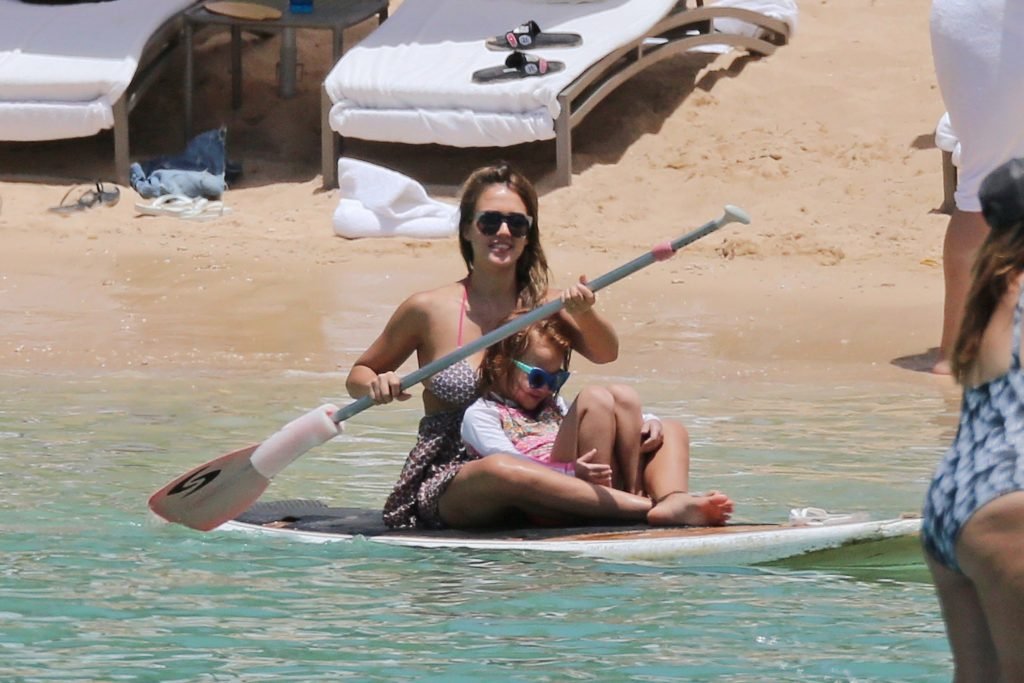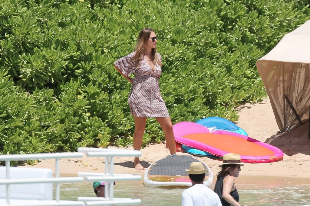 Jessica Alba vai à praia com uma pequena barriguinha de grávida. A estrela morena está de férias com sua família, 17/07/2017.