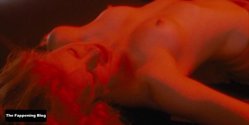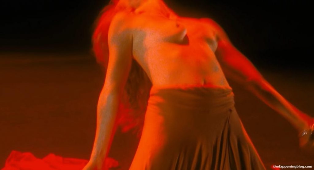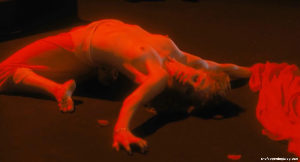 Jessica Chastain of Interstellar fame is performing a belly dance on a stage shaking her breasts wildly under her red top until they start to pop out causing her to rip off her top and bra and toss them to the side and then roll around on the ground topless continuing to shake and jiggle her breasts while arching her back until finally she collapses onto her back in exhaustion giving us a much better look at her breasts as she breathes heavily all while a group of people on a stage watch her and talk.