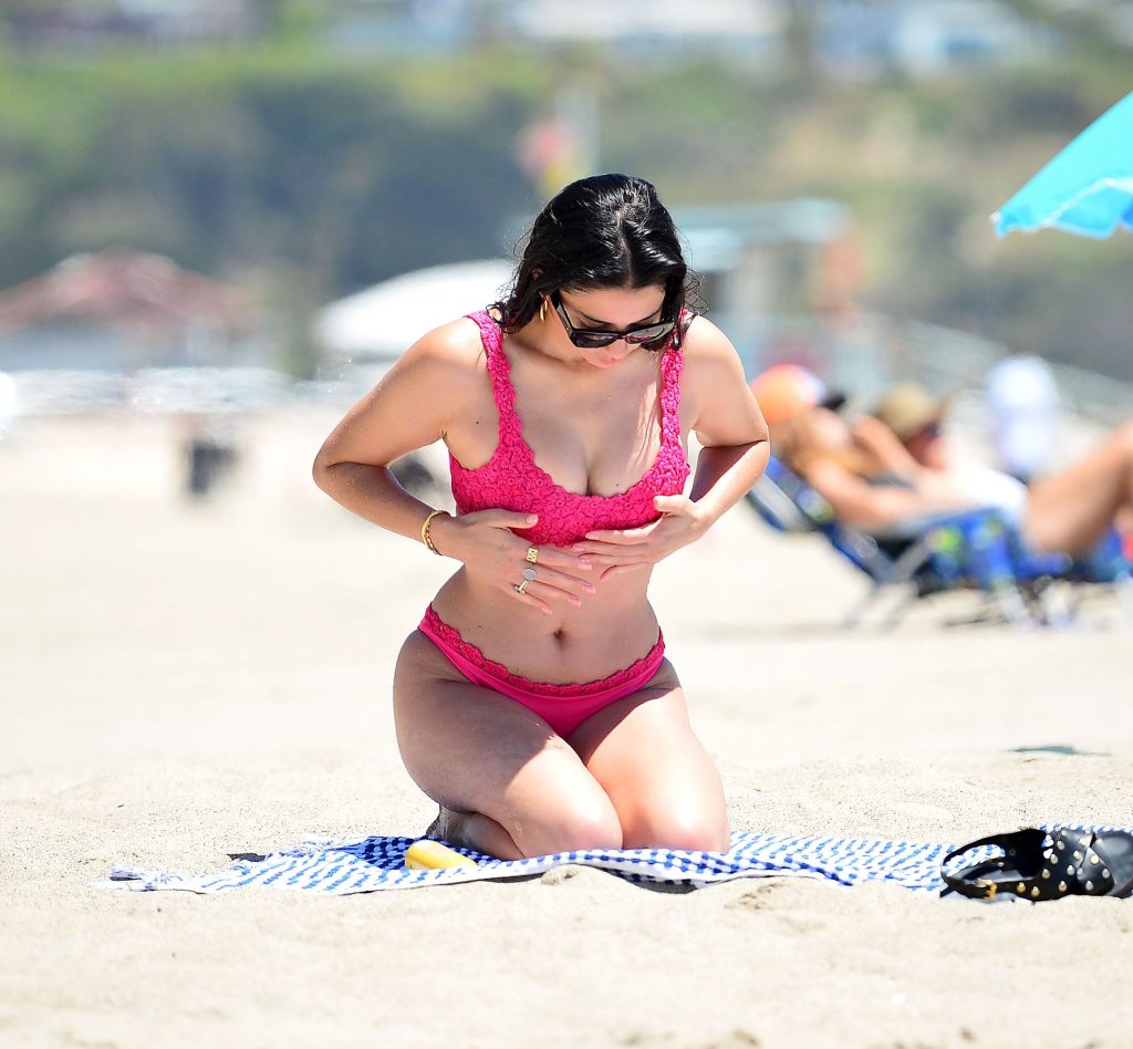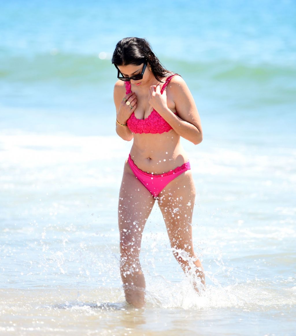 A modelo australiana Jessica Gomes usa um biquíni rosa brilhante e pequeno da She Made Me enquanto se refresca no oceano durante um dia na praia, 16/07/2020.