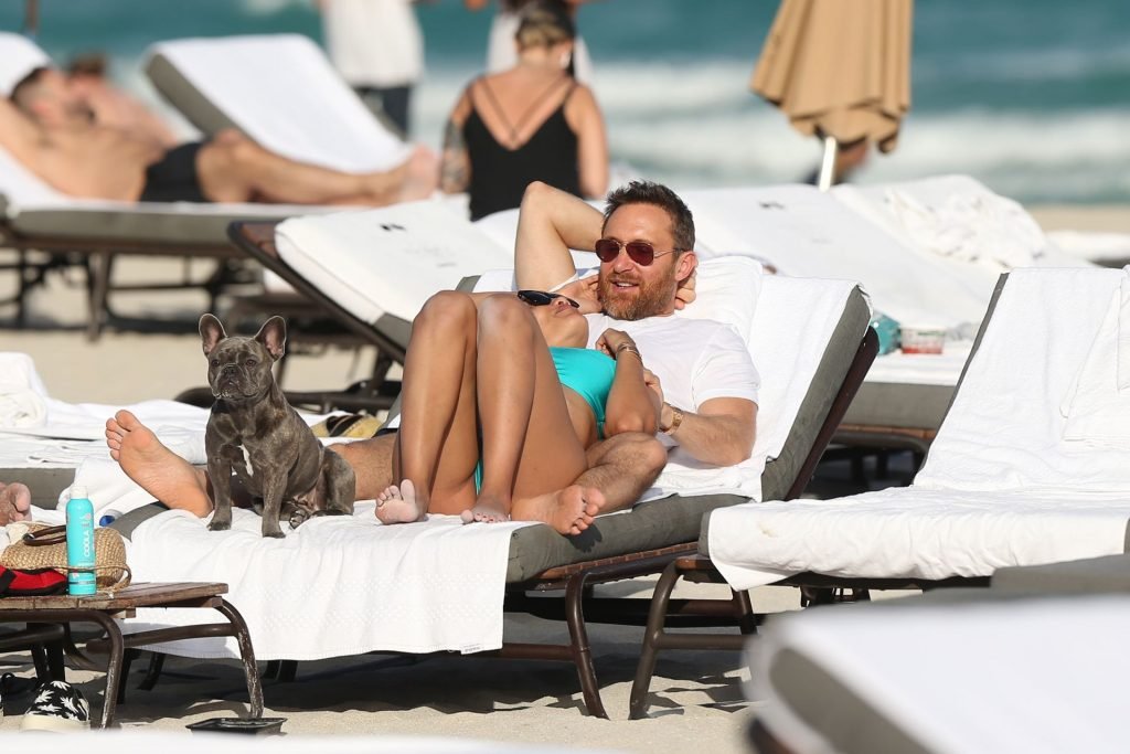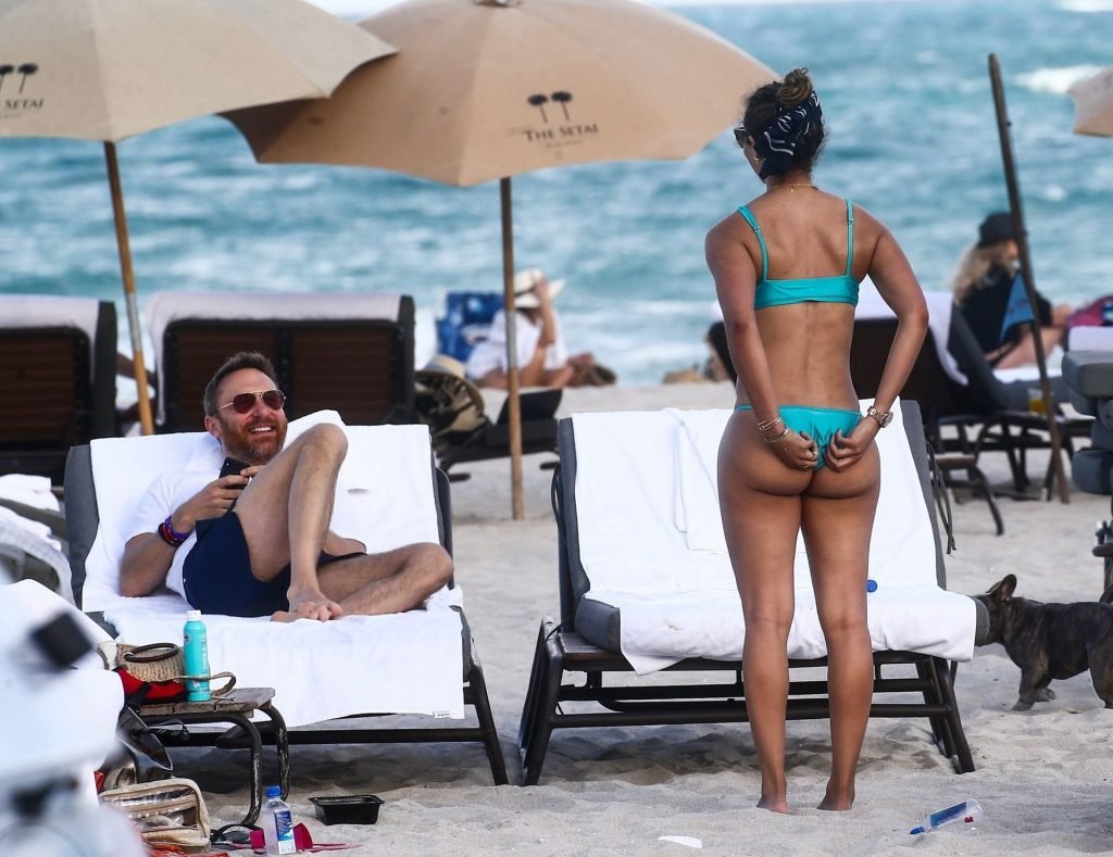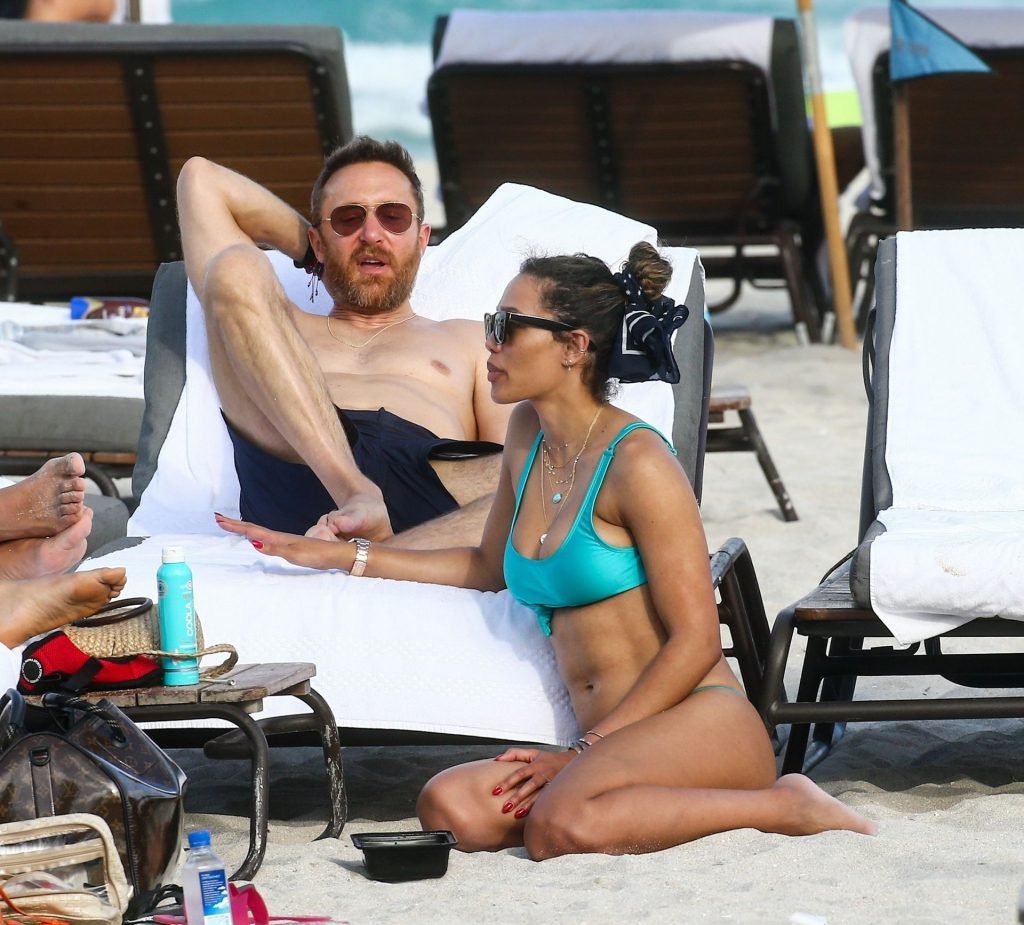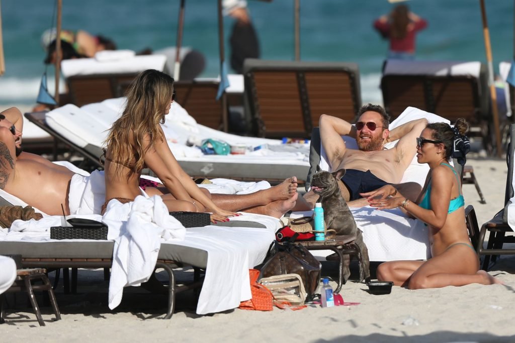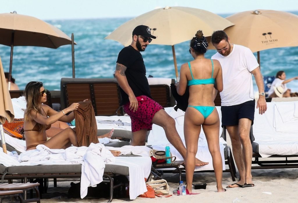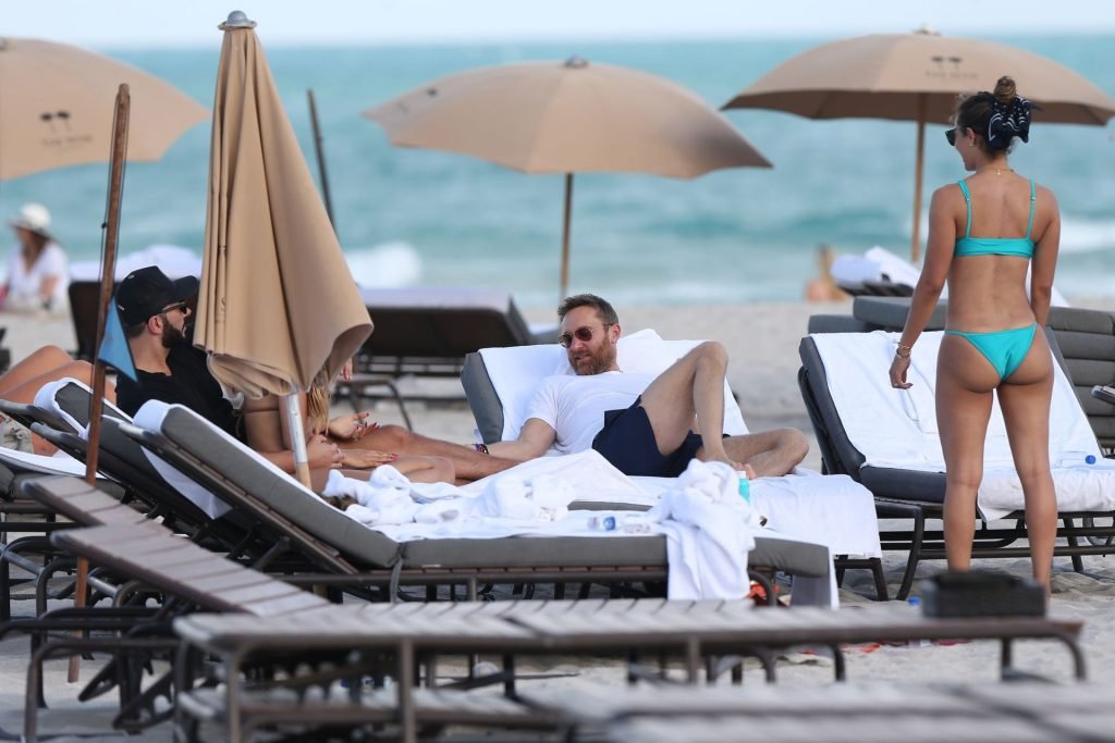 Os DJs famosos David Guetta e Cedric Gervais tiveram um dia na praia cheio de demonstrações públicas de afeto com suas noivas em Miami Beach, 09/03/2019. Guetta estava acompanhado de sua deslumbrante namorada Jessica Ledon e seu filhote, enquanto a modelo colombiana Ariadna Gutiérrez juntou-se a Gervais.