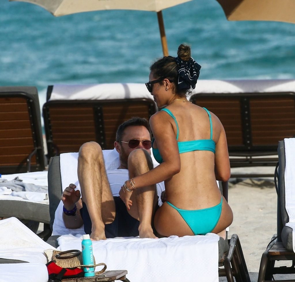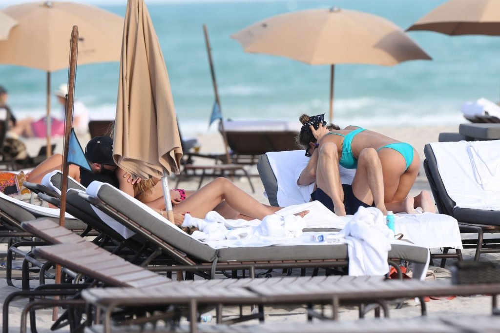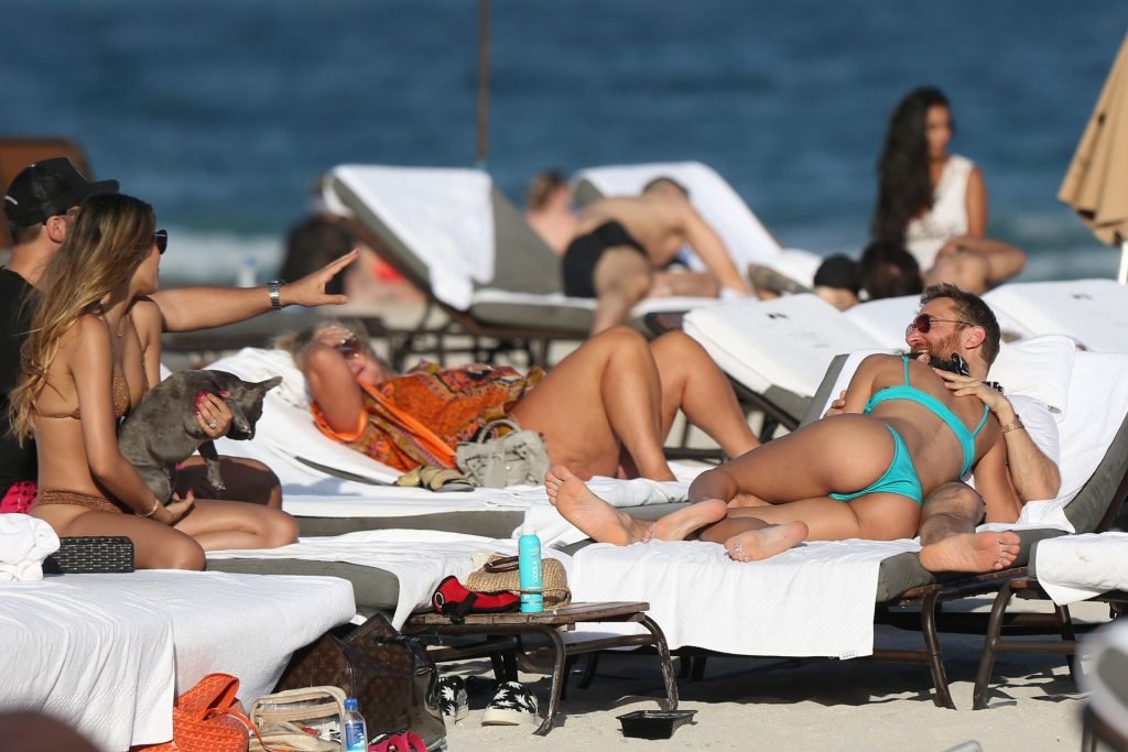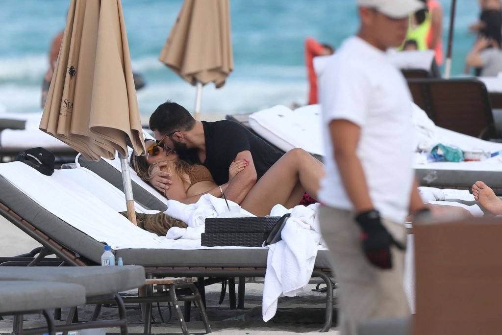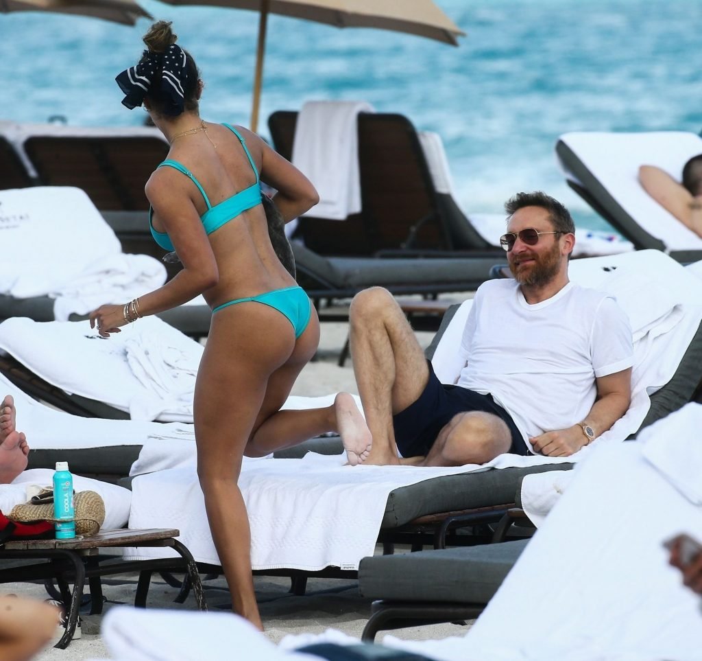 Os DJs famosos David Guetta e Cedric Gervais tiveram um dia na praia cheio de demonstrações públicas de afeto com suas noivas em Miami Beach, 09/03/2019. Guetta estava acompanhado de sua deslumbrante namorada Jessica Ledon e seu filhote, enquanto a modelo colombiana Ariadna Gutiérrez juntou-se a Gervais.
