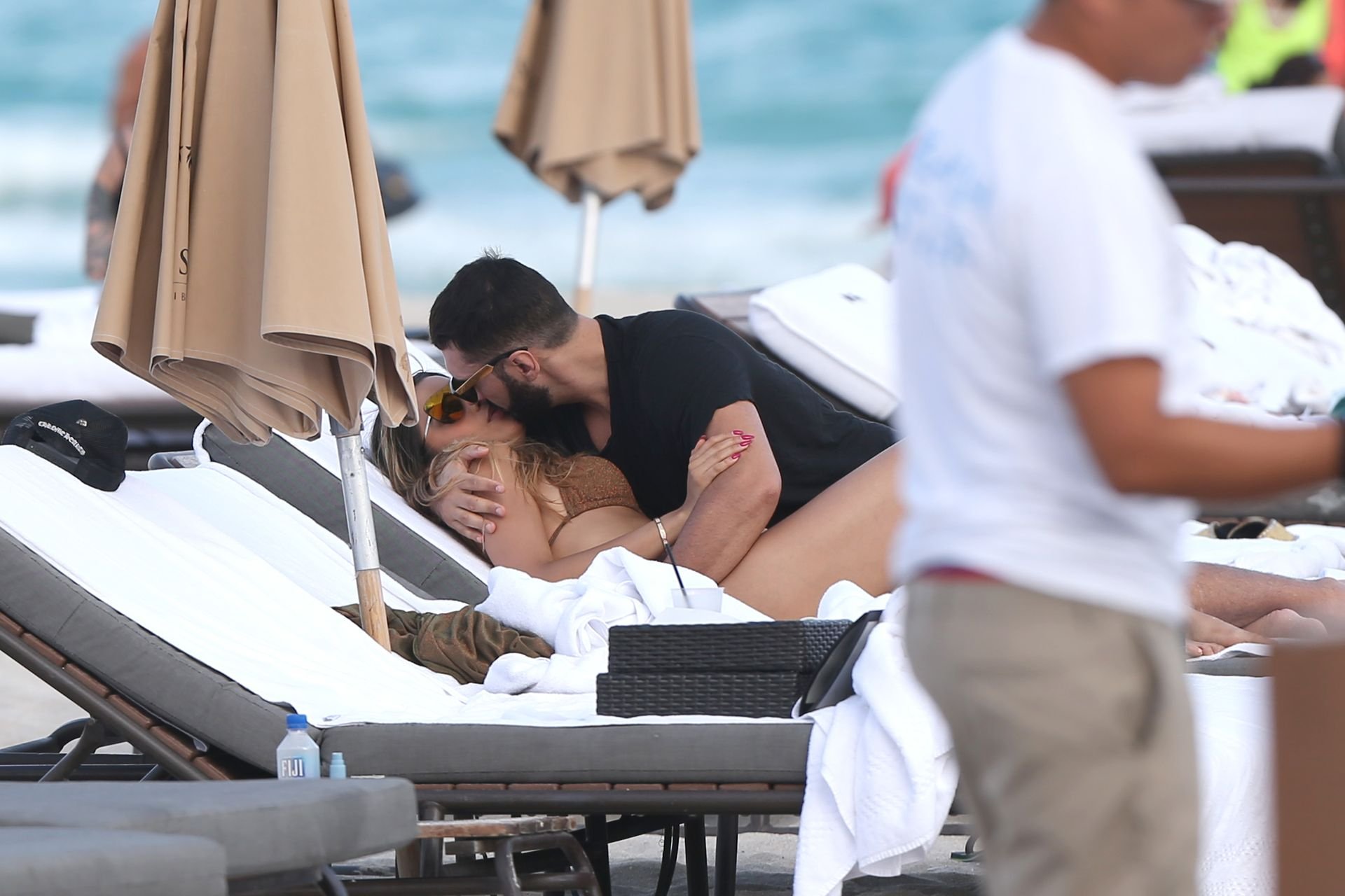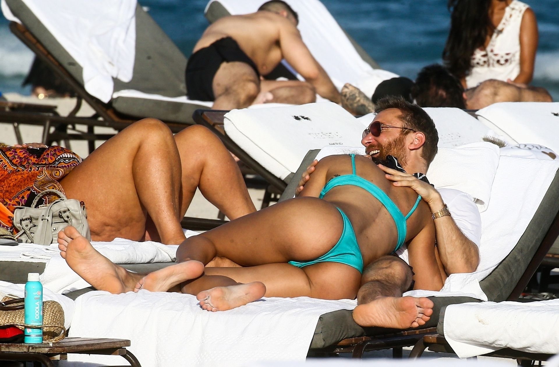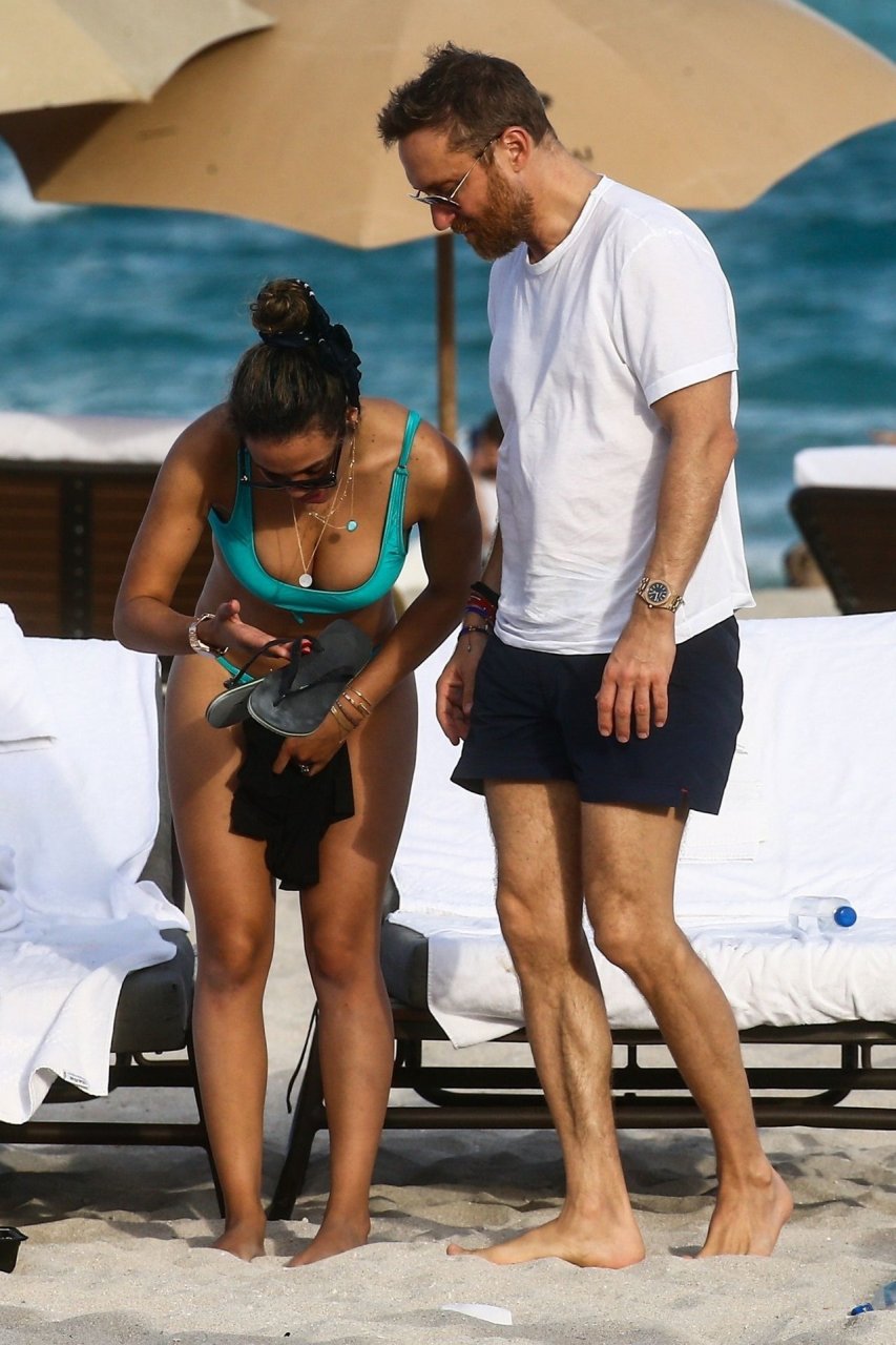 Os DJs famosos David Guetta e Cedric Gervais tiveram um dia na praia cheio de demonstrações públicas de afeto com suas noivas em Miami Beach, 09/03/2019. Guetta estava acompanhado de sua deslumbrante namorada Jessica Ledon e seu filhote, enquanto a modelo colombiana Ariadna Gutiérrez juntou-se a Gervais.