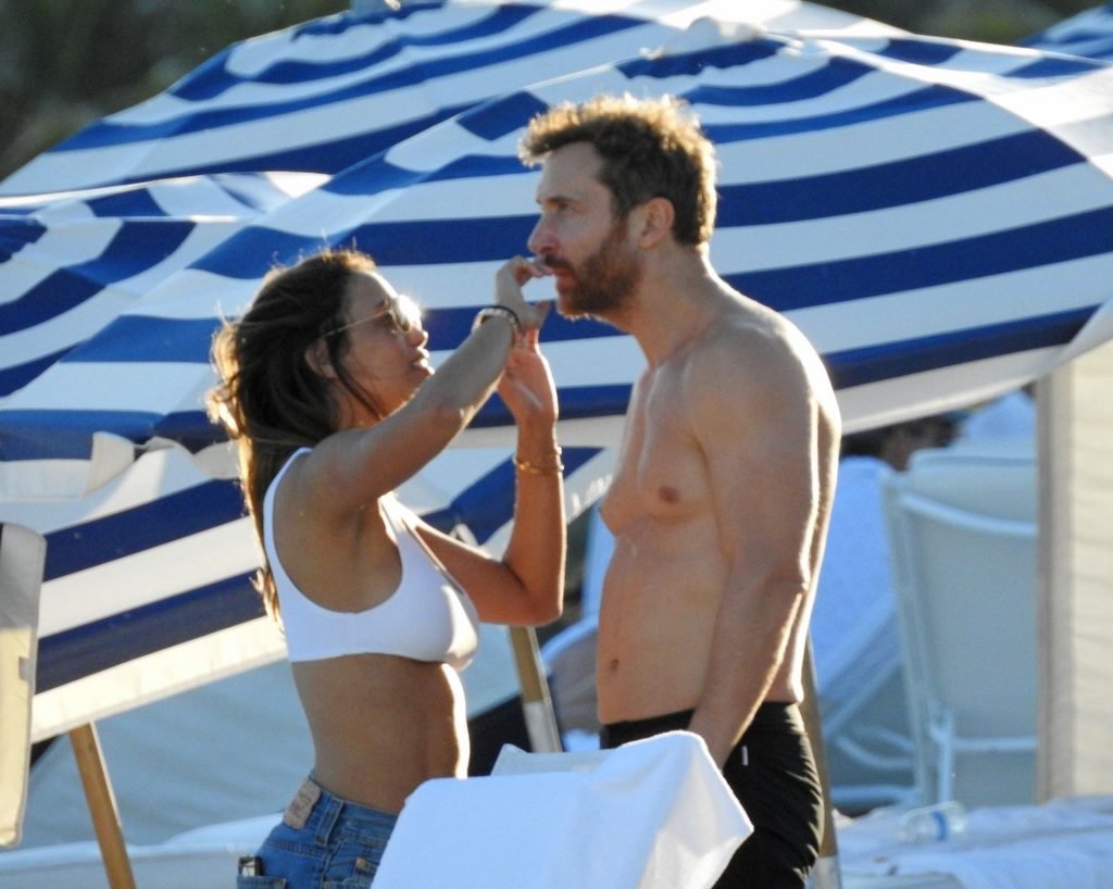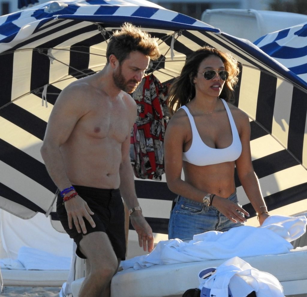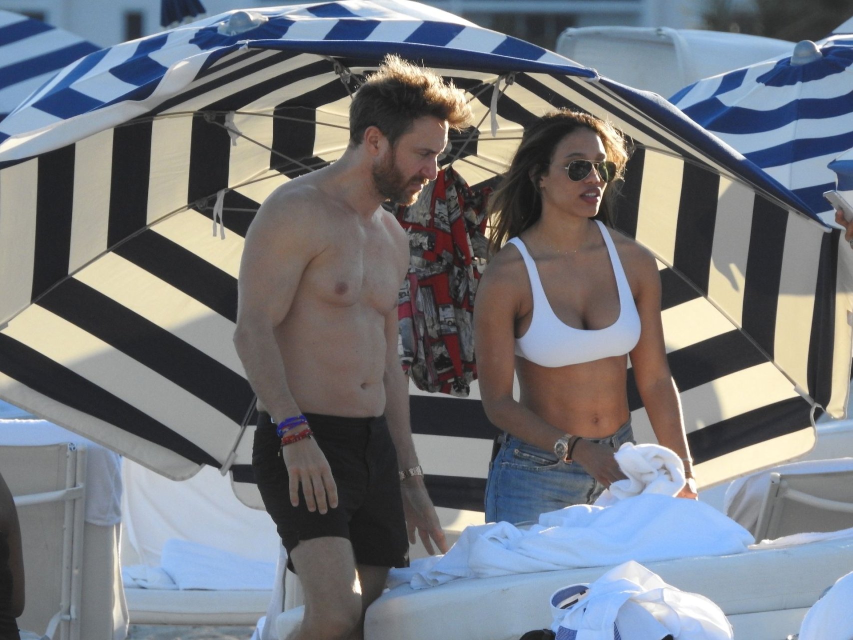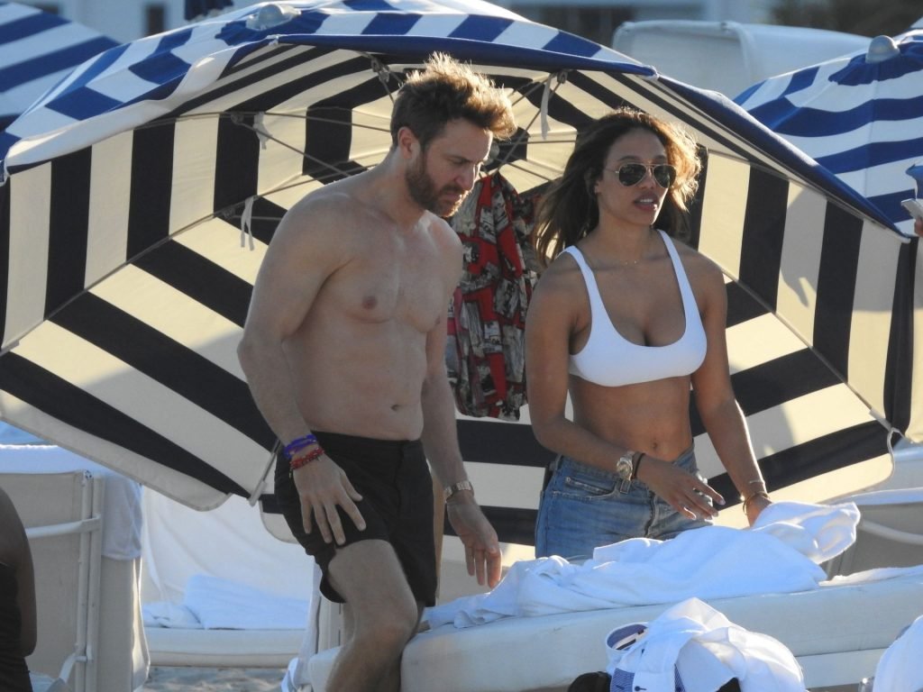 O DJ francês e ícone da pop/dance David Guetta foi fotografado parecendo mais em forma do que nunca, sem camisa, aos 50 anos, no dia de Natal na praia em Miami, 25/12/2017. Ele foi visto abraçando e acariciando sua linda namorada, a modelo latina Jessica Ledon. Embora ela seja muito mais jovem, eles pareciam adoráveis enquanto se abraçavam e posavam juntos, e ela também o ajudou a aplicar loção no nariz.