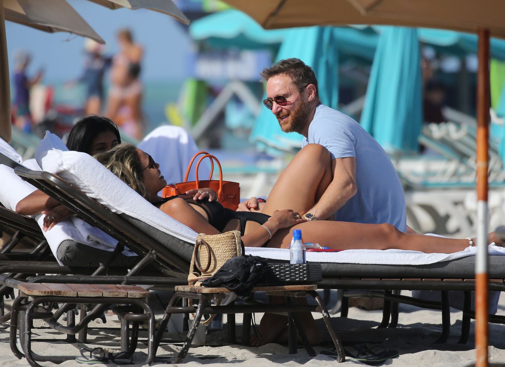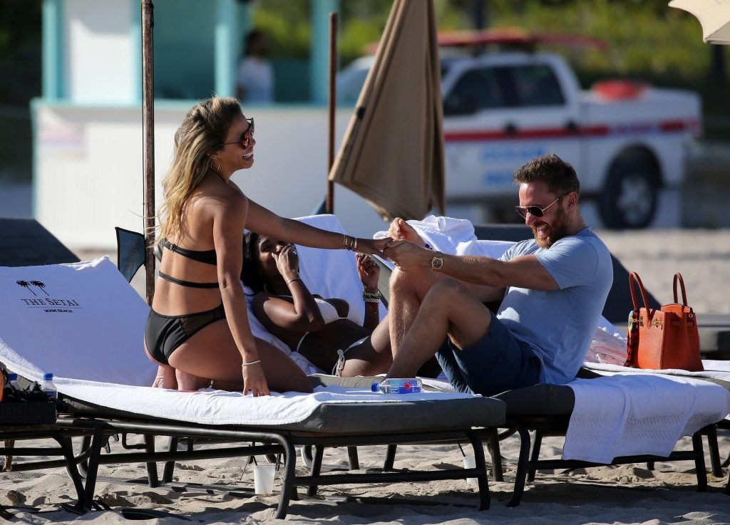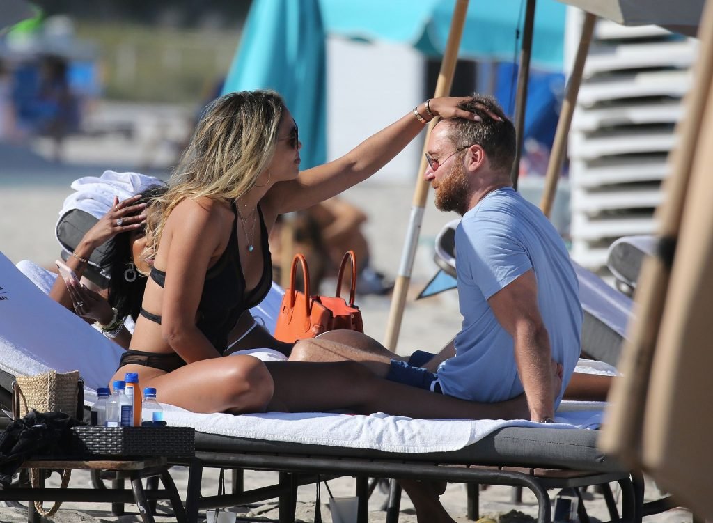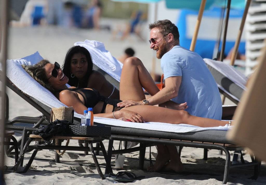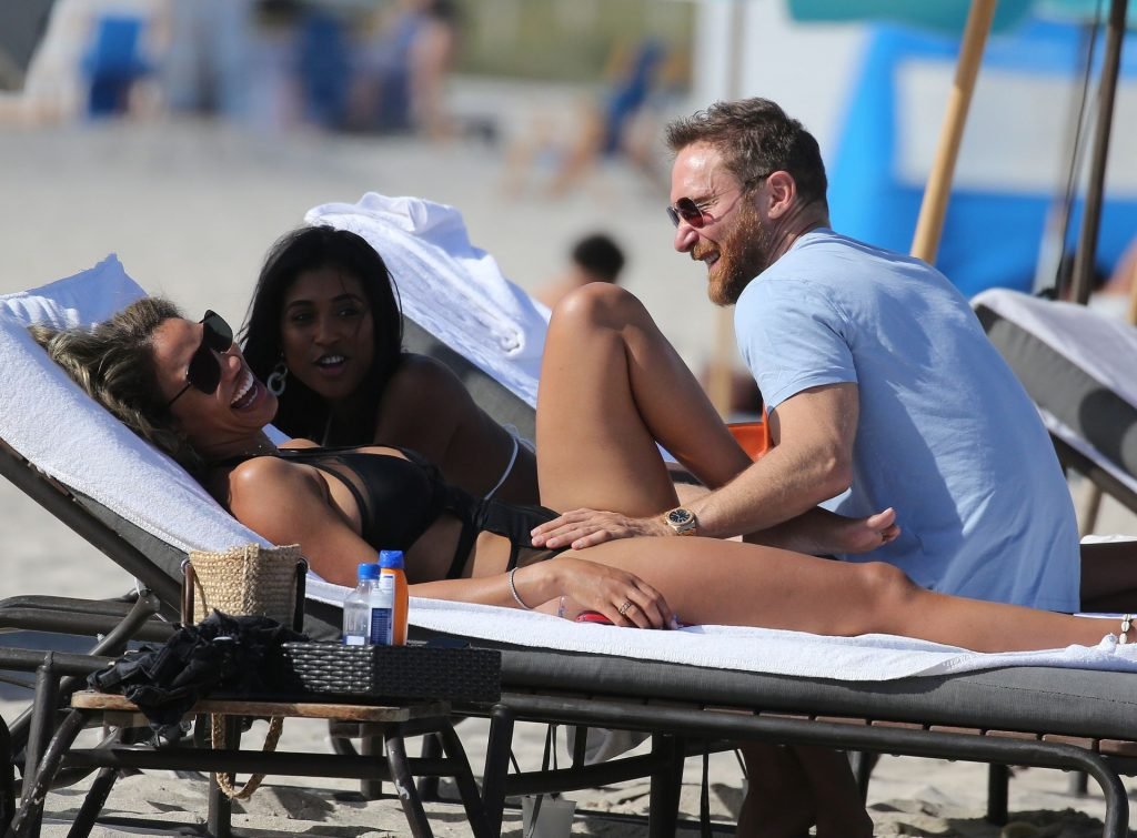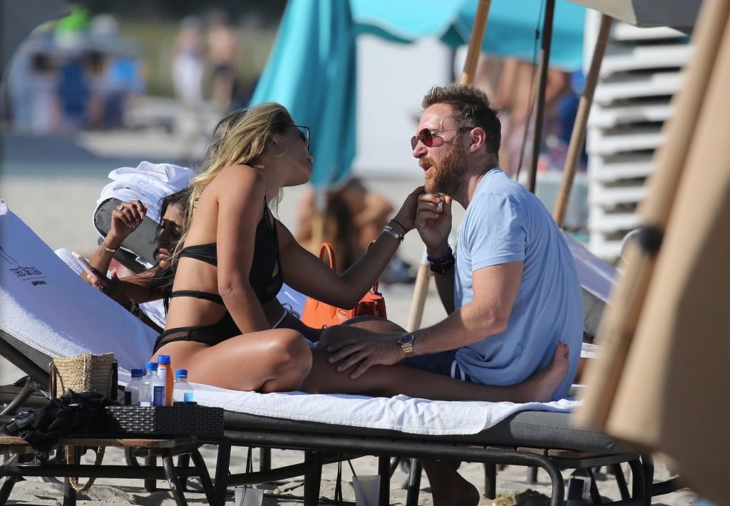 DJ mundialmente famoso David Guetta não consegue tirar as mãos da namorada Jessica Ledon na praia em Miami, 30/03/2019.