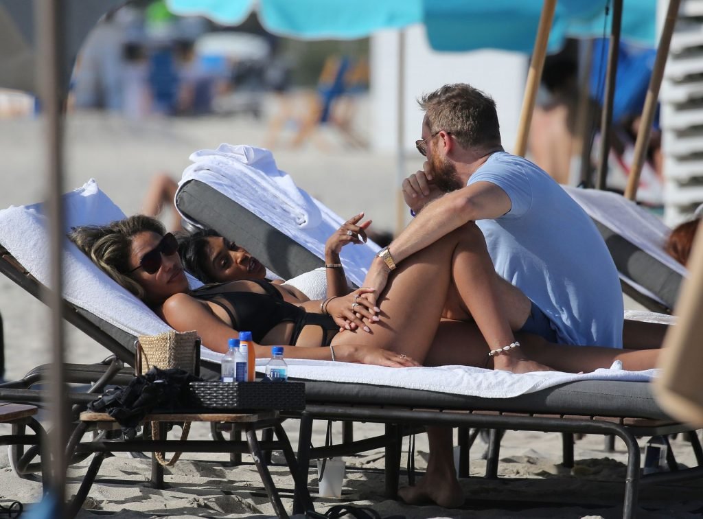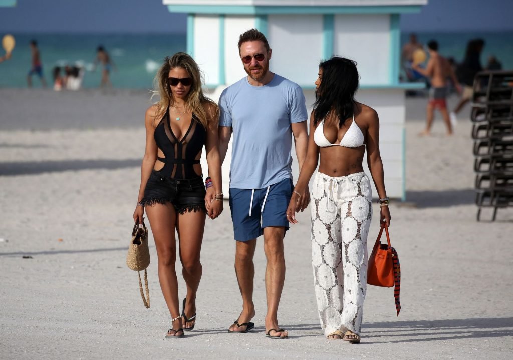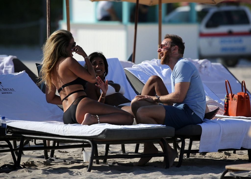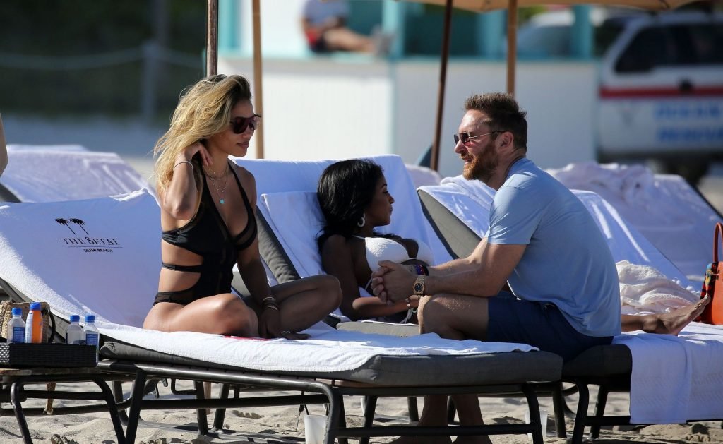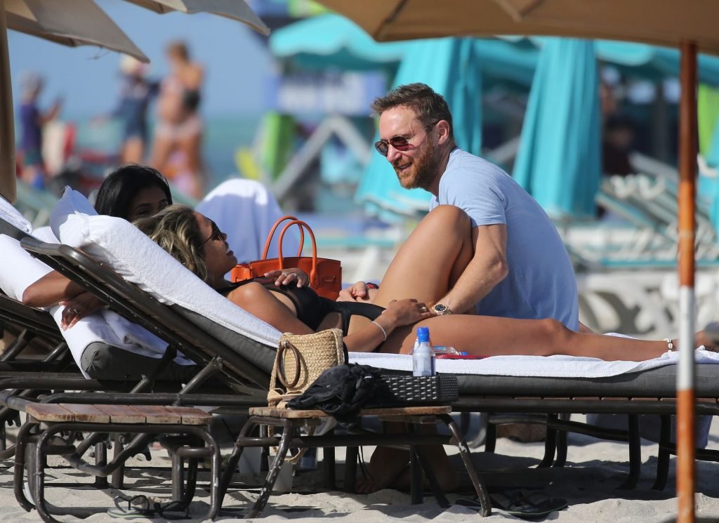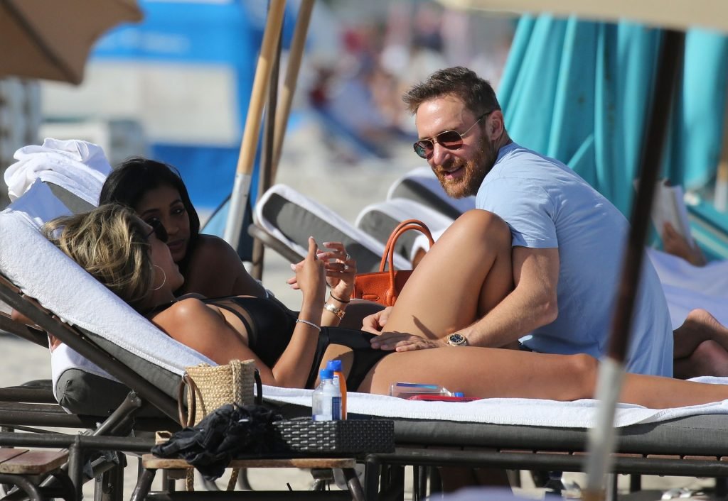 DJ mundialmente famoso David Guetta não consegue tirar as mãos da namorada Jessica Ledon na praia em Miami, 30/03/2019.