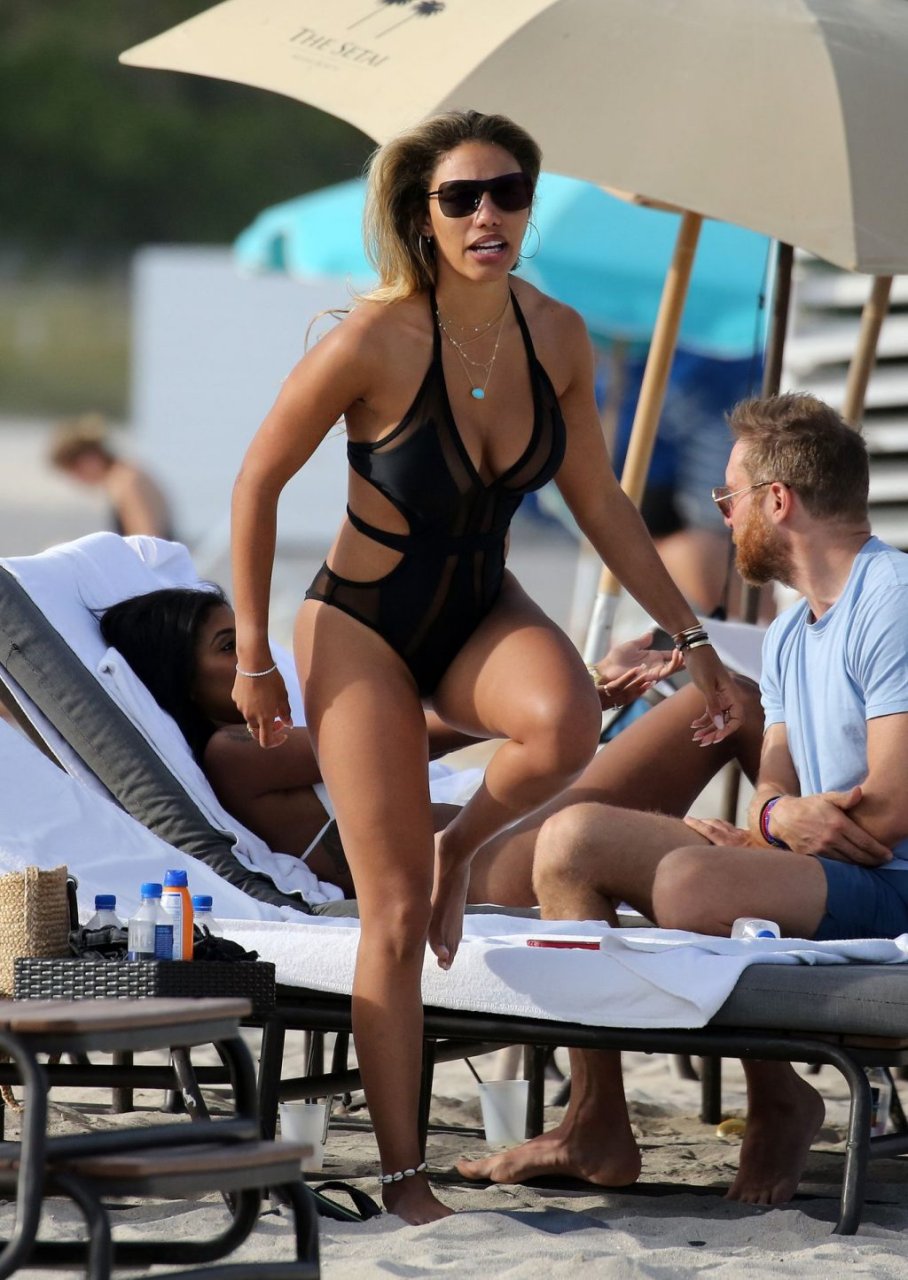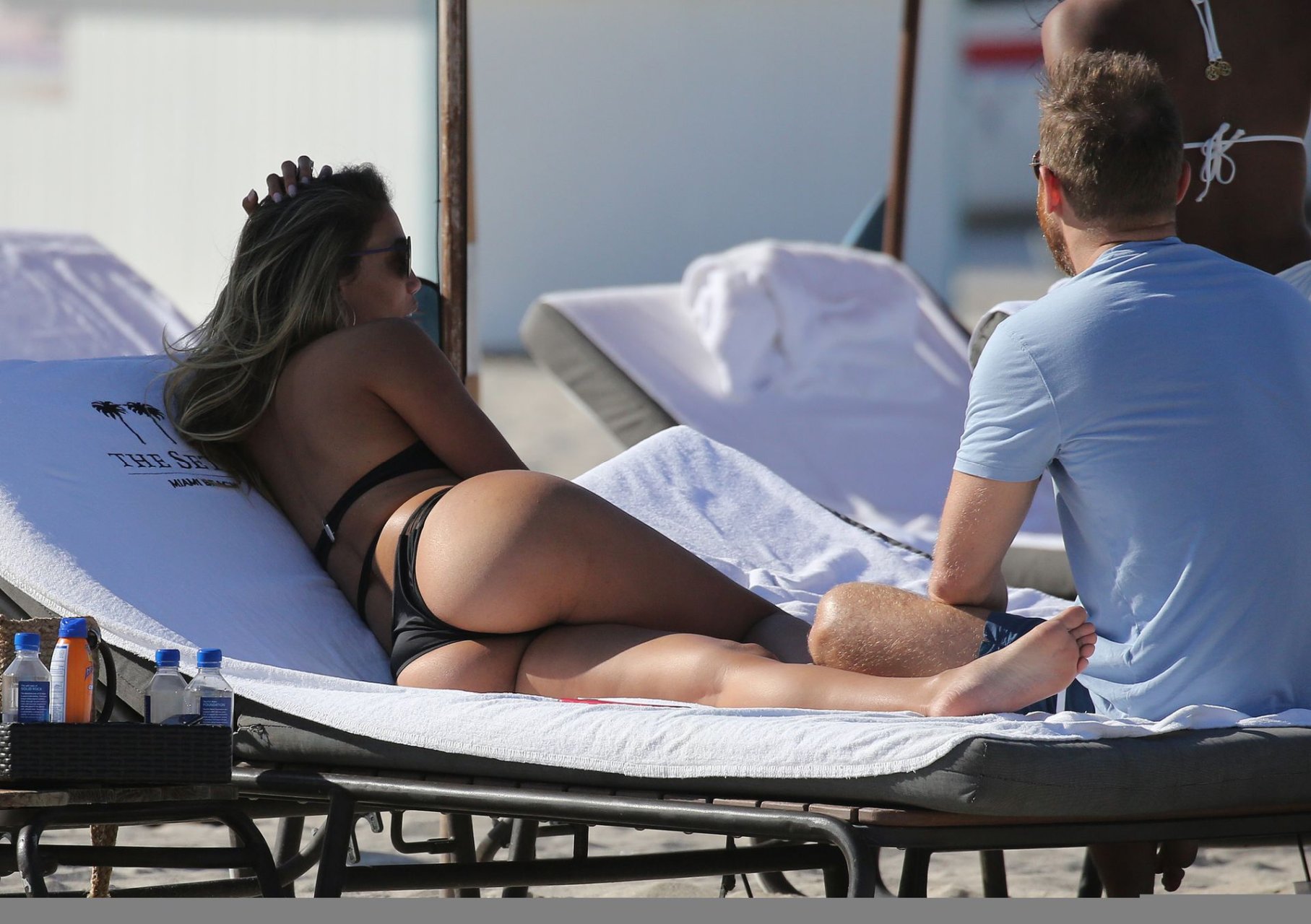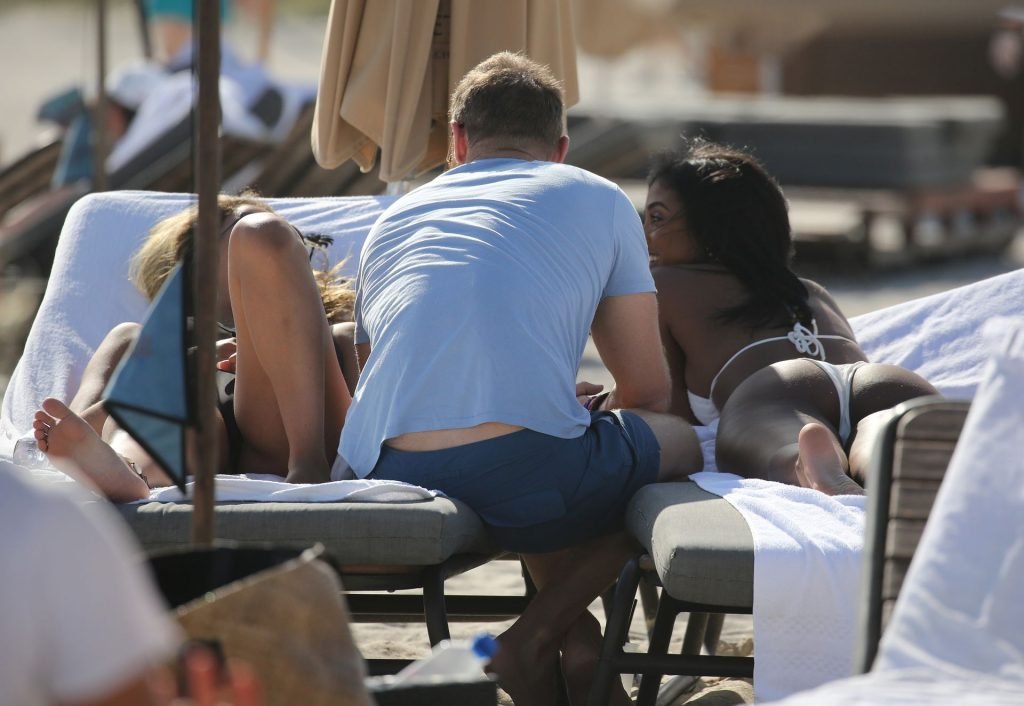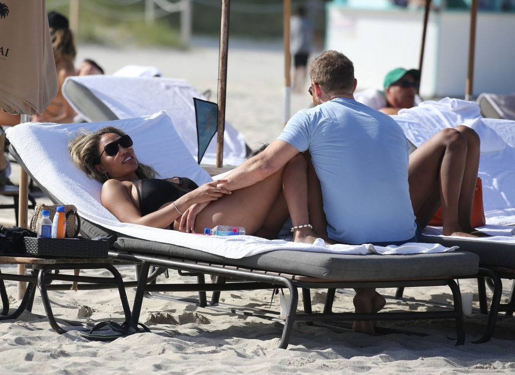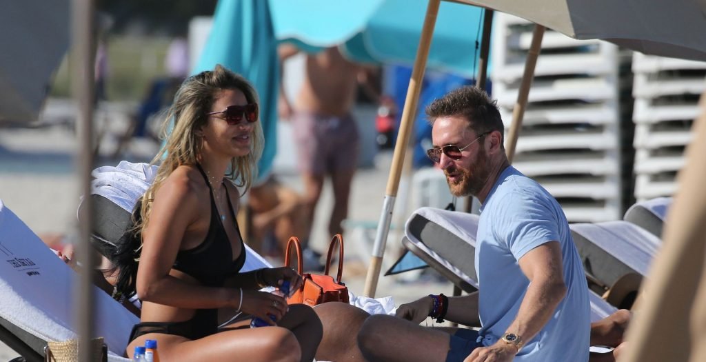 DJ mundialmente famoso David Guetta não consegue tirar as mãos da namorada Jessica Ledon na praia em Miami, 30/03/2019.