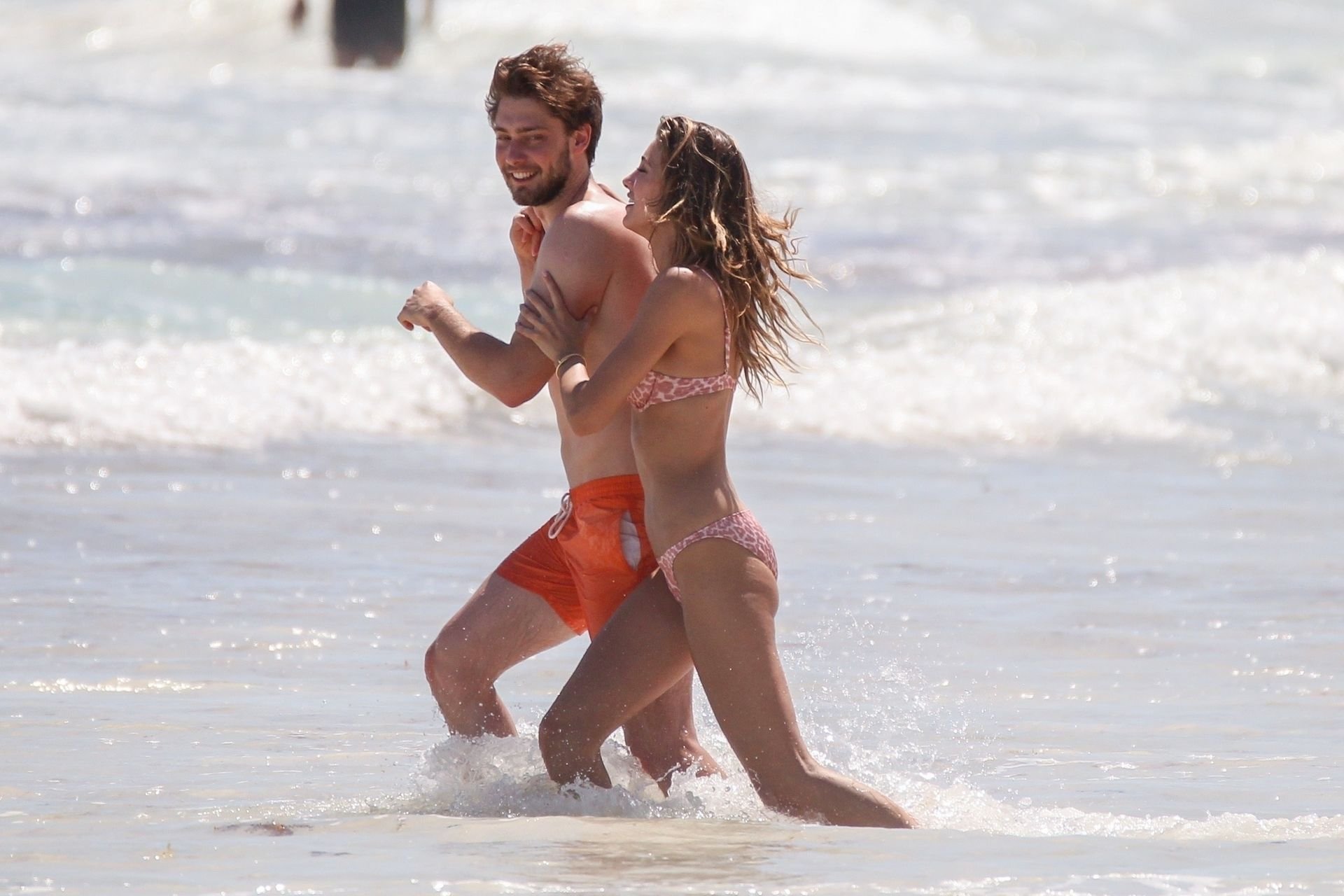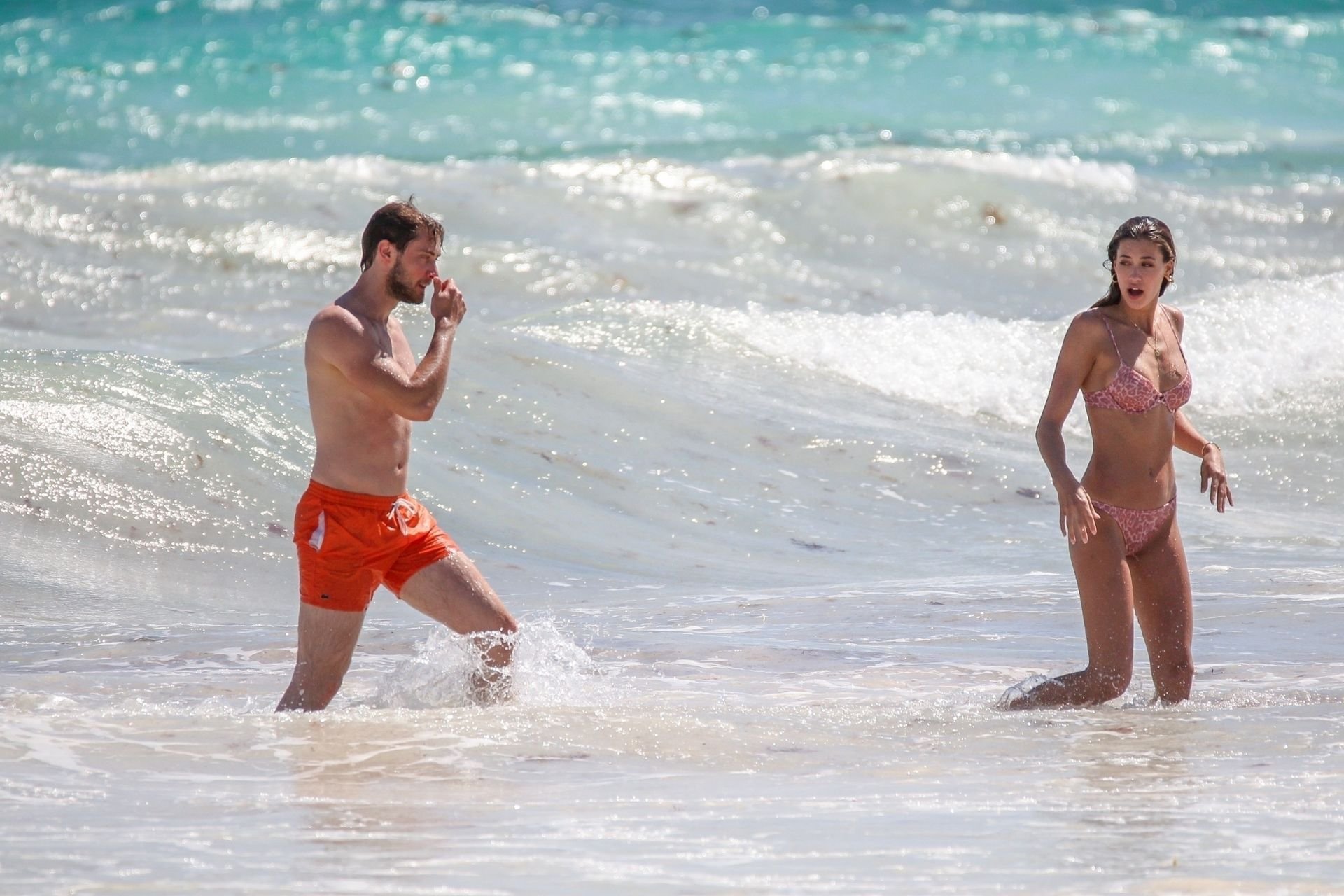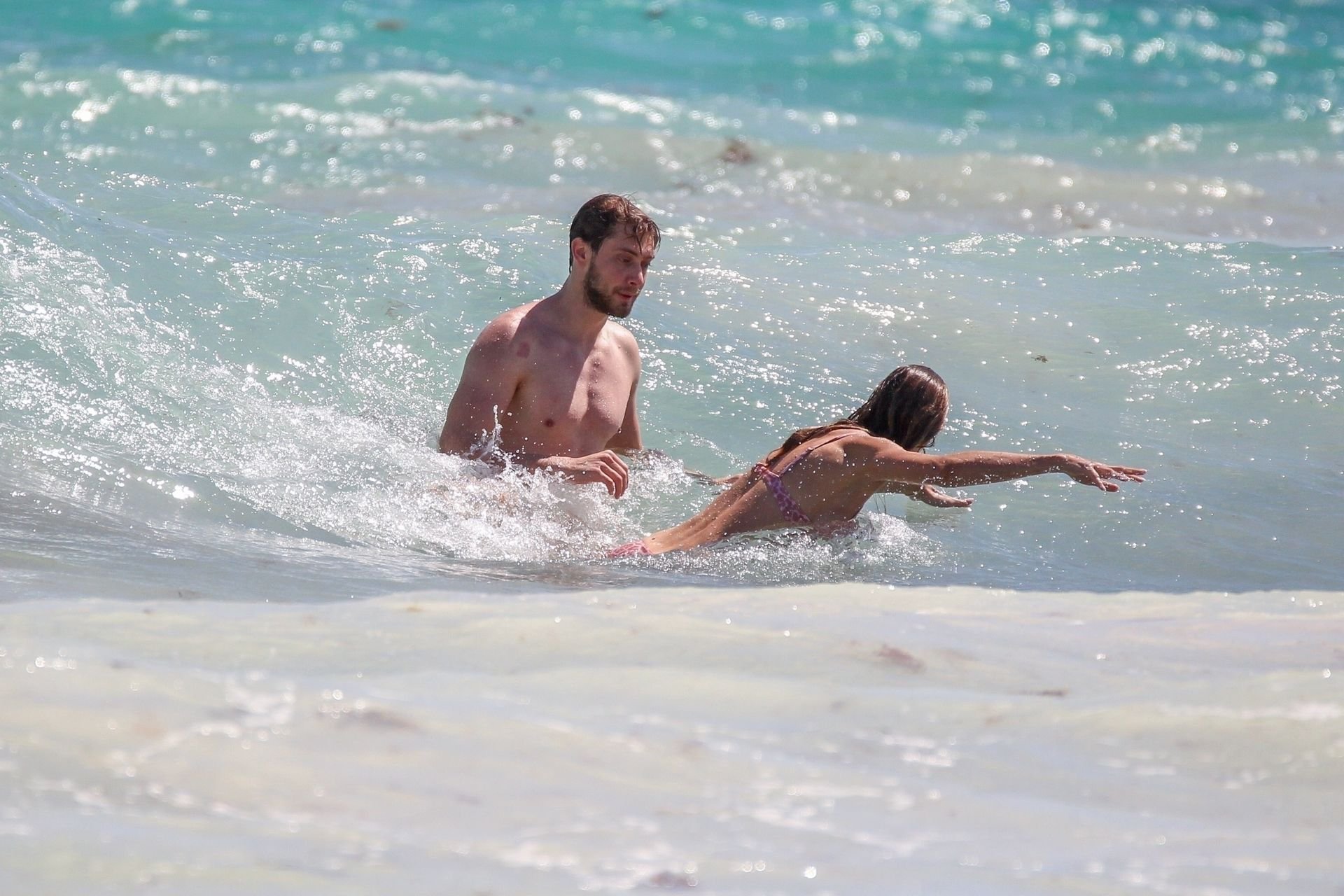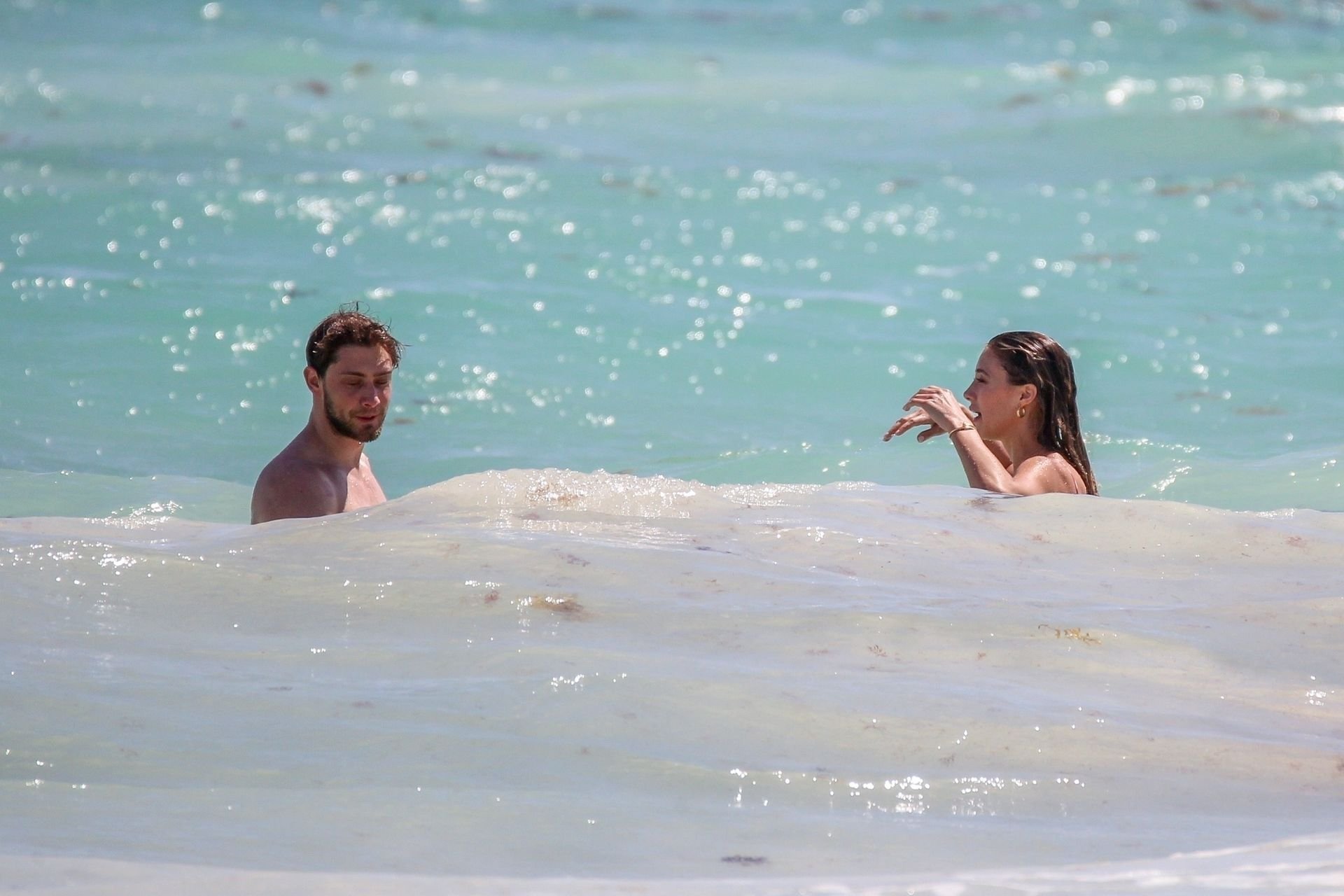 A atriz e modelo Jessica Serfaty passa um dia na praia com seu novo namorado em Tulum, México, 01/03/2019. A linda modelo brinca no oceano usando um biquíni sexy com estampa animal enquanto bronzeia-se com seu homem Kaan Gunay.