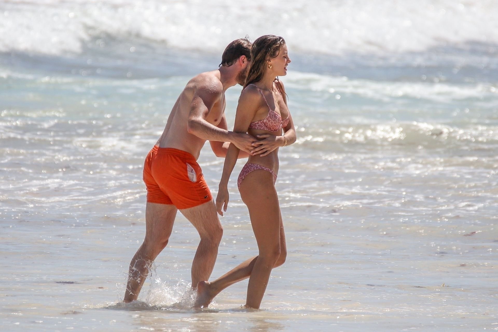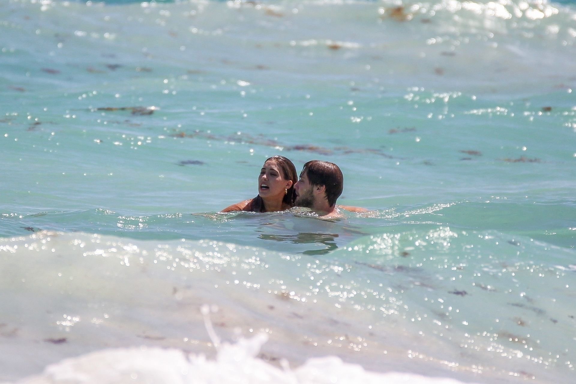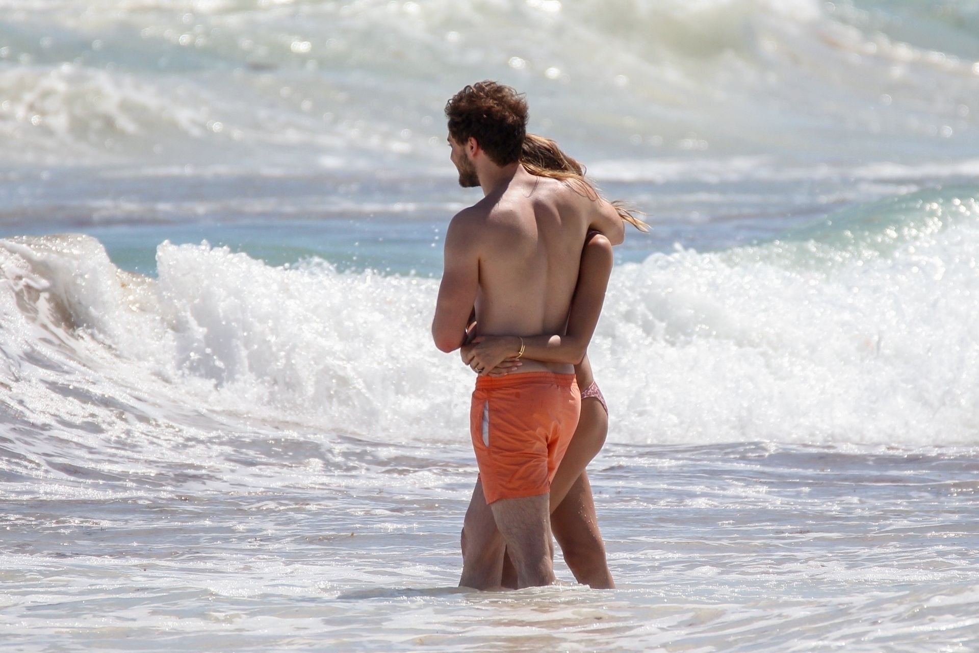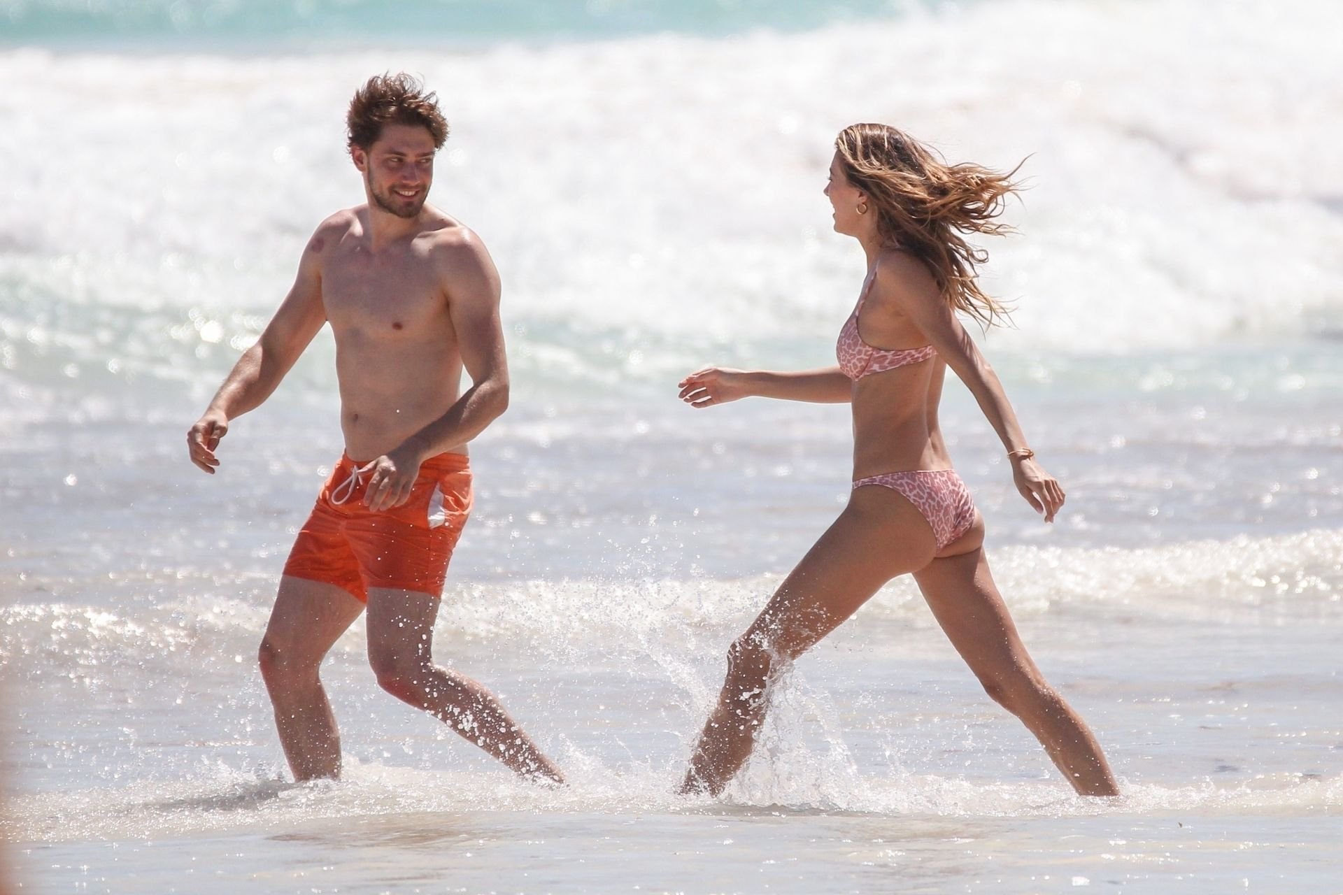 A atriz e modelo Jessica Serfaty passa um dia na praia com seu novo namorado em Tulum, México, 01/03/2019. A linda modelo brinca no oceano usando um biquíni sexy com estampa animal enquanto bronzeia-se com seu homem Kaan Gunay.