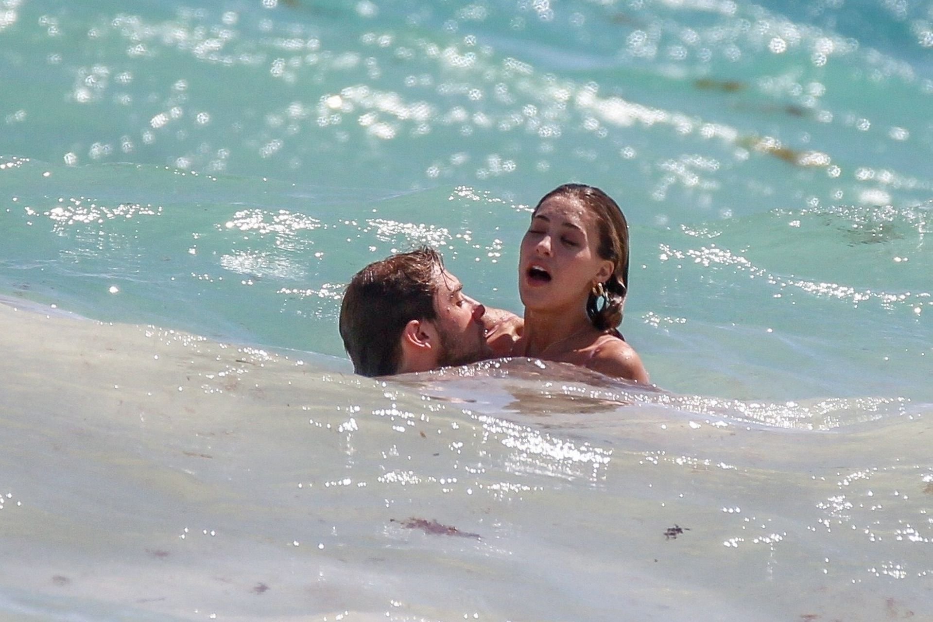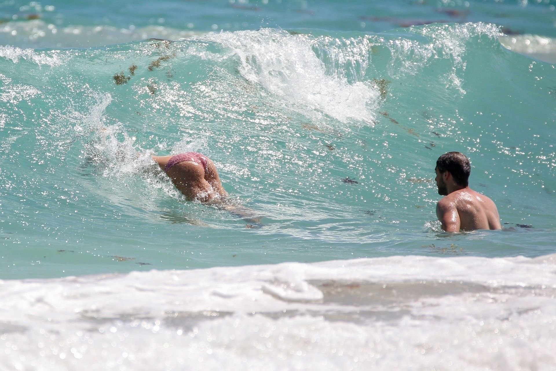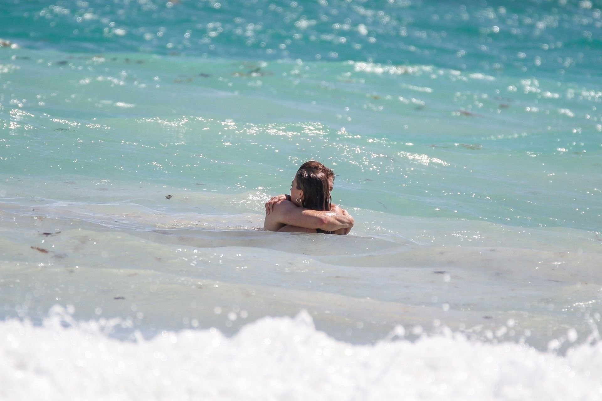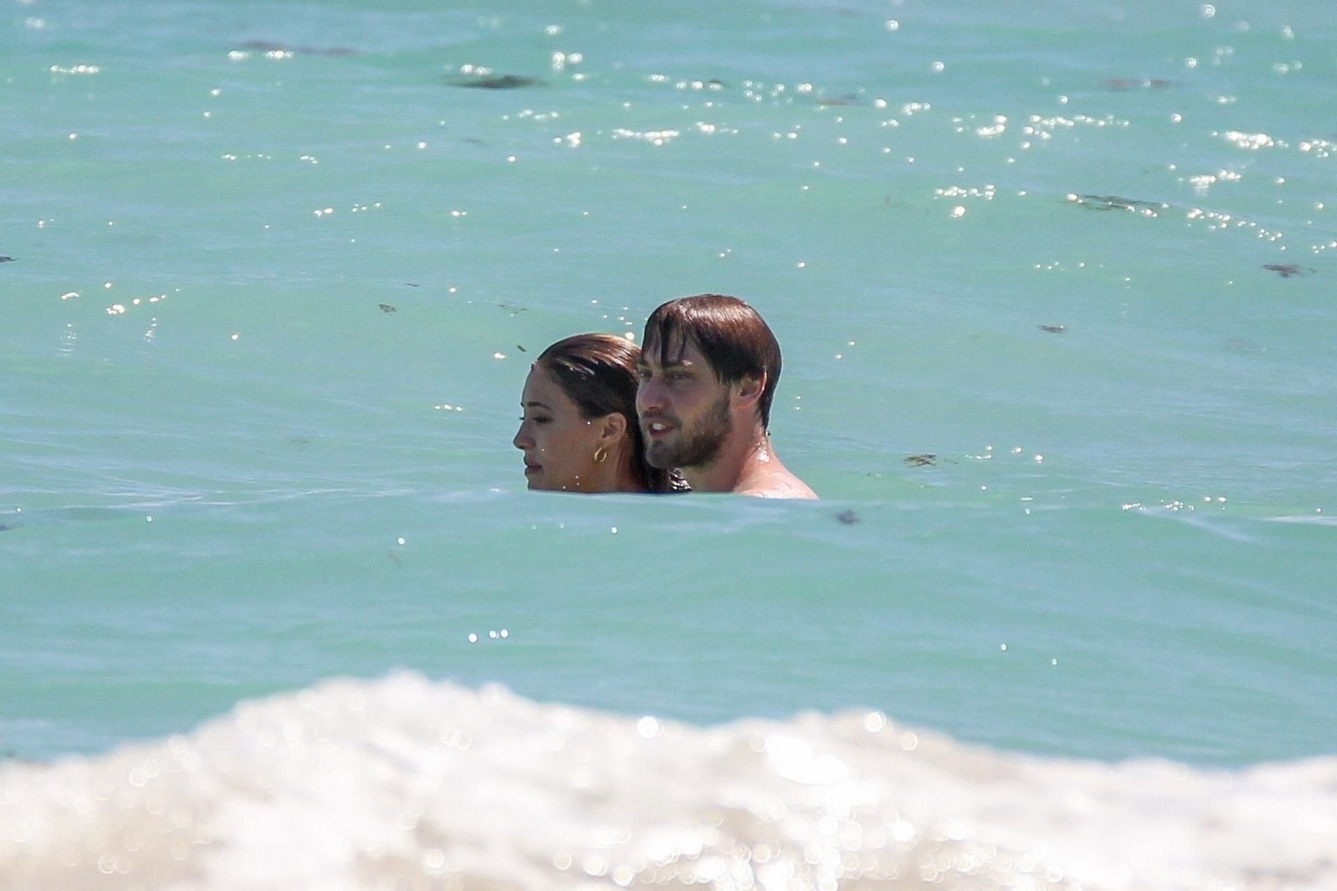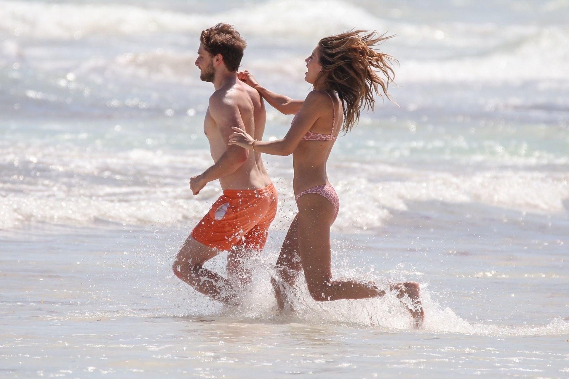 A atriz e modelo Jessica Serfaty passa um dia na praia com seu novo namorado em Tulum, México, 01/03/2019. A linda modelo brinca no oceano usando um biquíni sexy com estampa animal enquanto bronzeia-se com seu homem Kaan Gunay.