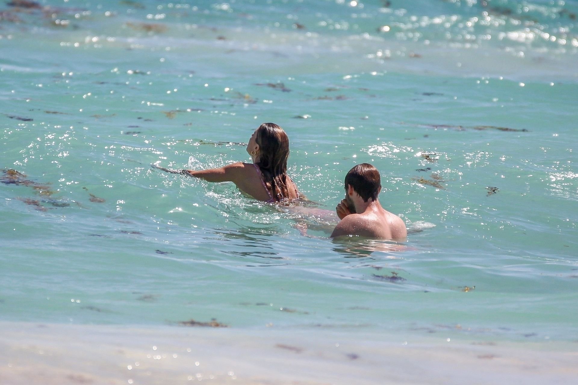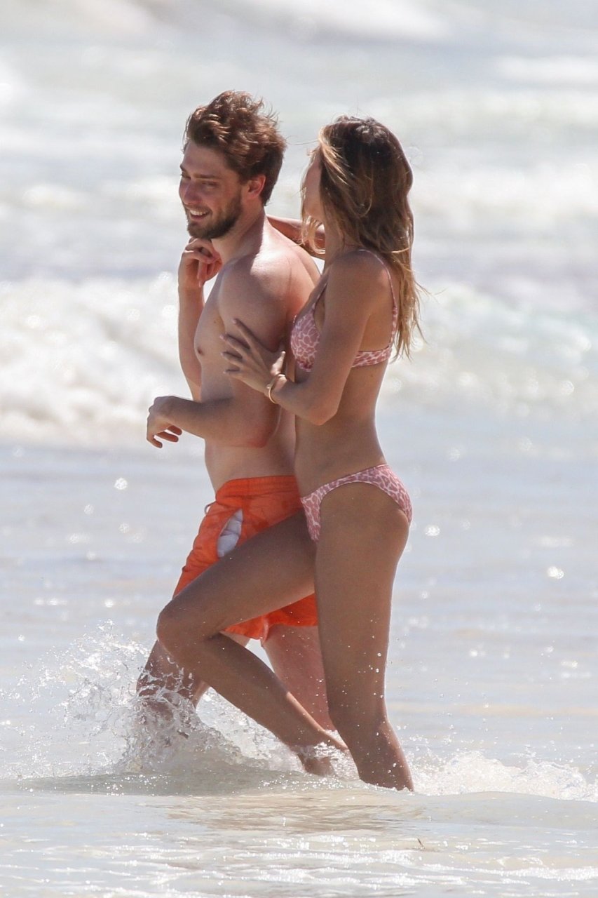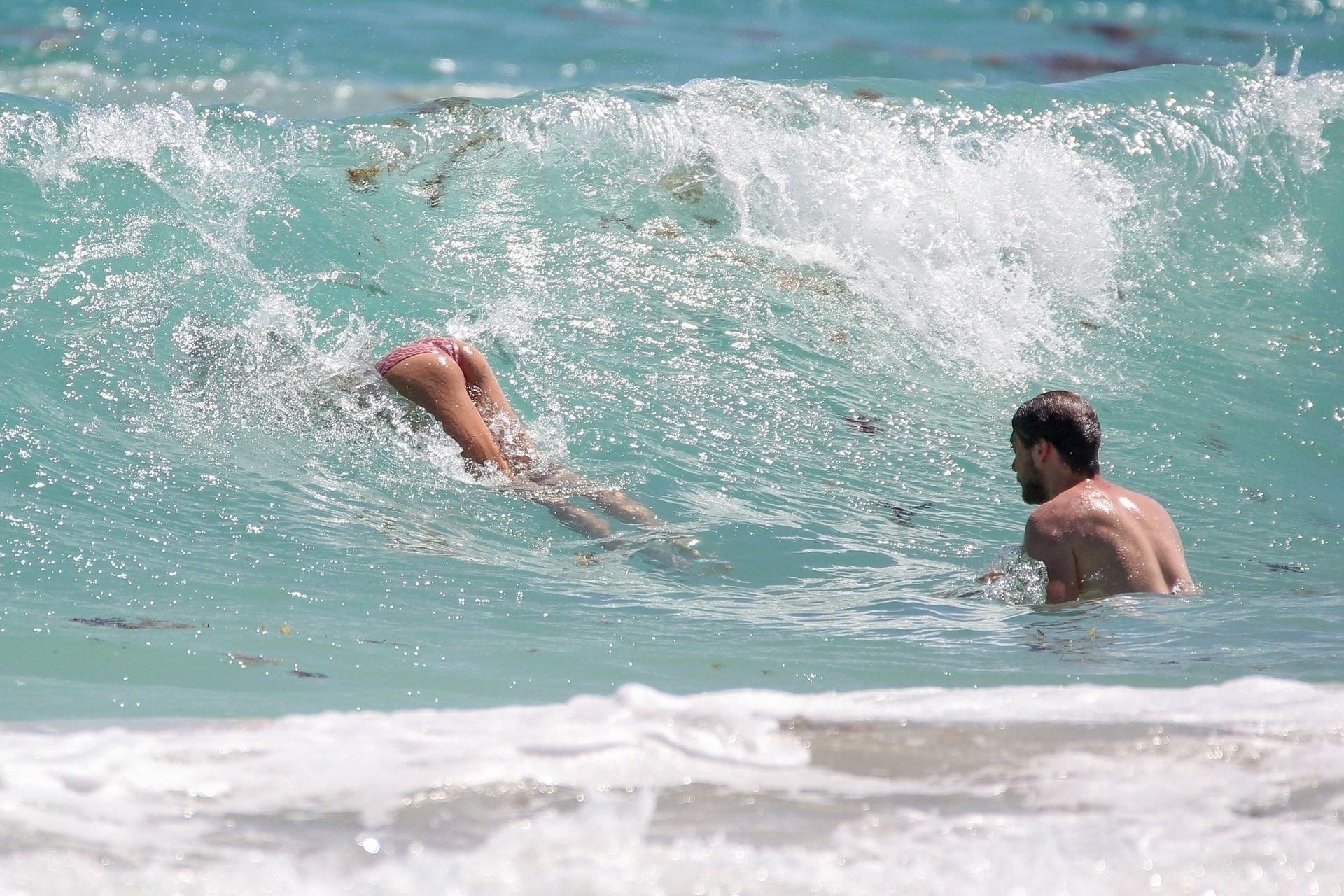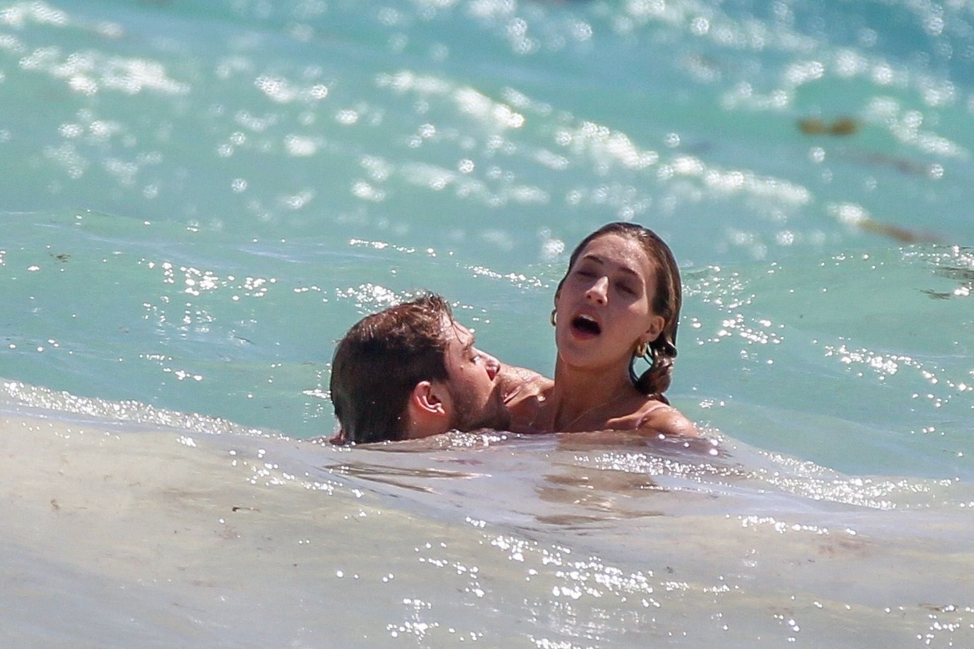 A atriz e modelo Jessica Serfaty passa um dia na praia com seu novo namorado em Tulum, México, 01/03/2019. A linda modelo brinca no oceano usando um biquíni sexy com estampa animal enquanto bronzeia-se com seu homem Kaan Gunay.