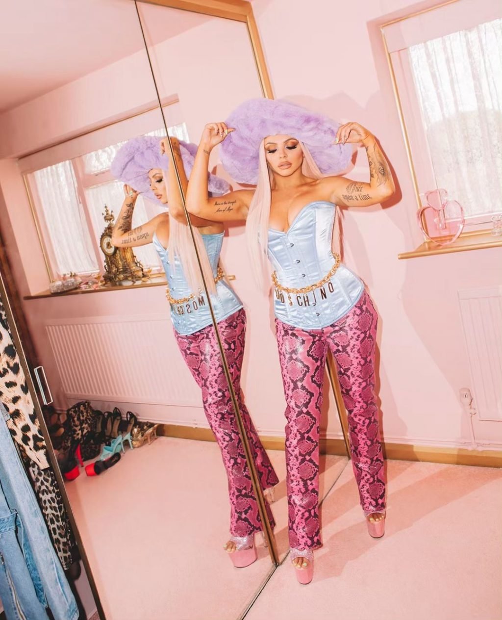 Jesy, 27, estava deslumbrante com calças rosa de pele de cobra, um cinto Moschino e um espartilho azul bebê. Seu cabelo loiro foi complementado com um chapéu roxo peludo. “Você sabe que eu estou tirando” Vita D,” ela escreveu enquanto posava em frente a um guarda-roupa/quarto.
