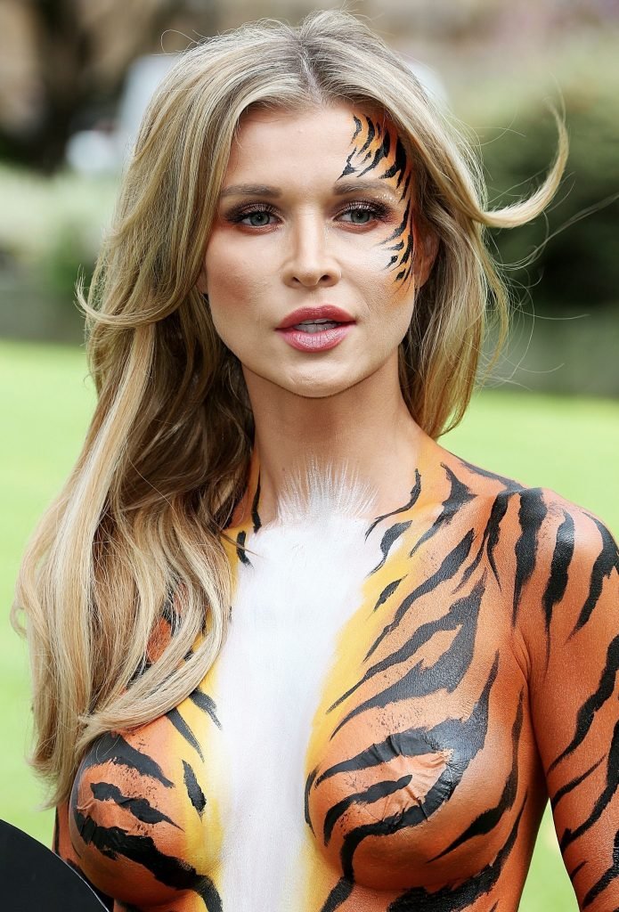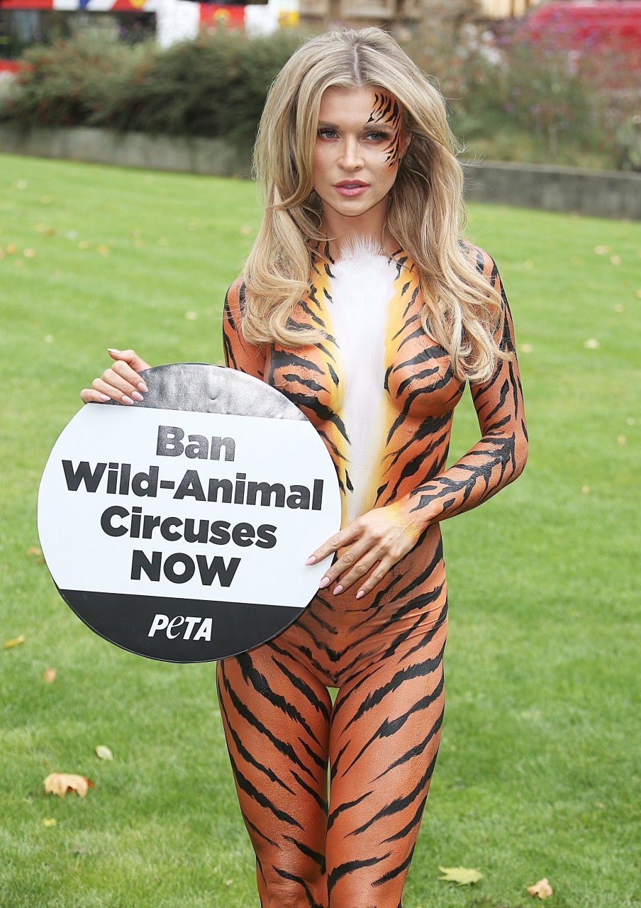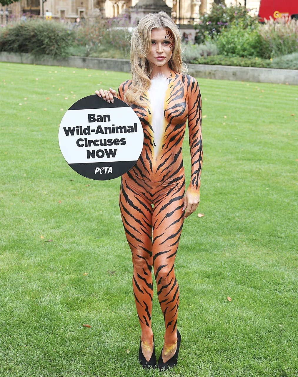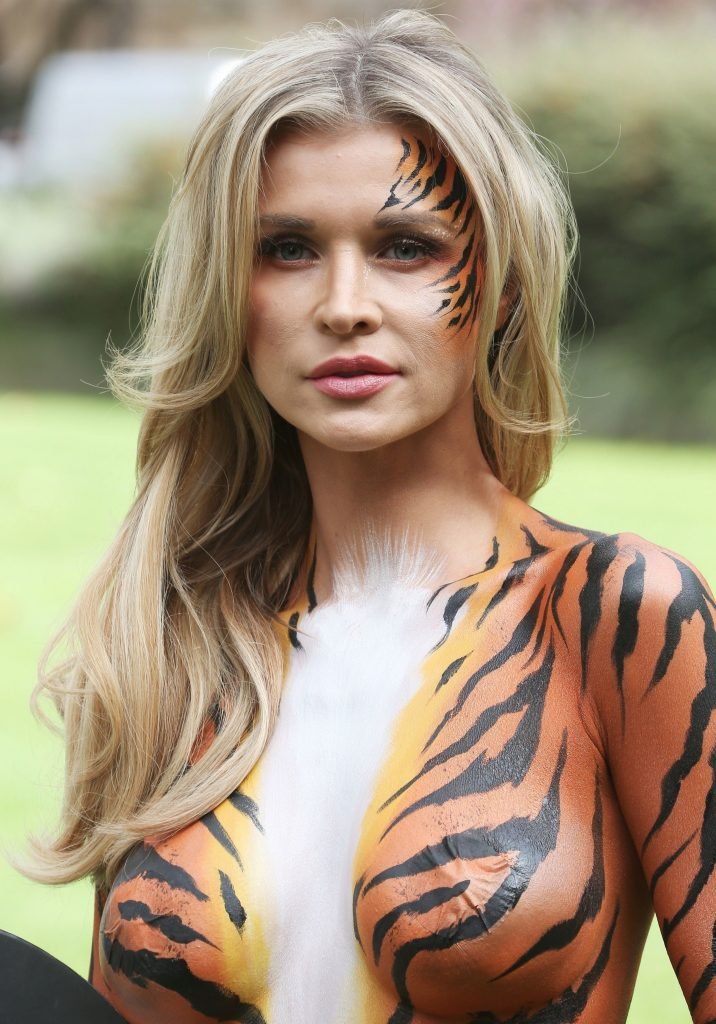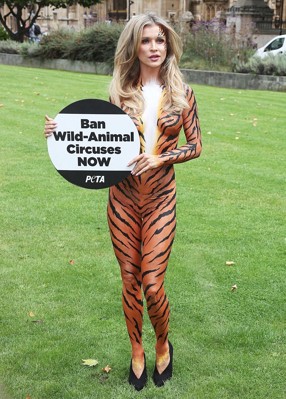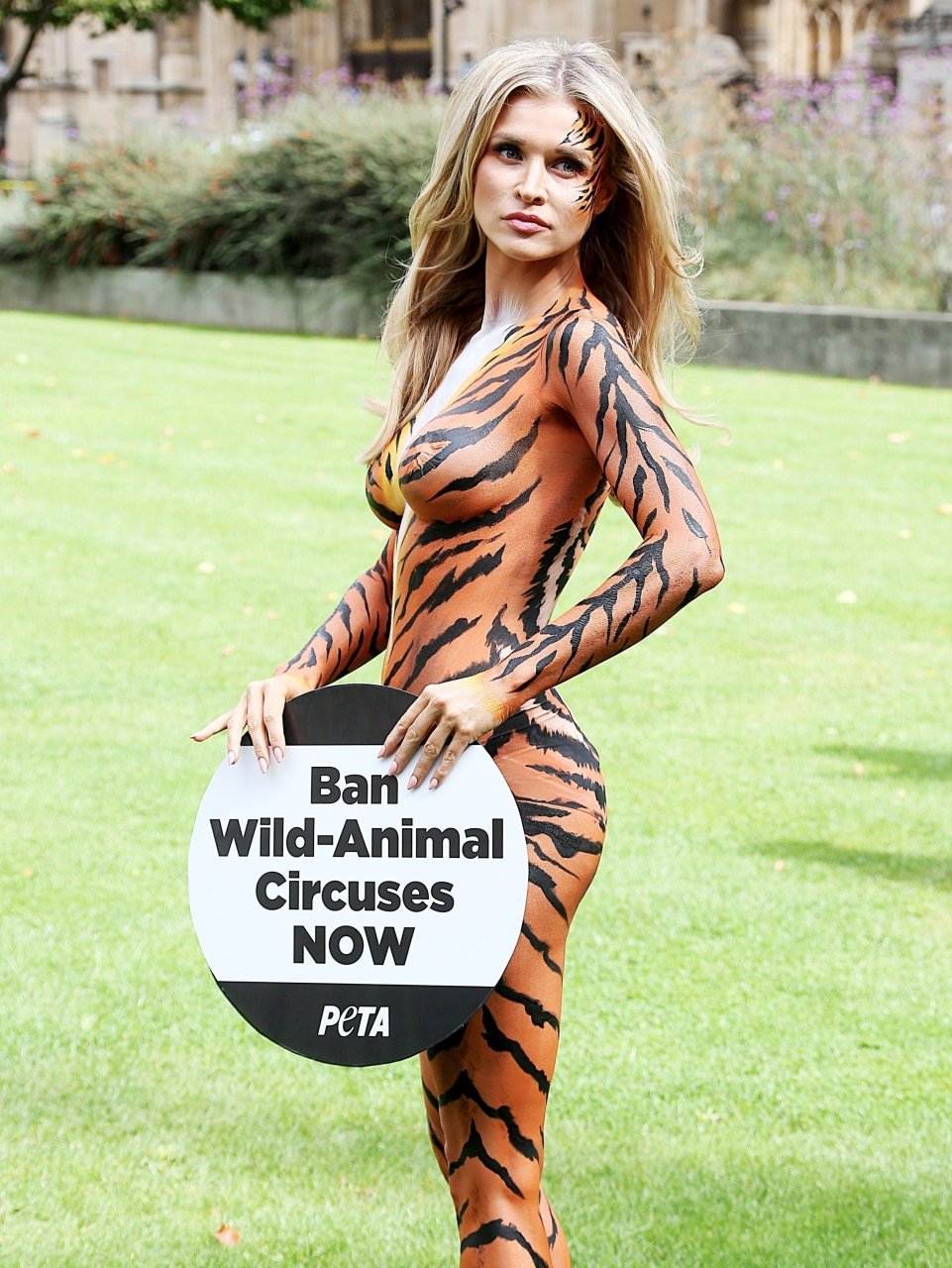 Pintada como um tigre, a supermodelo Joanna Krupa, 38, junta-se à PETA fora de Westminster, Londres, 11/09/2017.