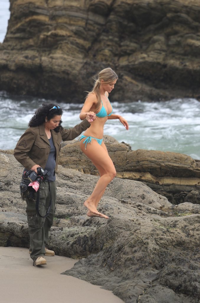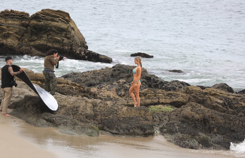 Model e atriz Joanna Krupa (39) deixa seu chamativo anel de noivado em casa, mas exibe seu corpo de biquíni durante um ensaio fotográfico no Dia das Mães em Malibu com Faye Sadou e Malachi Banales, 13/05/2018.