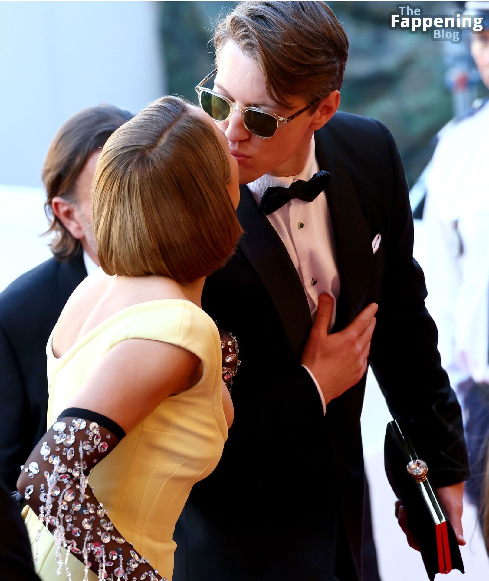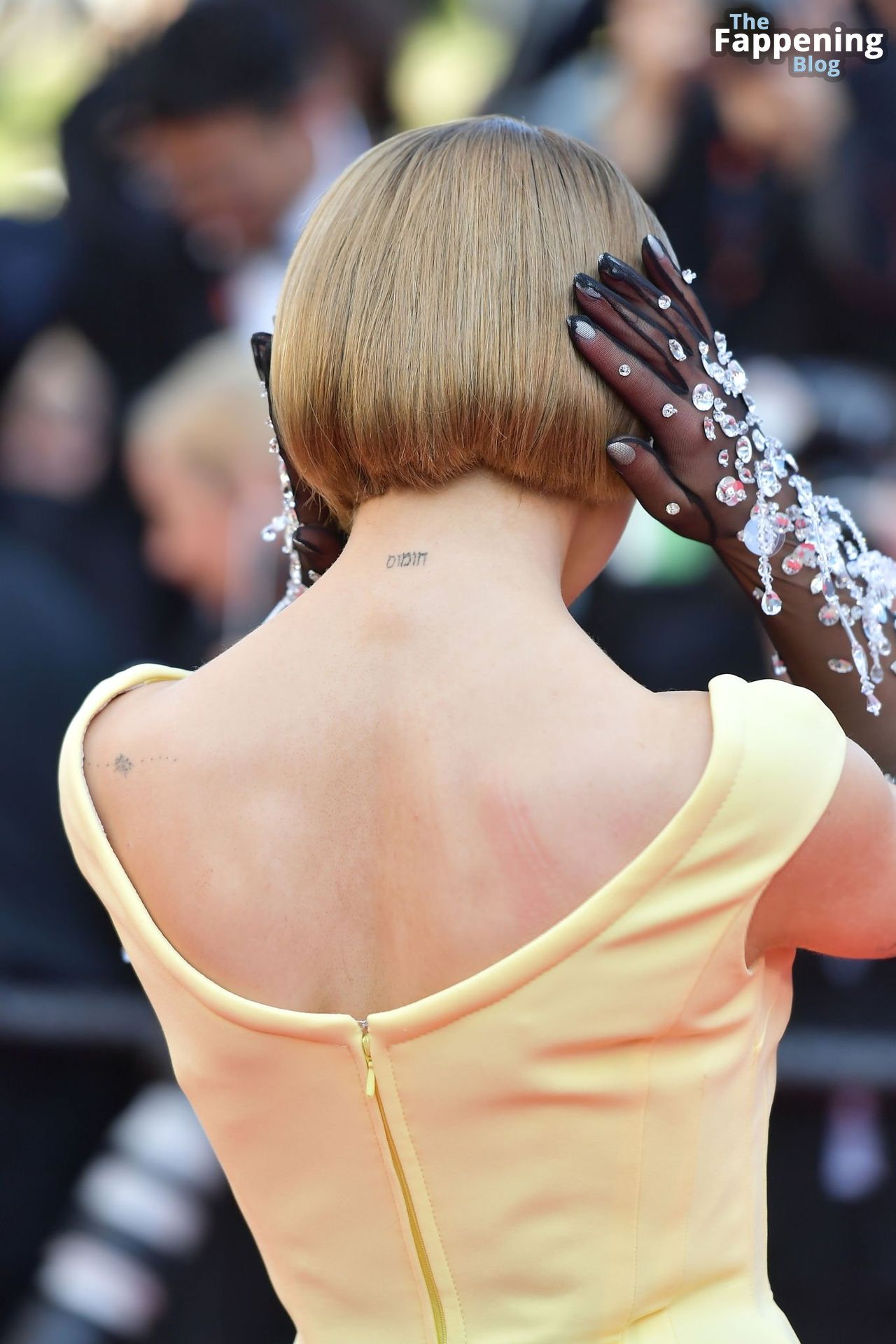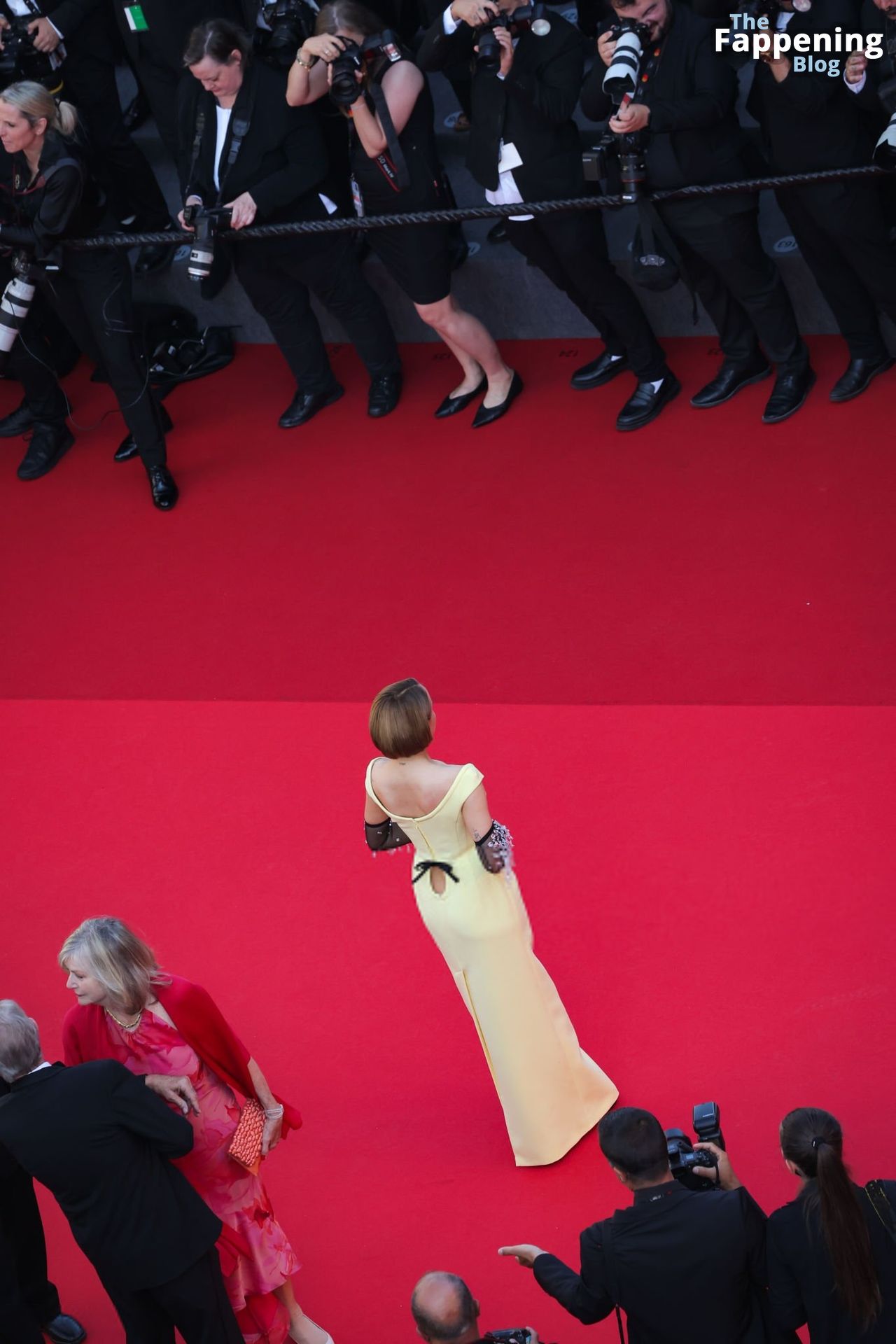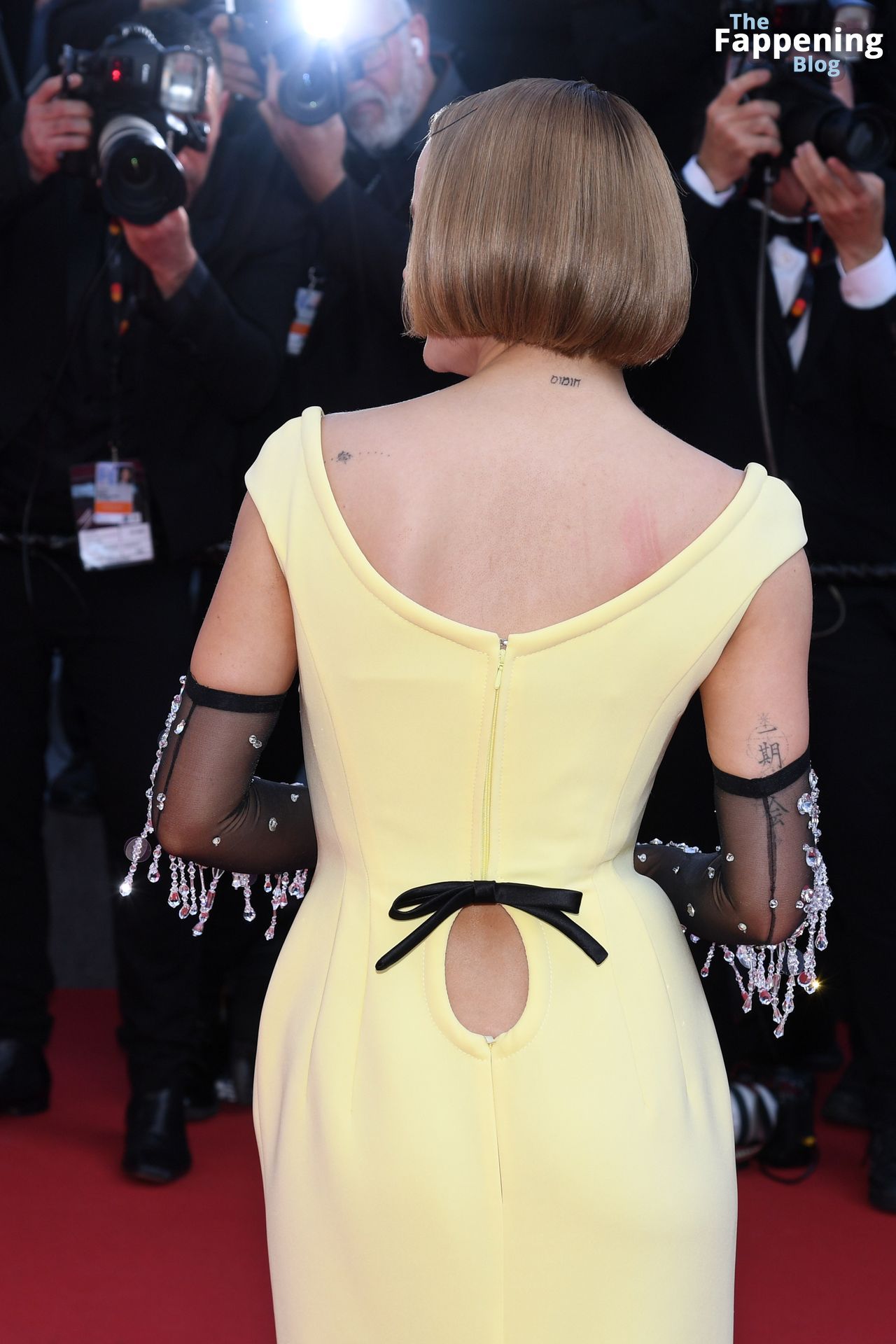 Joey King arrasou na cerimônia de encerramento do 77º Festival de Cinema de Cannes. Ela brilhou no tapete vermelho usando um vestido amarelo incrível da Miu Miu, super justo, que destacou suas curvas e um decote profundo mostrando seus seios volumosos.