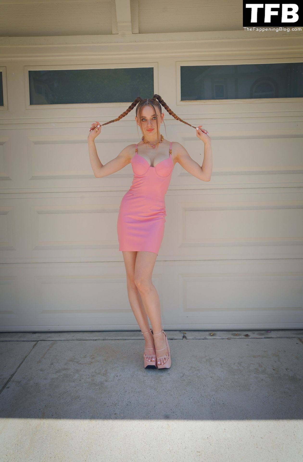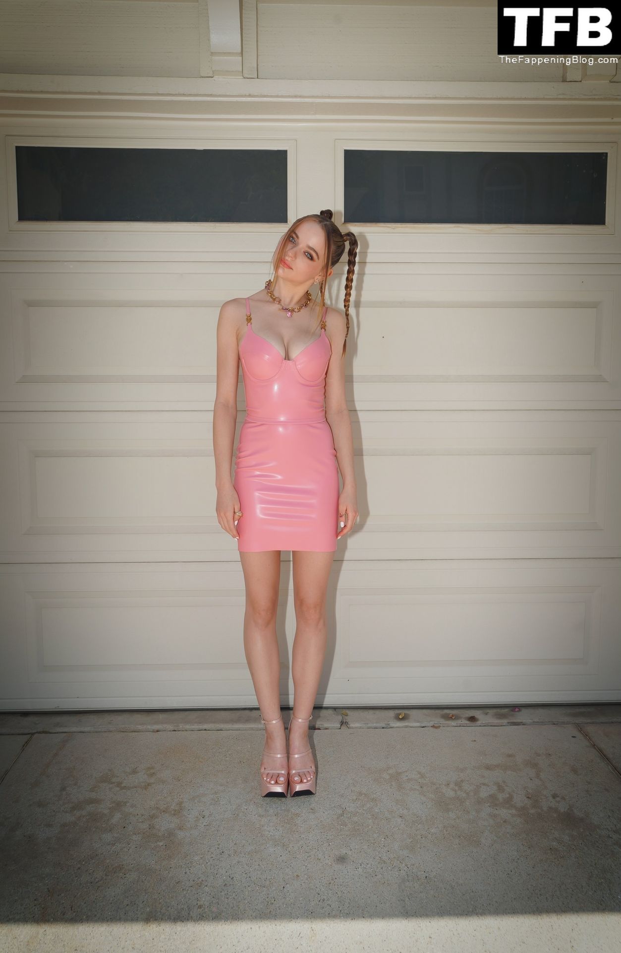A atriz, que acabou de comemorar seu 23º aniversário no fim de semana, usou um look rosa de látex Versace, brincos Hirotaka, anéis Ohliguer e bolsa Selezza London.