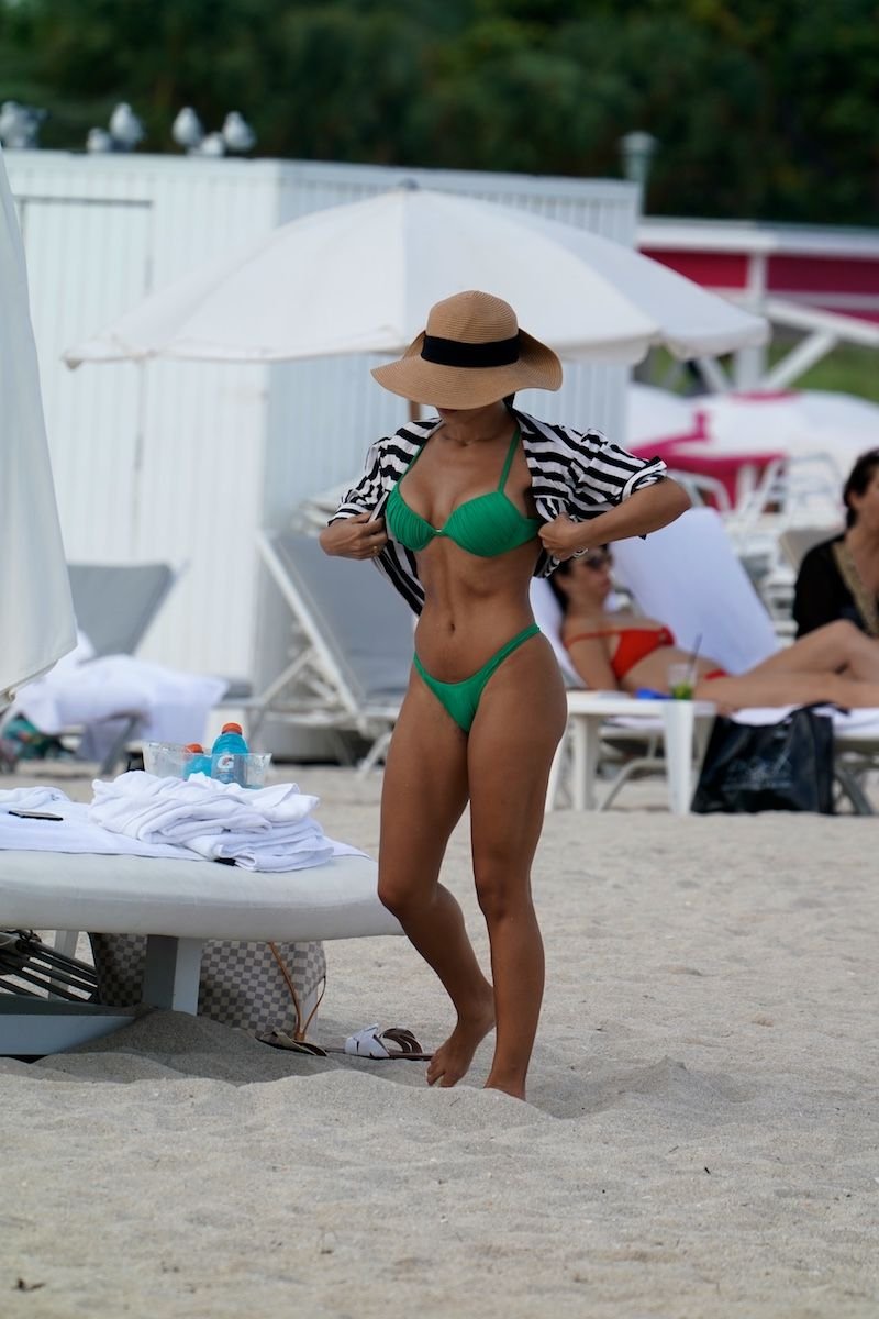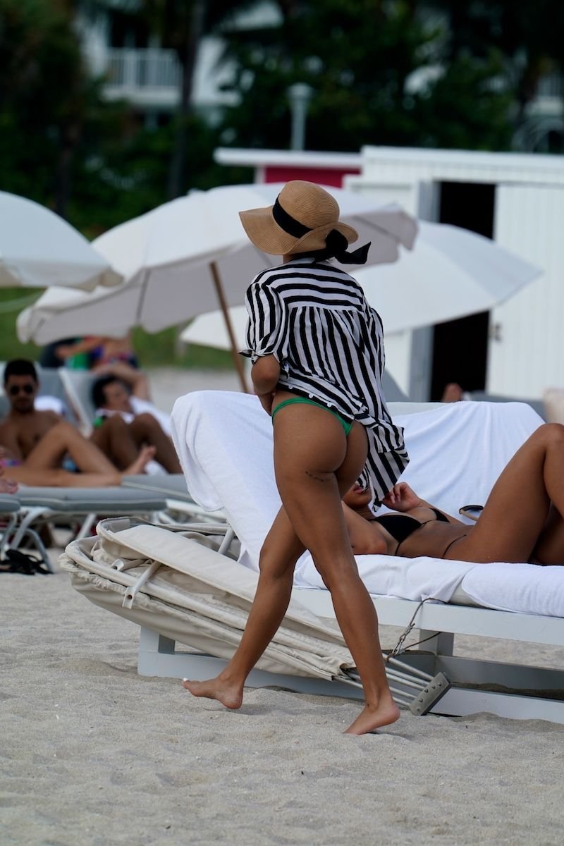 Model Jordan Ozuna, a ex-namorada de Younes Bendjima, mostra a ele o que está perdendo ao desfilar pela praia com um biquíni fio dental verde em Miami, 21/10/2019.