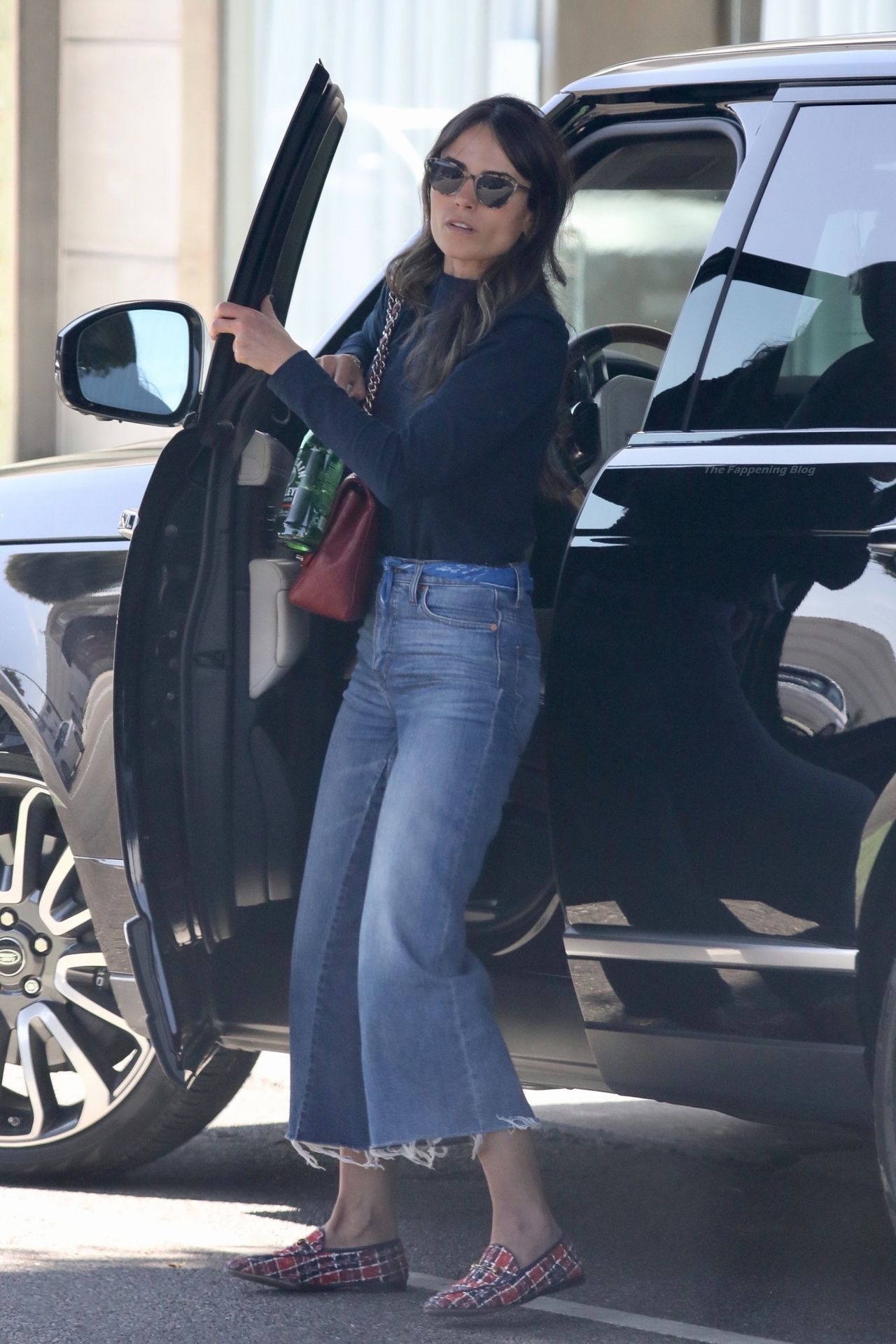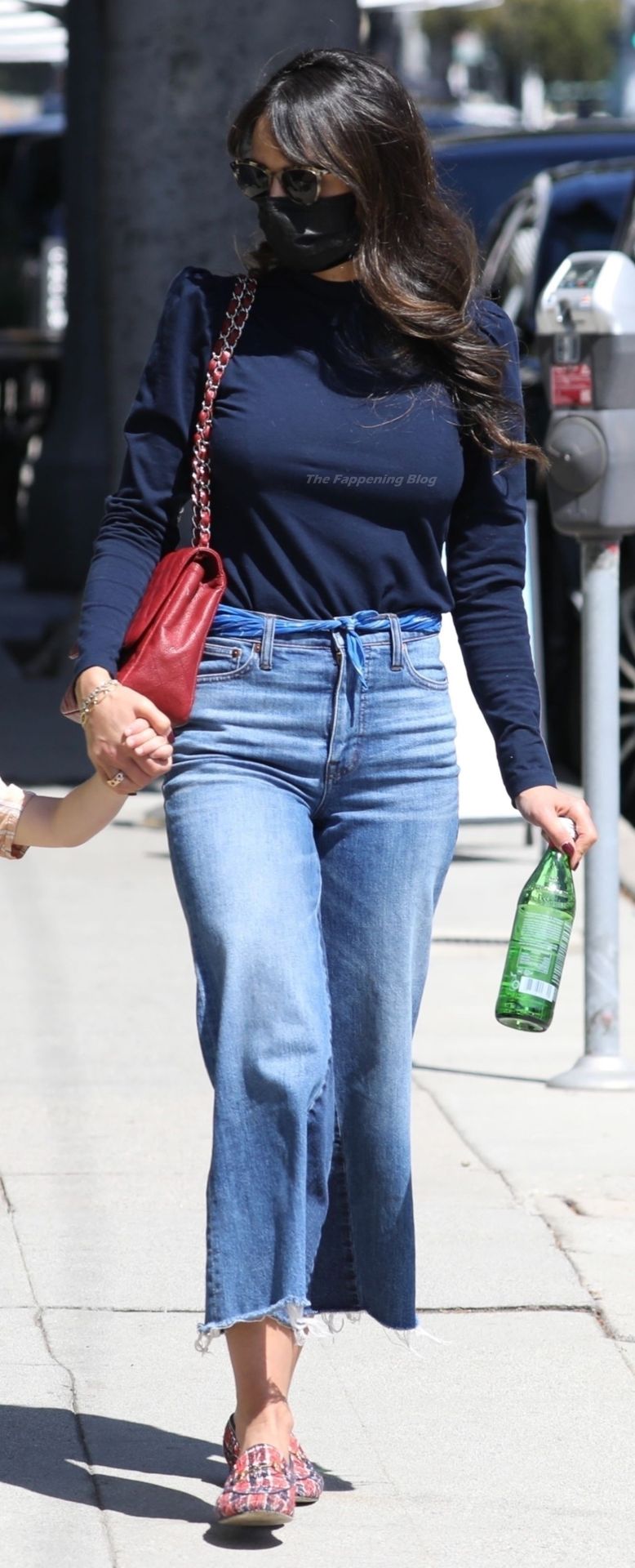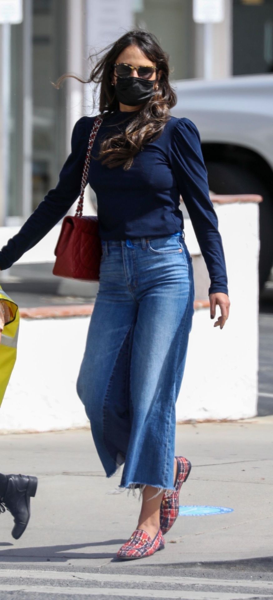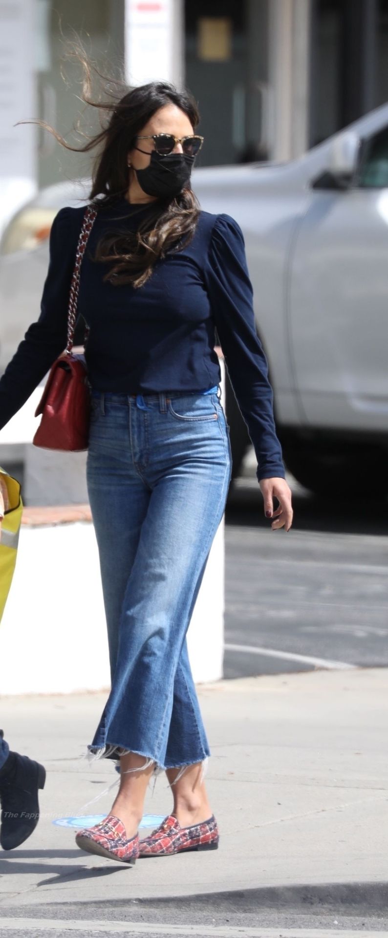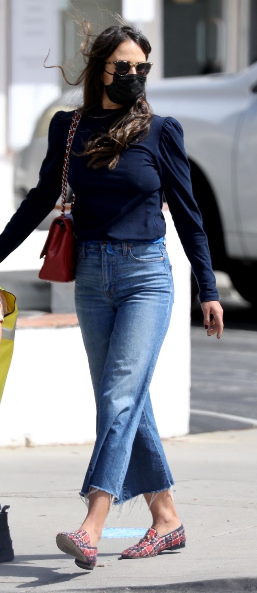 Jordana Brewster foi fotografada fazendo tarefas pela cidade, 17/03/2021. A estrela morena usava uma blusa azul marinho com jeans e sapatilhas coloridas.