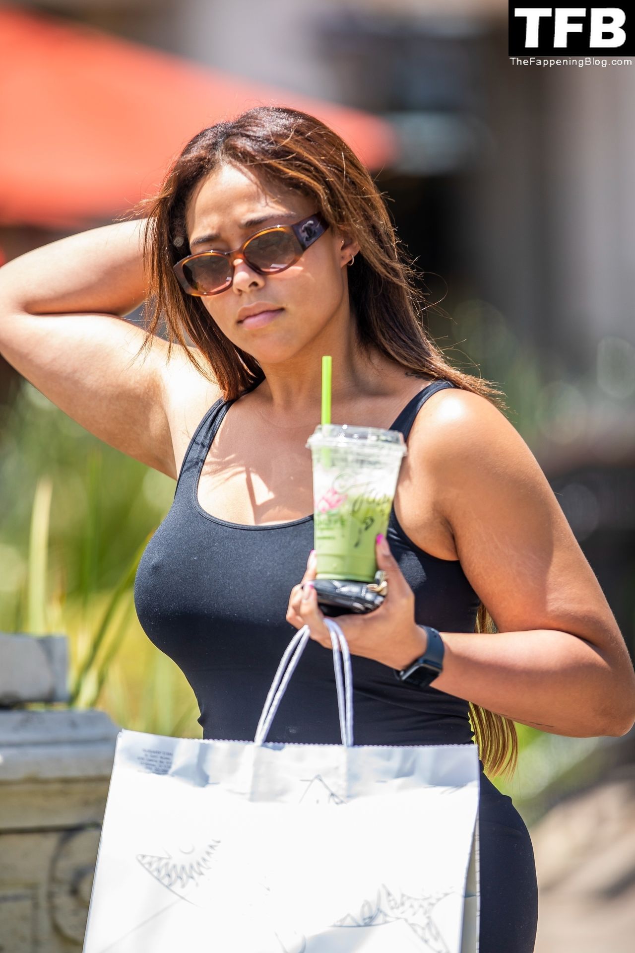 Jordyn Woods foi vista pegando sushi Sugarfish e um smoothie Mystic na Sunlife Organics em Calabasas, 01/08/2022. Ela usava um vestido preto justo durante o passeio solo.