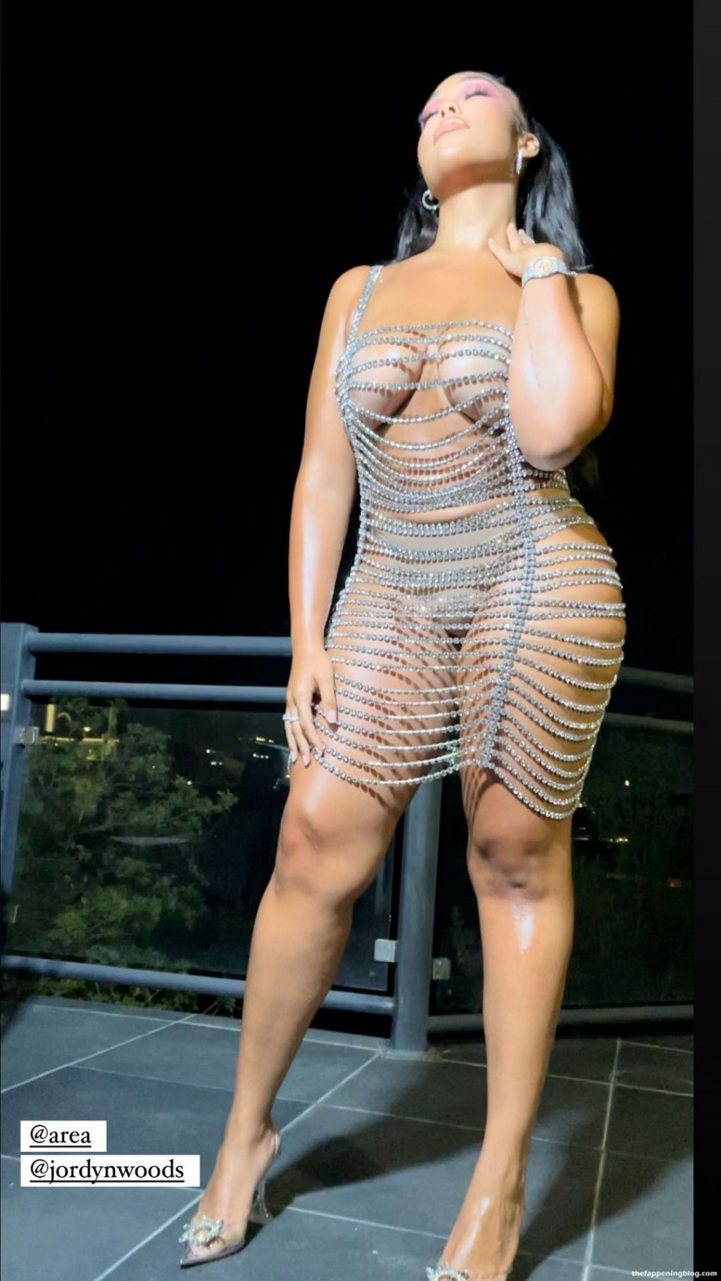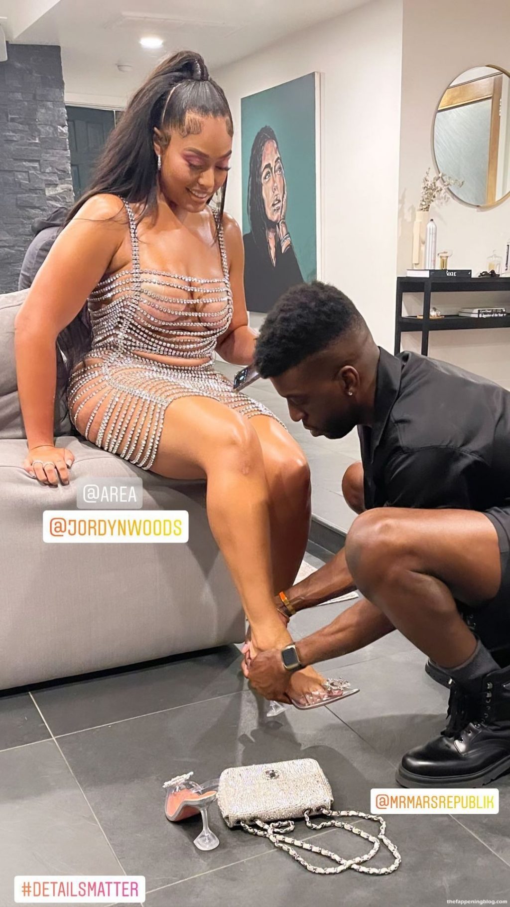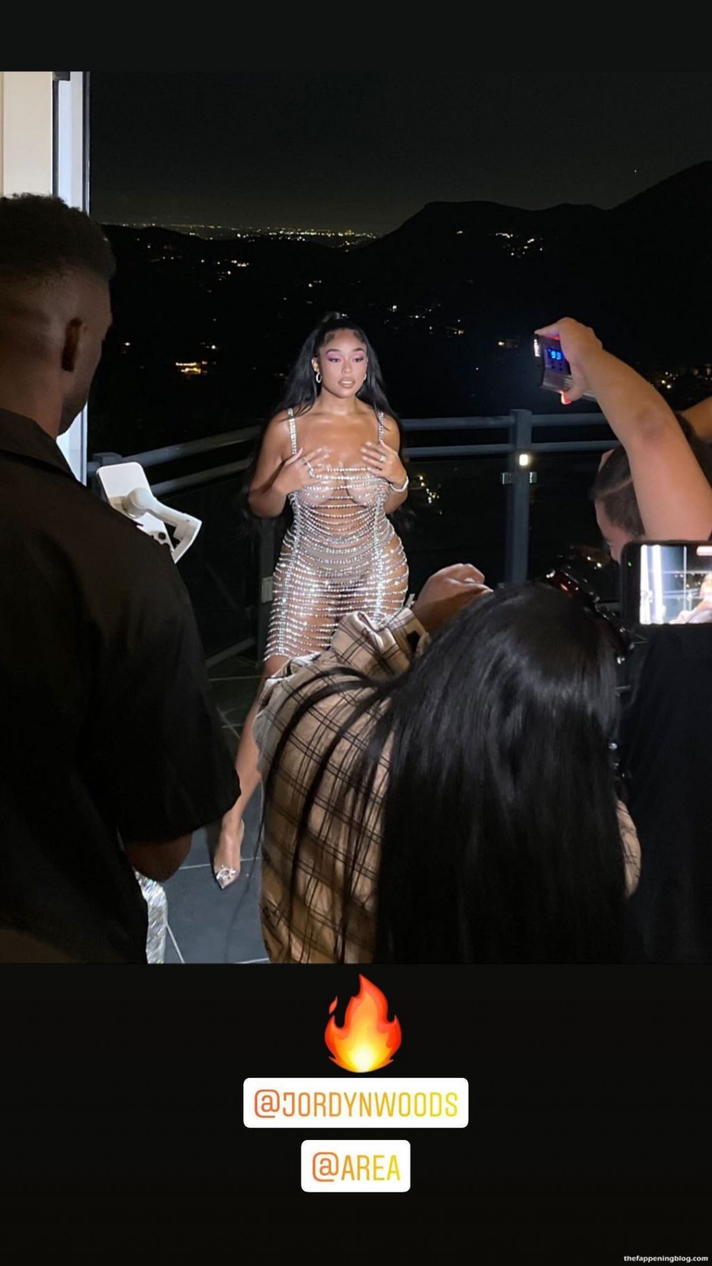 Modelo Jordyn Woods impressiona com um vestido transparente, mostrando seus seios com pasties na festa de aniversário em Los Angeles, 18/09/2021.