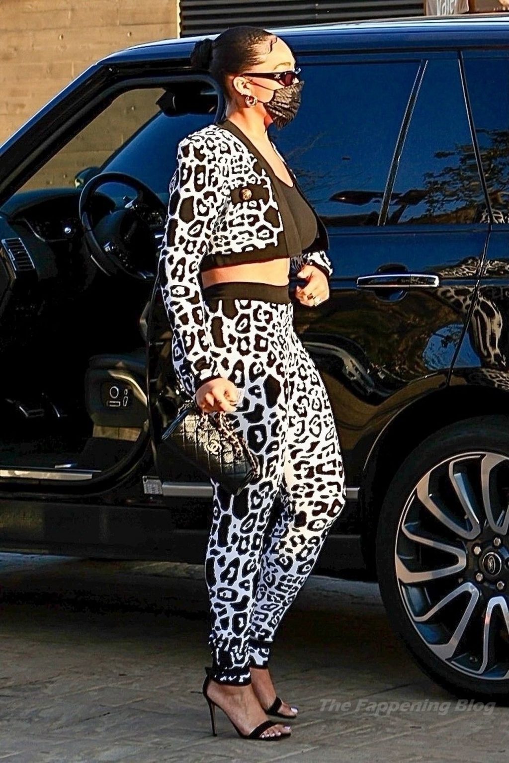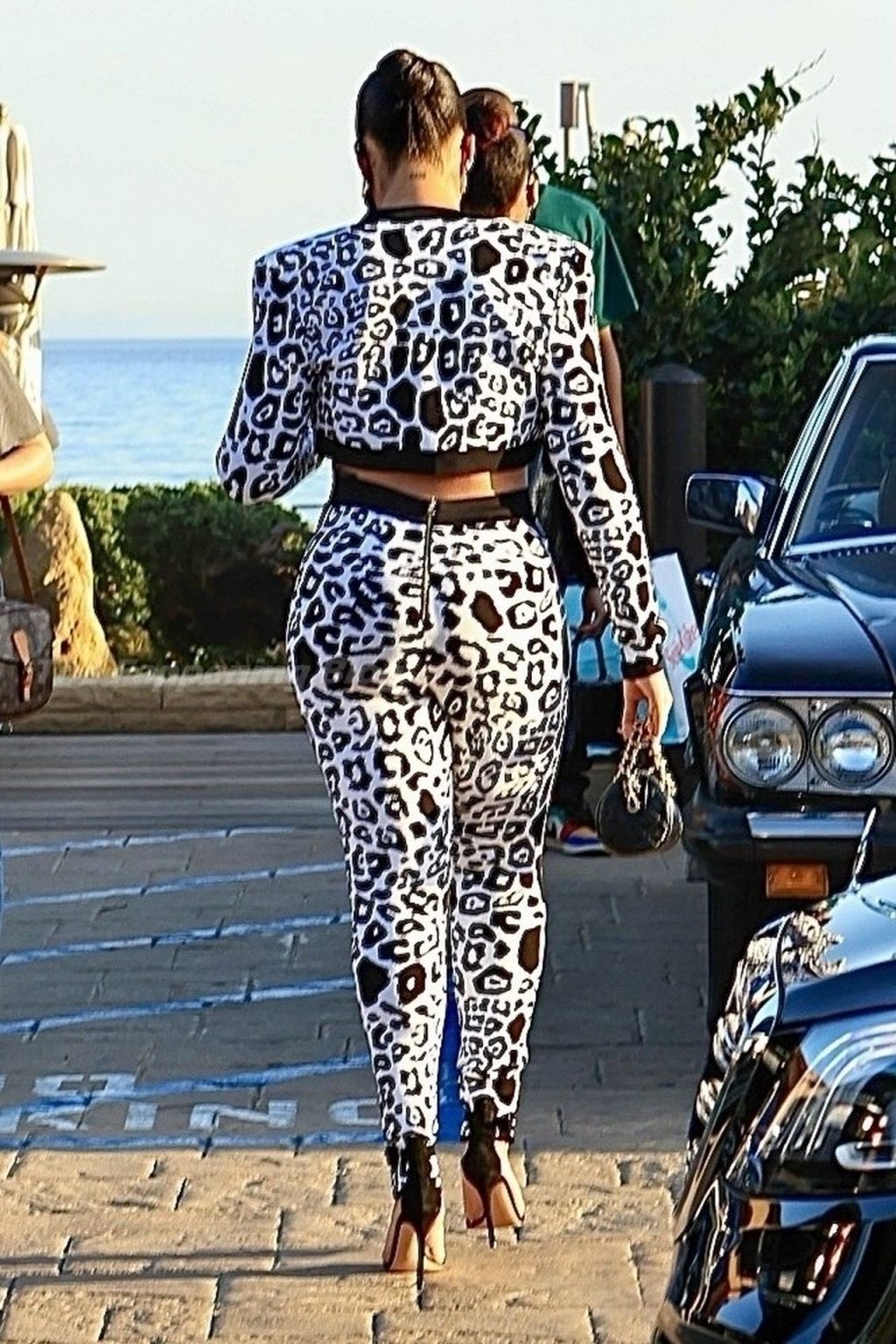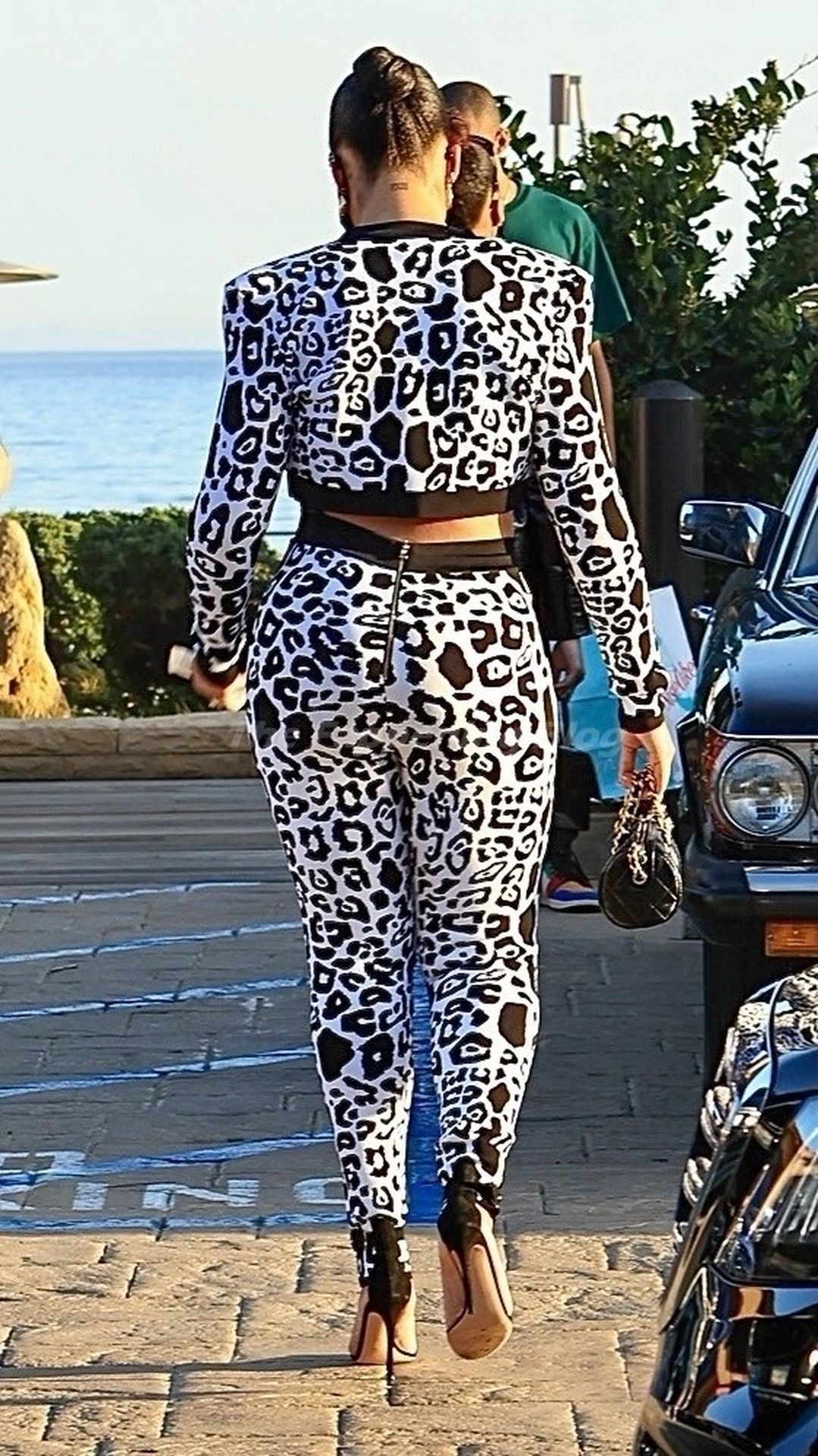 Jordyn exibiu seu corpo curvilíneo em um conjunto de duas peças com estampa de vaca preta e branca, com um top preto transparente, quase sofrendo um problema de guarda-roupa porque é possível ver seu seio, combinado com saltos pretos e óculos Chanel pretos, além de uma bolsa Chanel.
