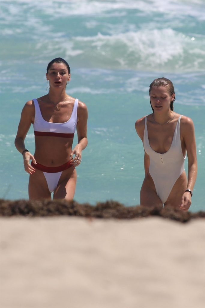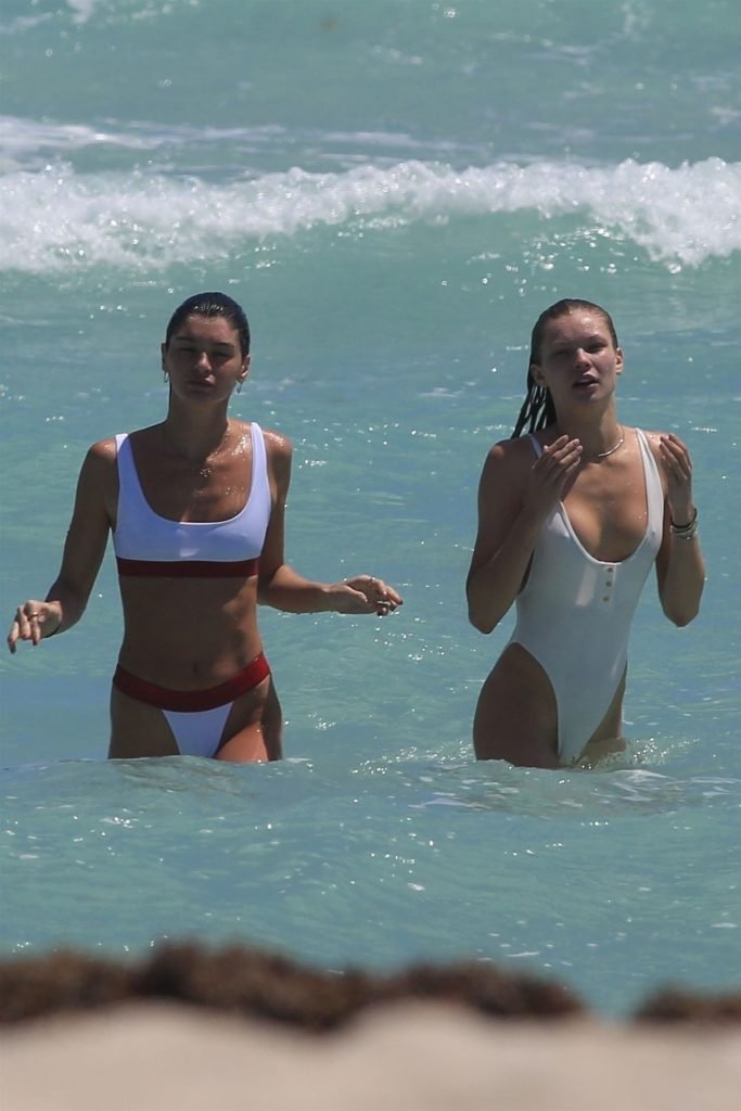 Jovens modelos Josie Canseco e Bella Banos (também conhecidas como Baby Bells) aproveitam um dia na praia juntas em Miami, 28/03/2018. As duas exibiram seus corpos esbeltos e sensuais de biquíni enquanto brincavam no oceano e faziam piadas uma com a outra.